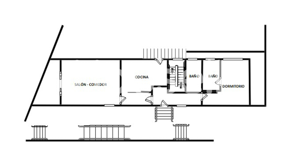 Planta 1ª, primera vivienda, con un comedor, cocina, dos dormitorios y cuarto de baño completo.