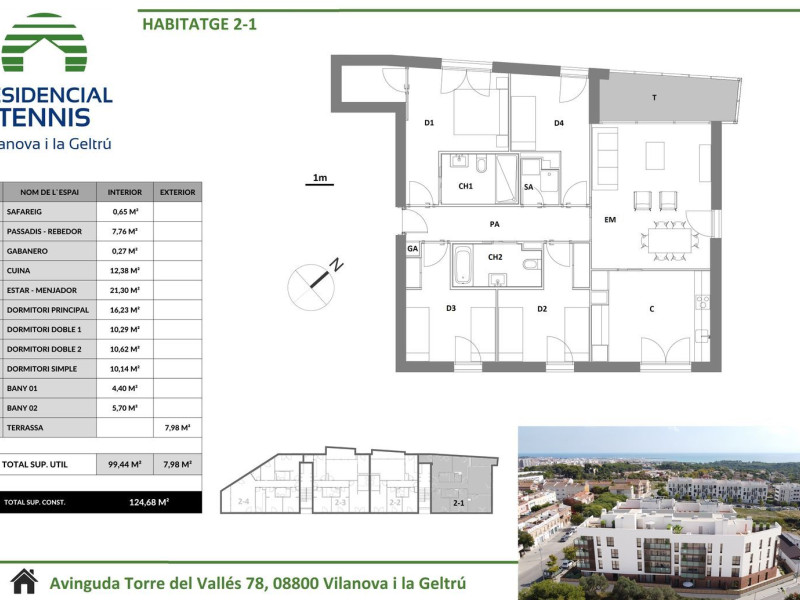 Sitges Quality Developments presenta su nueva promoción exclusiva de viviendas en Vilanova i la Geltrú.Un complejo residencial magnifico de tan solo 16 viviendas que consiste en unidades de 2 a 4 habitaciones, con terrazas y balcones, plantas bajas con jardínes y dúplex con grandes terrazas.El proyecto cuenta con una zona comunitaria con piscina y parking subterráneo.Residencial Tennis se caracteriza por sus excelentes calidades de acabados y sistema de climatización & A. C. S. (tanto en salón como en dormitorios) mediante aerotermia, energía renovable. Es por ello, que esta promoción se convierte en un residencial que apuesta por la sostenibilidad y eficiencia energética.Residencial Tennis, recibe el nombre debido a su ubicación que se encuentra muy próximo a de Tennis Club.Con una ubicación Premium, en una zona tranquila, próxima a colegios, polideportivo y próximamente a una importante cadena de supermercados y con fácil acceso desde la autopista C-31.