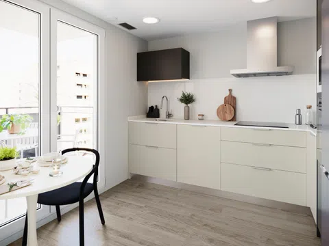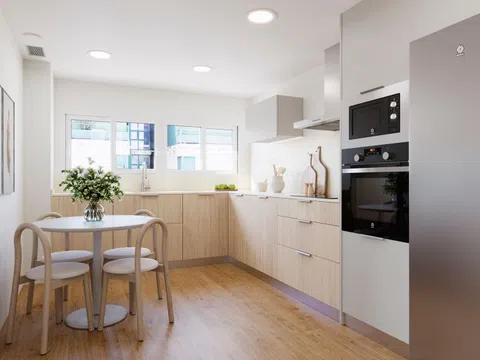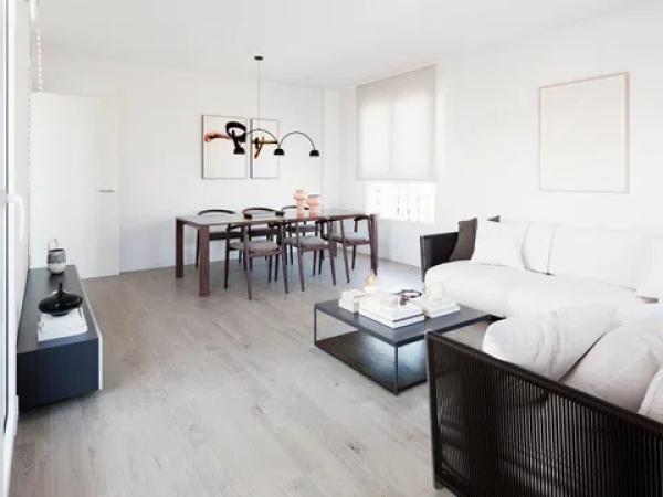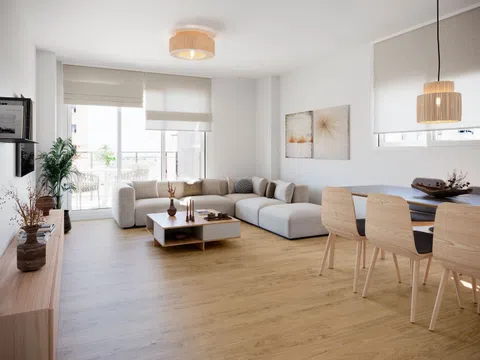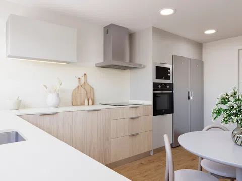 Łazienki są całkowicie wyposażone, z meblami łazienkowymi i lustrem, prysznicem z brodzikiem oraz przeszkloną kabiną prysznicową z elementami wykończonymi na chrom. W sypialniach znajdują się zabudowane szafy z półkami, szufladami i drążkami na ubrania według projektu. Oświetlenie LED, zarówno wbudowane, jak i montowane powierzchniowo, rozjaśnia całe mieszkanie, poza dekoracyjnymi lampami. Bez dodatkowych kosztów można wybrać różne opcje podłóg, okładzin ściennych i wykończenia mebli kuchennych.