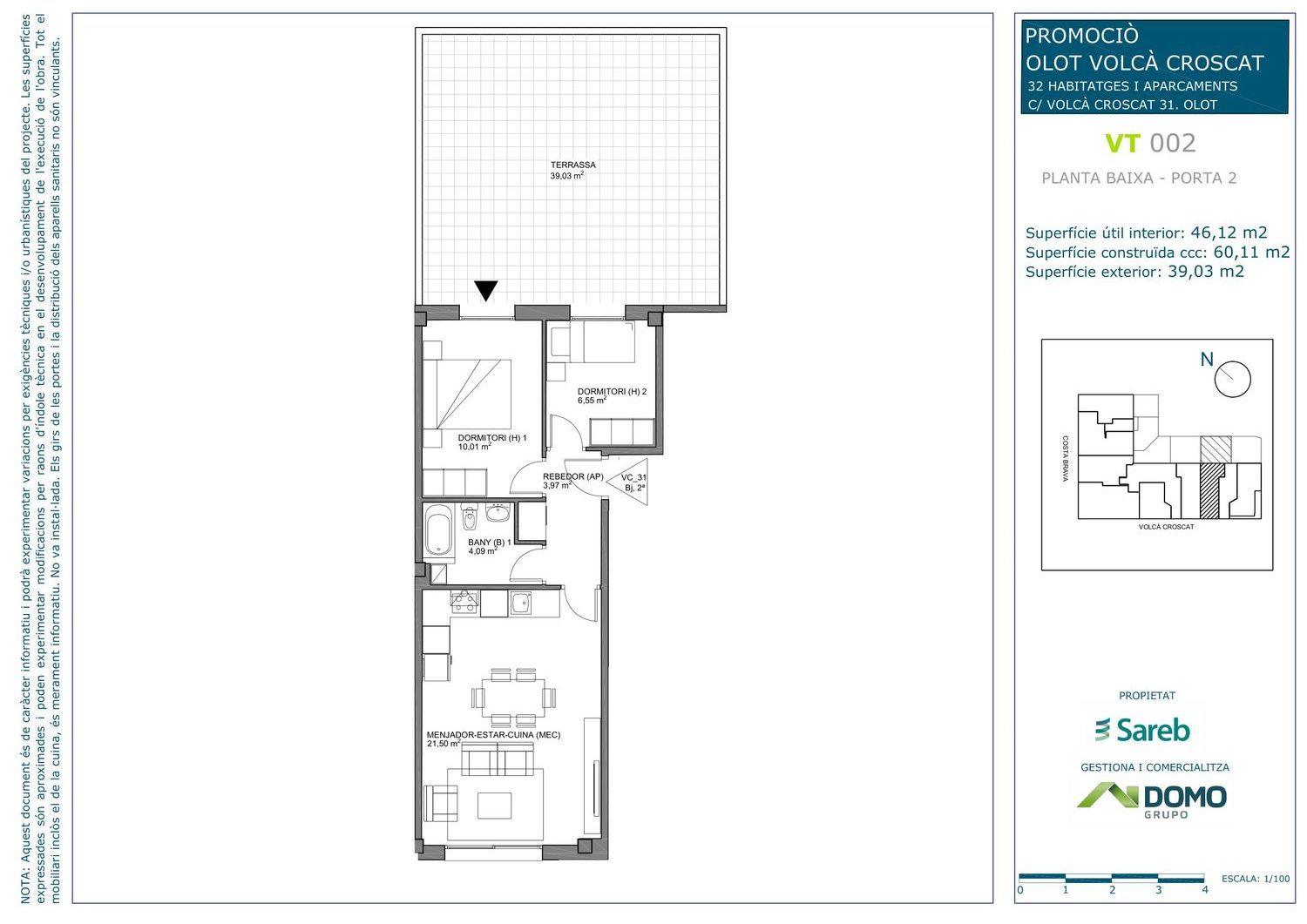 Pisos de 1, 2 y 3 Dormitorios de obra nueva en Olot – Girona.Promoción de obra nueva que consta de 32 viviendas en altura y 48 plazas de garaje, situada en el carrer Volcà Croscat de Olot (Girona).El edificio cuenta con planta baja, 3 plantas sobre rasante y 2 plantas sótano. El proyecto se plantea como una urbanización cerrada en la que los bajos dispondrán de terraza privada.Ofrece una amplia variedad de viviendas de 1, 2 y 3 dormitorios, con terrazas o balcón en función de la tipología. Es un edificio ubicado en un entorno tranquilo y bien conectado. Las superficies de los pisos van de una media de 52 m2 construidos en el caso de los de 1 dormitorios a una media 100 m2 en los de 3 dormitorios.Todas las viviendas de 2 dormitorios incorporan una plaza de garaje vinculada con un precio adicional de 11.500 € + IVA y 2 plazas de aparcamiento las de 3 dormitorios.Olot es uno de los municipios más importantes de Cataluña y nuestra promoción tiene una localización céntrica y bien comunicada.Es un municipio moderno, adecuado a las necesidades de nuestro tiempo, con una amplia oferta de servicios públicos y privados en todos los ámbitos: educativo, cultural, deportivo, de ocio… Dispone de una buena red de comunicaciones: carreteras, autopistas, líneas ferroviarias (R2 y R3) y diversas líneas de autobuses urbanas e interurbanas.El tiempo de trayecto en coche hacia los grandes núcleos urbanos son: Ripoll (40 min) Vic (40 min) Girona (50 min).Hay gran variedad de supermercados de cercanía y el hipermercado "Mercadona" se encuentra a 900 metros. Hay diversos colegios e institutos públicos, como "Colegio Público Volca Bisaroques" que se encuentra a 300 metros. El centro de atención primaria "Garrotxa" se encuentra a 2 km y el ayuntamiento del municipio está a 1,5 km.Olot también es especialmente conocido por sus lugares de interés natural ya que todo su término municipal se encuentra dentro del parque natural de la Zona Volcánica de la Garrocha. También despierta un gran interés el Hayedo de Jordà (Reserva natural que comprende un bosque de hayas de características únicas).Ponte en contacto con nosotros para ampliar información o reservar vivienda ( o ). También puedes pinchar en el enlace de nuestra página Web y dejarnos tus datos, para ponernos en contacto contigo.
