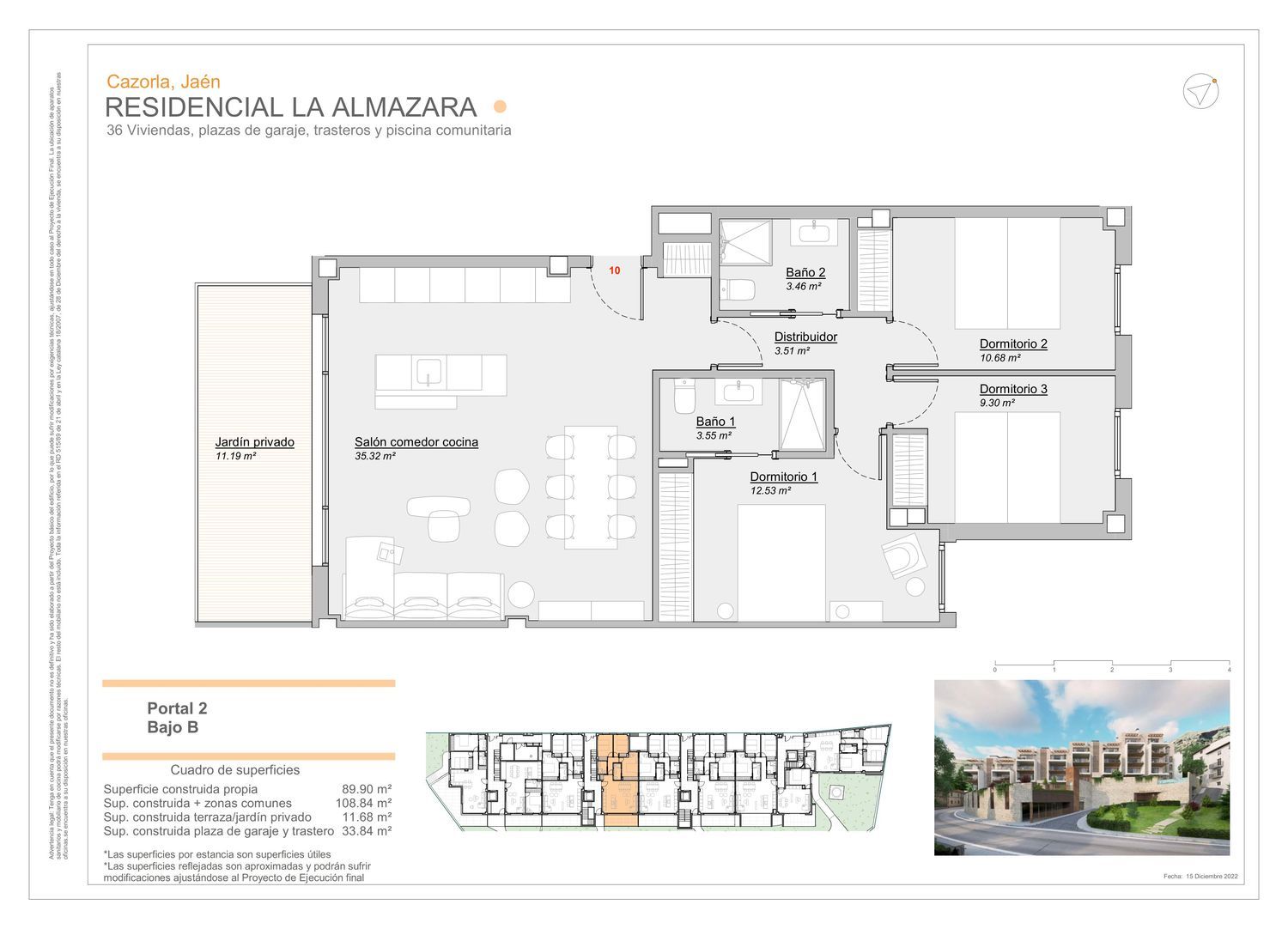 “La Almazara” residencial en el centro de Cazorla. Ubicada en un solar emblemático de 2500 m2, frente al Parque del Santo Cristo, 36 viviendas, en un entorno irrepetible, zonas verdes, piscina, gimnasio, garaje, trastero.Terminaciones de lujo:Puerta de entrada a vivienda de seguridad lacado por el interior a juego con las puertas interiores.Puertas de paso lacadas en color blanco, pantografiadas y herrajes acabados en acero inoxidable.Puertas correderas de paso con guías tipo Klein o similar, topes y demás elementos auxiliares.Armarios empotrados modulares con puertas abatibles, lacado en color blanco, barra de colgar y balda para maletero. Tiradores acabados en acero inoxidableCarpintería exterior de aluminio lacado con rotura de puente térmico y altas prestaciones, abatible o corredera según zonas.Persianas de aluminio color igual que la carpintería y con aislamiento inyectado.Doble acristalamiento tipo Climalit, con vidrio aislante de control solar hacia el exterior de la vivienda, formado por vidrio de 4 mm de espesor, cámara de aire de 16mm y vidrio de 6mm. Este vidrio reduce hasta en un 40% las pérdidas de calor en invierno y la ganancia de calor en verano.Terrazas con barandillas de aluminio con vidrio laminar de seguridad a media altura, que aportan a la vivienda amplitud y luminosidad.Pavimentos y alicatados en primeras calidades. Agua caliente sanitaria (aportación), mediante aerotermia con producción de agua caliente sanitaria mediante caldera individual de gas natural de alto rendimiento energético (de condensación).Instalación de calefacción por suelo radiante, tubería de agua y termostato programable digital ubicado en salón. Mayor rendimiento energético de todo el sistema y ahorro de costes.Instalación eléctrica con grado elevado, de electrificación, conforme al Reglamento Electrotécnico de Baja Tensión.ENCLAVE MONUMENTAL, PARAISO NATURALCazorla, guardada por dos castillos: el de las Cinco Esquinas, resto de una antigua fortificación; y el de la Yedra, de orígenes romanos que alberga en la actualidad el Museo de Artes y Costumbre del Alto Guadalquivir, ha inspirado a narradores, poetas, artistas y gentes de farándula.Esta Cazorla de leyenda…. “aquí nace el Guadalquivir que muere en Sanlúcar”, resistente el embate del crecer desmesurado. Su casco urbano conserva un ambiente y arquitectura tradicional, albergando un importante legado monumental.“La Almazara” se encuentra en un enclave difícilmente comparable, en la antigua Almazara Santa Emilia, fundada en 1893, de ella solo conservamos su chimenea. Ubicada junto a la alameda conocida como el Cristo donde existía una ermita, hoy desparecida, Ermita del Cristo de la Vera Cruz, en la actualidad Paseo del Santo Cristo, junto a uno de los edificios más emblemáticos de la ciudad, el Palacio de la Casa de las Cadenas.Vía de entrada al parque natural de Cazorla, Segura y las Villas. La enorme riqueza de su fauna y flora, sumada a su increíble atractivo paisajístico hacen de la sierra un auténtico paraíso para el disfrute de la naturaleza.Sus habitantes gozan de un entorno natural, privilegiado para la salud corporal, nutrida de fuentes y paseos, por brisas refrescantes en verano y abrigo entre cumbres de invierno.Disfrute y sumérjase en lo mucho que le ofrece el día a día de esta ciudad. Exposiciones, prácticas deportivas centradas en la naturaleza y una oferta cultural impresionante: Festival Internacional de Teatro(FIT), Festival de Blues de Cazorla…Sea propietario de un trozo de historia de esta ciudad, Cazorla.