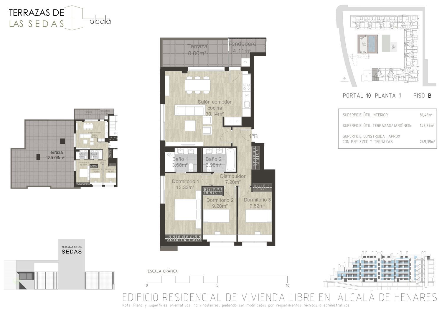 Terrazas de las Sedas, promoción de 133 viviendas ubicada en Las Sedas, Alcalá de Henares.Esta promoción incluye viviendas de 2, 3 y 4 dormitorios con terraza, así como una gran cantidad de Áticos y bajos con grandes terrazas y jardines. Las viviendas de esta promoción destacan por su luminosidad y ventilación, gracias al hecho de ser pasantes y tener varias orientaciones. El precio de la vivienda incluye una plaza de garaje y un trastero. Hay opción de comprar una segunda plaza de garaje por 11.500€. El edificio destaca por su arquitectura aterrazada y su fachada ventilada de piedra, combinada con balcones acristalados, dejando espaciosas zonas comunitarias, entre las que destacan la piscina con un jardín de césped natural, pista de pádel, zona de juegos infantil, gimnasio equipado y sala de co-working equipada. Un montón de jardineras por todas las zonas comunes, que ayudan a dar intimidad y a refrescar el ambiente. Las Sedas se sitúa al norte del término municipal de Alcalá de Henares. Este proyecto cierra el perímetro de la ciudad, interconectando su periferia con el casco urbano, Universidad de Alcalá, Hospital Príncipe de Asturias, Centro Deportivo del Atlético de Madrid… Con las mejores conexiones, por trenes de cercanías y autovías. A 5 minutos del Centro de Alcalá, 14 minutos del aeropuerto y a 24 minutos del centro de Madrid. En Las Sedas la vida se moverá entre zonas verdes, senderos urbanos y puntos de cohesión vecinal y su gran plaza.