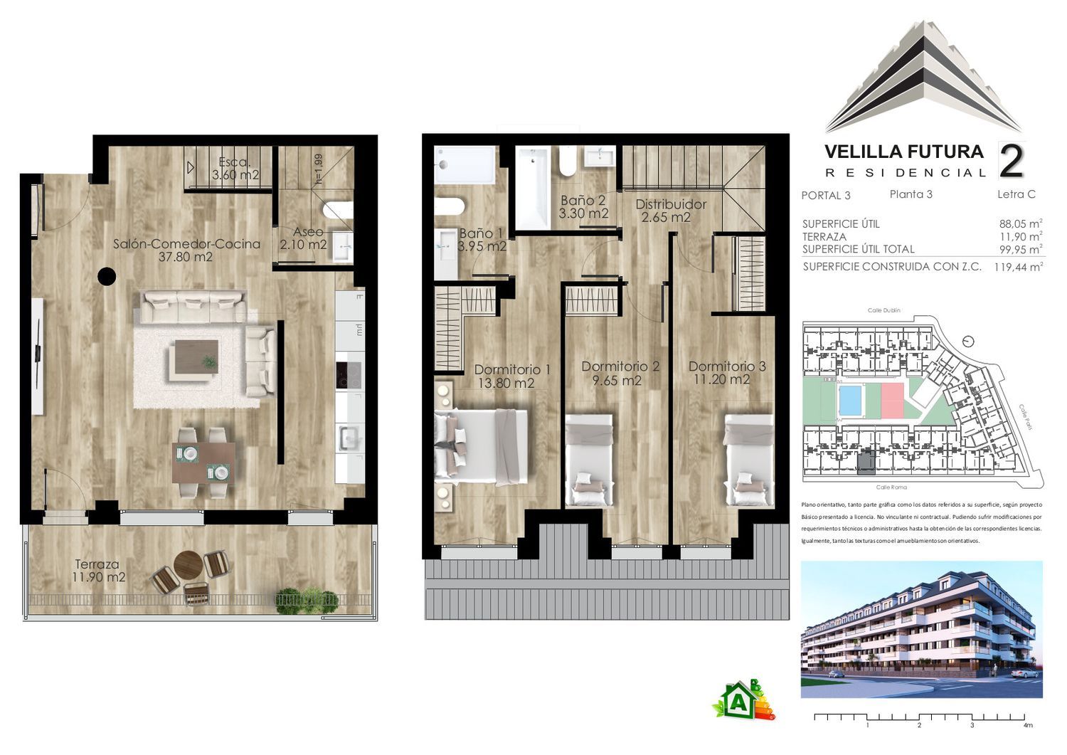 Bienvenidos a RESIDENCIAL VELILLA FUTURA. En nuestro nuevo proyecto (fase 2), apostamos por viviendas: espaciosas, confortables, sostenibles y a tu alcance, integradas en una urbanización con todos los servicios que permiten ser un espacio para la convivencia y en un edificio con estilo, diseño y personalidad propia.Las viviendas tendrán calificación energética A (la máxima), lo que supondrá un importante ahorro en la factura de electricidad y calefacción, además de un ahorro también en los tipos de interés que aplican las entidades financieras al contratar una hipoteca.A destacar el doble aislamiento acústico y térmico en las viviendas, además de estar dotadas con un sistema de suelo radiante refrescante (para calor y frío), lo que ahorra espacio al eliminar los radiadores e implica también un menor consumo energético, siendo más sostenibles. Las ventanas son de PVC con doble acristalamiento tipo climalit y rotura de puente térmico. Las viviendas incorporan también un sistema de ventilación mecánica individual, consistente en la renovación del aire interior de la vivienda adaptándose automáticamente a la tasa de humedad y/o la presencia de ocupantes.Las viviendas dispondrán de armarios empotrados, además de cocina amueblada compuesta por muebles altos y bajos de gran capacidad con encimera y equipada con fregadero, grifo con dispositivos aireadores para reducir los consumos, horno, microondas, placa vitro-cerámica de inducción y campana extractora.Todas las viviendas tienen terraza. En el precio se incluyen una plaza de garaje y trastero.La promoción dispone de amplias zonas comunes con:-Local Social multiusos.-Piscina con amplia zona de solarium.-Cabina de control de conserjería, zona ajardinada y área de juegos infantiles.