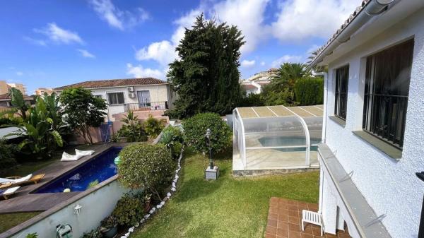 casa familiar independiente de 137m2 de 3 dormitorios y 3 baños, en una parcela de 515m2. con piscina privada, y cubierta tiene su jardin privado. un garage de 40m2 por poner 2 coches. en el nivel calle, bajo, se encuentra un grande dormitorio, con aere acondicionado, el salon comedor, y la cocina, y su baño. el la planta uno, se encuentra 2 dormitorios y 2 baños mas una habitacion que se podria transformar en dressing, vestuario. una terraza cubierta y acristalada. estamos en una zona muy tranquila, residencial, a 2 minutos del lidl, 3 minutos de la playa, 5 minutos del puerto de benalmadena. muy buena ubicacion, conexion a la A7 a unos minutos. 10 minutos del aero puerto de malaga. la casa es de solide construcion, necesita restauracion porque tiene sus annos, ha sido construida en 1974.