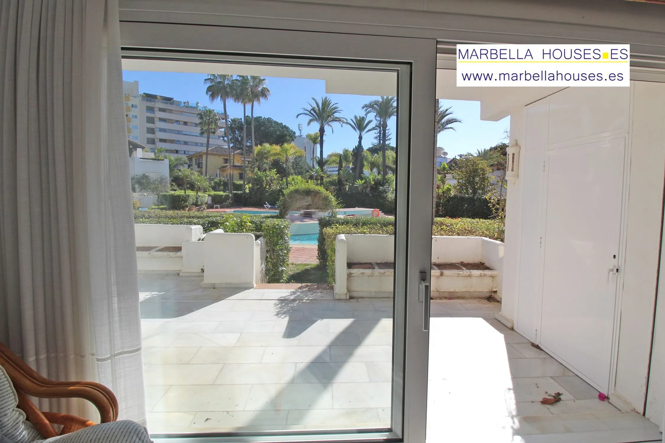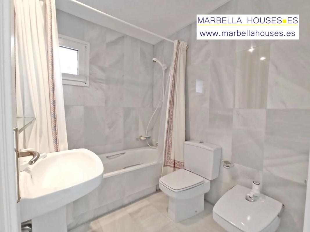 Fantástico y amplio apartamento en la exclusiva Milla de Oro y a menos de 5 minutos andando de la playa, paseo marítimo y todos los servicios de la ciudad. Urbanización con bonitos jardines tropicales, piscina y varias plazas de aparcamiento descubierto. El apartamento consta 2 dormitorios dobles, 2 baños, gran salón comedor con salida a la gran terraza. Esta con acceso directo a la piscina y jardines lo que es muy cómodo para familias con niños y personas mayores. La terraza es bastante privada por la vegetación que la rodea y muy soleada por su orientación Sur y Este, sol de mañana y tarde. El dormitorio principal muy amplio con baño ensuite, armarios empotrados y salida directa a la terraza. El segundo dormitorio también doble, con armarios empotrados y orientado al Oeste, sol de tarde. La cocina equipada no es nueva pero está bien mantenida. Lavadero separado. Ventanas de seguridad de alta calidad con persianas eléctricas, Aire acondicionado frío y calor, televisión satélite, internet fibra óptica. Zona muy tranquila y segura. Excelentes vecinos y ambiente en la urbanización. A menos 5 minutos andando del supermercado y farmacia, cafeterías, restaurantes, y todo tipo de tiendas de la ciudad de Marbella. El coche no es necesario. Los datos sobre metros cuadrados son apróximados. No están comprobados.