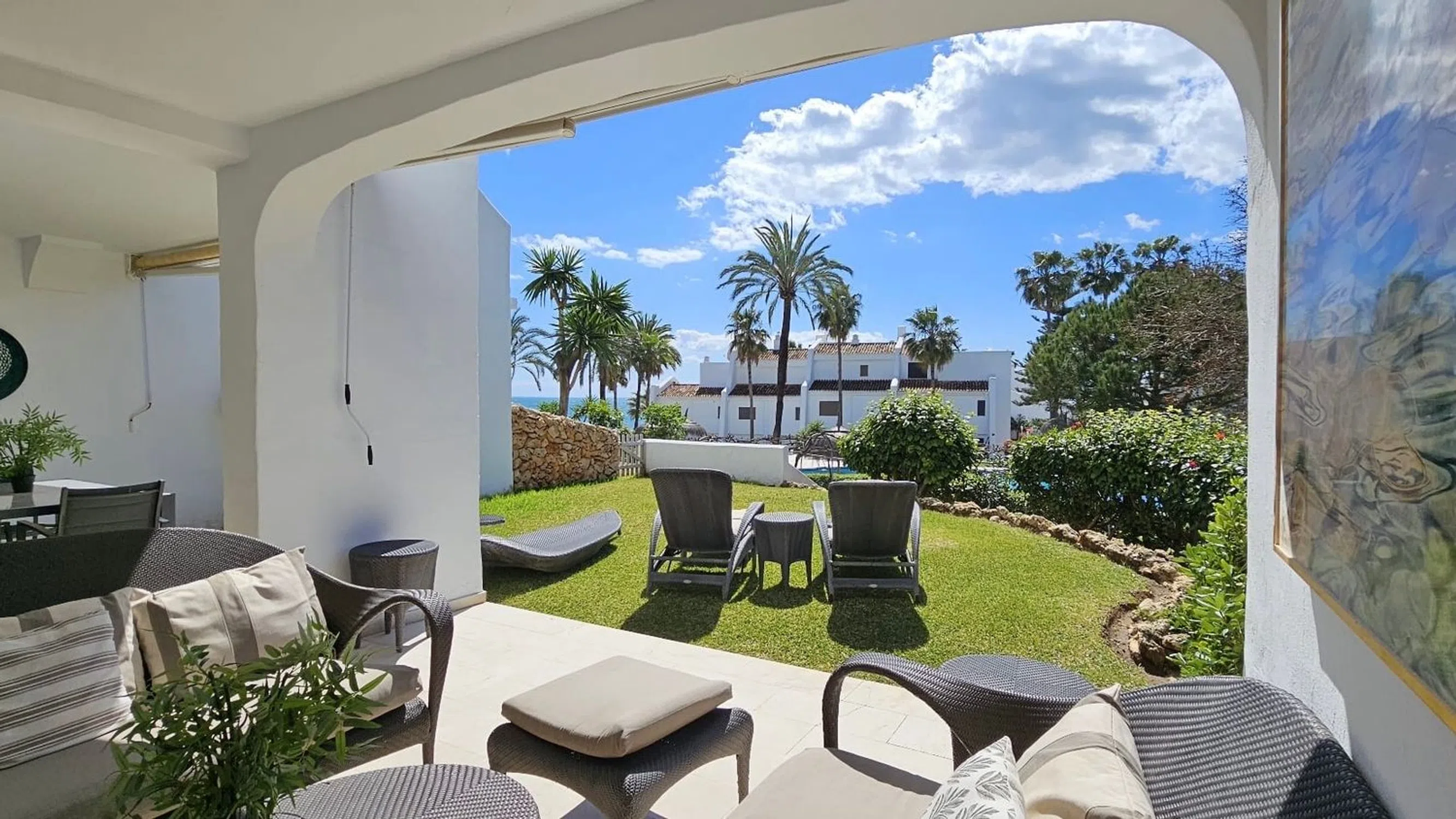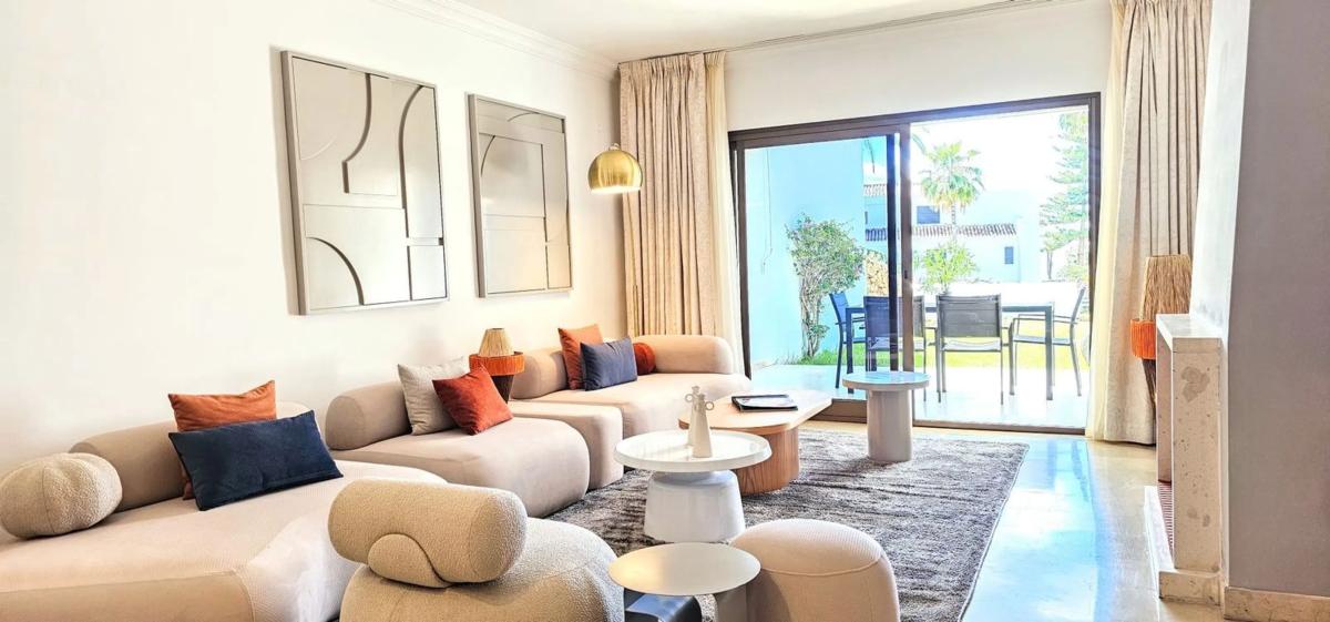 Gran apartamento en la urbanización Coral Beach, situado en primera línea de playa en la Milla de Oro, a tan solo 1 km de Puerto Banús. Este espacioso piso cuenta con 2 dormitorios y 2 baños, uno de ellos en suite. Se vende completamente amueblado y ofrece un amplio salón con acceso a una terraza y jardín privado con vista lateral al mar, a la piscina y a los jardines. La cocina está equipada con todos los electrodomésticos y existe la posibilidad de sacar un tercer dormitorio sin afectar el espacio. La urbanización ofrece excelentes comodidades, como una gran piscina de 33 metros y otra piscina infantil. También cuenta con hermosos jardines y seguridad las 24 horas con cámaras de vigilancia. Este apartamento representa una excelente inversión en un lugar privilegiado, y en caso de alquilarlo, puede generar una buena rentabilidad para cubrir los gastos del apartamento. Además de todas estas características, el piso tiene una superficie construida de 150 m² y está en buen estado de conservación. Cuenta con armarios empotrados y trastero. Fue construido en 1986 y cuenta con calefacción y aire acondicionado mediante una bomba de frío/calor. Se encuentra en la planta baja, pero cuenta con ascensor. La orientación es sur y oeste, lo que permite disfrutar de una buena iluminación natural durante todo el día. No pierdas la oportunidad de adquirir este fantástico piso en una ubicación privilegiada, con todas las comodidades necesarias para vivir cómodamente. ¡Contáctanos para más información y para concertar una visita!