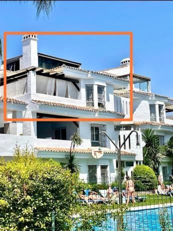 PROPIETARIO vende Ático Dúplex en la prestigiosa urbanización Los Naranjos de Marbella, a 5 minutos andando de Puerto Banús y rodeado de todo los servicios(Supermercados, restaurantes, cafeterías, parada de bus, colegios, etc.. . ). La propiedad se distribuye en 2 plantas, tiene un gran salón con chimenea de mármol y suelos de madera, que se abre a una terraza techada con vistas a la piscina y a la emblemática montaña La Concha. Cocina y terraza techada, amplia entrada. baño y dormitorio. En la segunda planta encontramos una terraza habilitada como dormitorio de 35 metros con muchas posibilidades, . La urbanización es cerrada y bien mantenida aparcamiento compartido en la entrada. Su magnífica ubicación se convierte en una gran inversión.