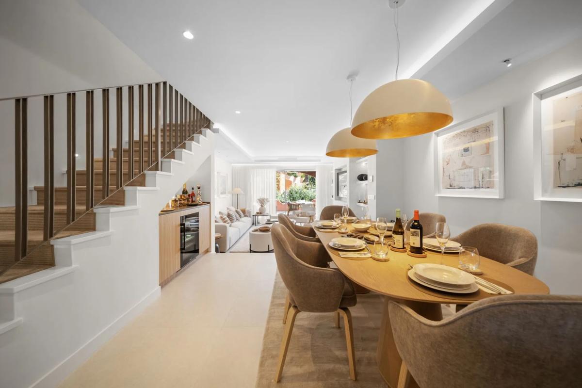 Presentando una exquisita casa de pueblo totalmente reformada situada en el prestigioso desarrollo El Palmeral de Nueva Andalucía, Marbella. Esta lujosa propiedad ofrece elegantes interiores diseñados para aquellos que buscan la mejor calidad de vida en la Costa Del Sol, el hogar combina perfectamente la atención excepcional al detalle, las comodidades contemporáneas y un estándar superior de acabado en todo. Cada característica de esta residencia ha sido cuidadosamente curada para ofrecer un estilo de vida de confort y sofisticación. Cada dormitorio cuenta con un baño en suite y su propia terraza privada, y hay un aseo para invitados para conveniencia. La cocina de planta abierta de Santos es un punto focal, perfecto tanto para la vida cotidiana como para el entretenimiento, mientras que el salón es mejorado por una chimenea de planika y acceso directo a una terraza cubierta. Doble acristalamiento, persianas eléctricas, toldos eléctricos y un sistema de hogar inteligente garantizan la comodidad y la tranquilidad de la mente, mientras que la calefacción por suelo radiante en los baños y la aertermia proporcionan control climático durante todo el año. Los residentes pueden disfrutar de una gran cantidad de servicios comunes, incluyendo una piscina, jacuzzi, sauna y gimnasio, todo situado dentro de jardines muy bien mantenidos. La propiedad está totalmente amueblada y decorada con los más altos estándares, incluyendo una bodega de vino y una zona de lavandería dedicada en la primera planta para mayor practicidad. Un garaje privado alberga un coche grande, y la propiedad se encuentra dentro de una comunidad cerrada, la propiedad está equipada con cámaras de vigilancia y alarma para mejorar la seguridad. Perfectamente situado a poca distancia del club de tenis y pádel, restaurantes, tiendas, un supermercado, y el famoso campo de golf Aloha y Las Brisas, también Aloha College está a 5 minutos en coche, esta casa es ideal para aquellos que desean sumergirse en la vibrante gastronomía local o simplemente disfrutar del estilo de vida saludable y al aire libre para el que la Costa Del Sol es famosa. Ya sea para vivir durante todo el año o un exclusivo retiro de vacaciones, esta residencia recientemente reformada ofrece una mezcla incomparable de lujo, comodidad y encanto mediterráneo.