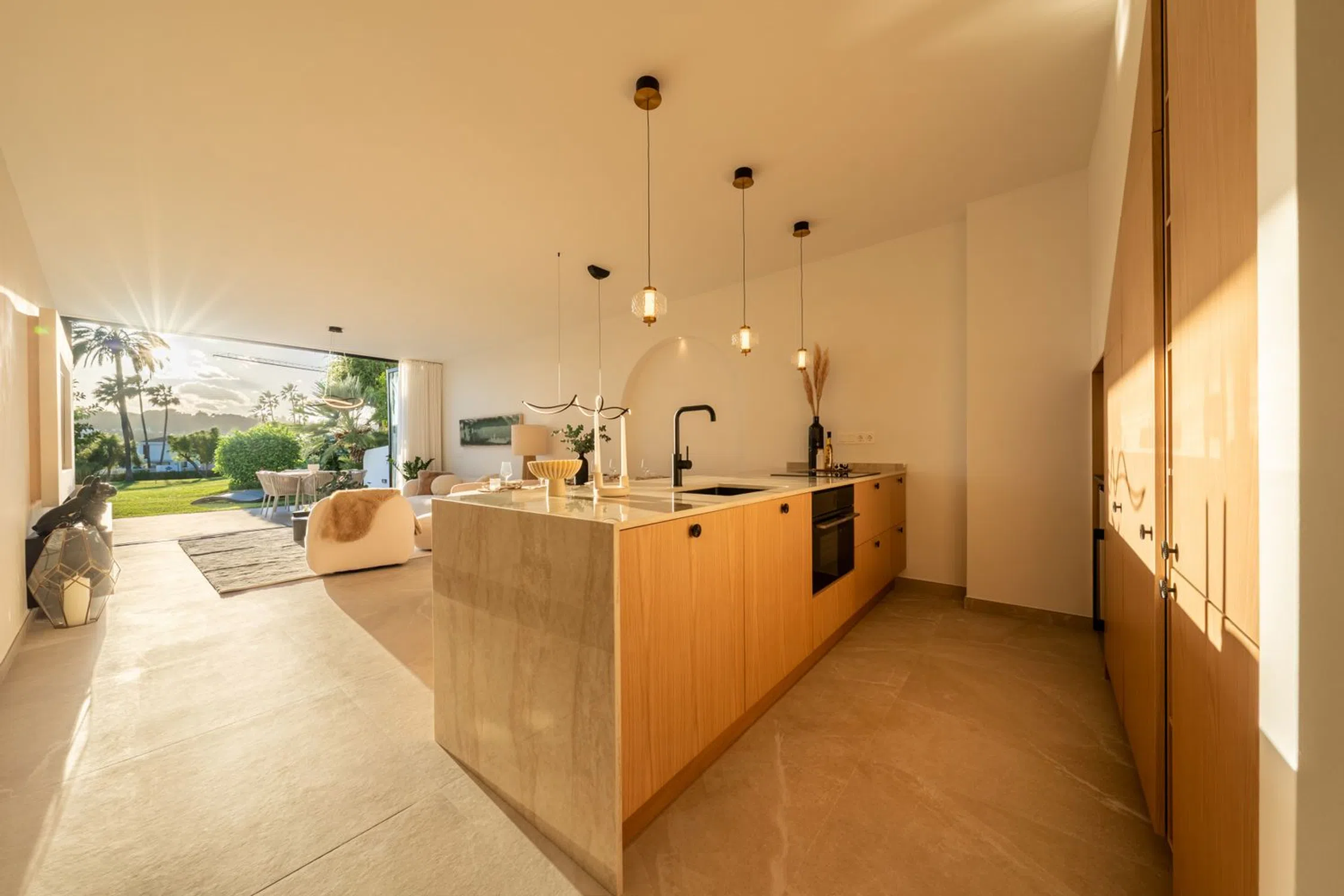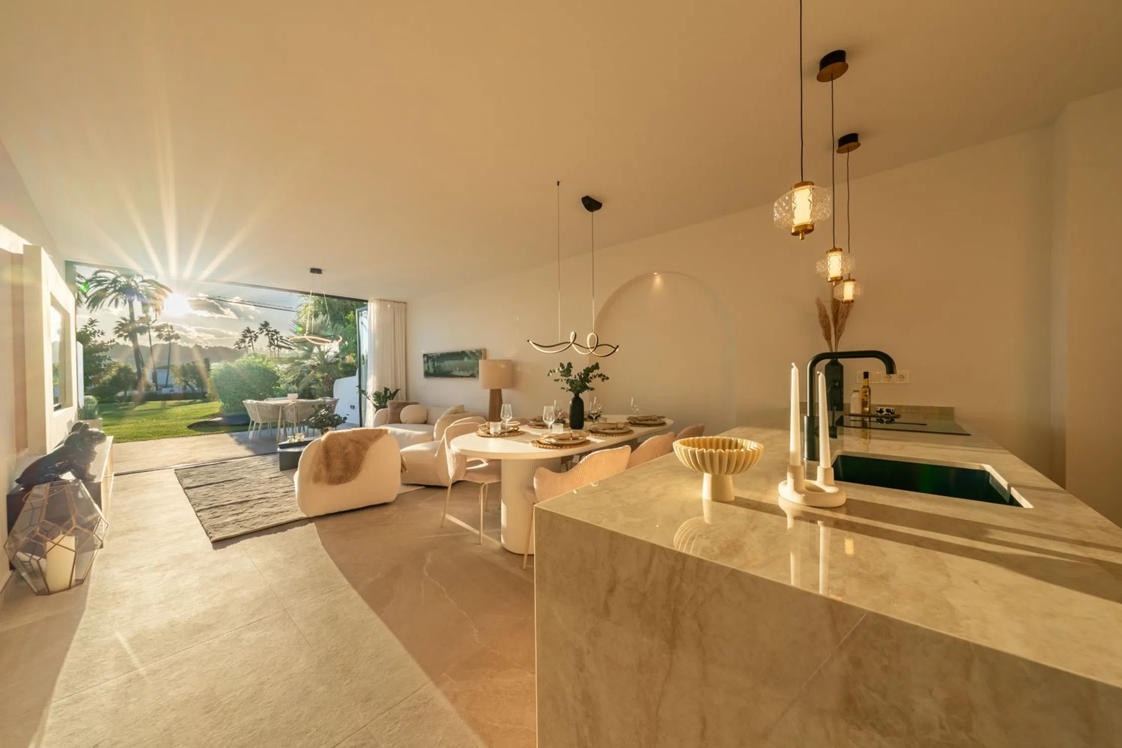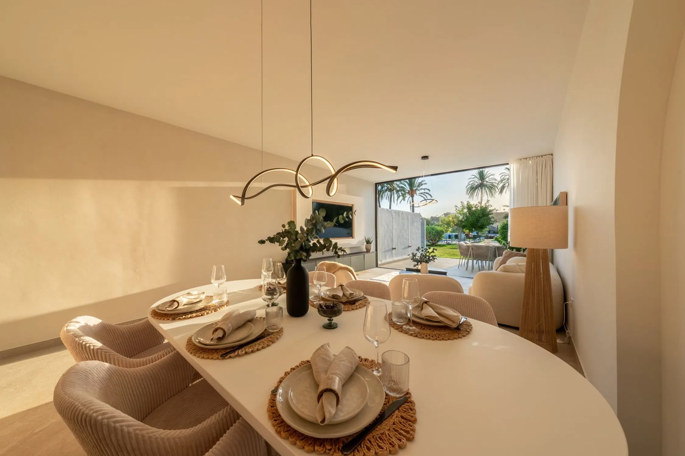 Descubra la sofisticación contemporánea en esta casa adosada totalmente renovada de 4 dormitorios, situada en la exclusiva comunidad cerrada de La Rinconada, en el corazón del Valle del Golf de Marbella. Diseñada con una estética mediterránea moderna, la vivienda combina elegancia, luz natural y calidez. La zona de estar de planta abierta cuenta con una cocina a medida con acabados en madera natural y mármol, que se integra perfectamente con el comedor y el salón. Las amplias puertas de cristal se abren a una terraza privada y a un jardín paisajístico — un espacio ideal para disfrutar del estilo de vida al aire libre. En la planta superior, la suite principal y los dormitorios de invitados ofrecen un ambiente sereno y elegante, con materiales de alta calidad y tonos suaves y neutros. Rodeada de exuberantes jardines tropicales y una preciosa piscina comunitaria, esta casa ofrece la combinación perfecta de tranquilidad y comodidad — a pocos minutos de campos de golf de primer nivel, tiendas exclusivas y la vibrante energía de Puerto Banús. Una joya lista para entrar a vivir que encarna la esencia del estilo de vida contemporáneo de Marbella.