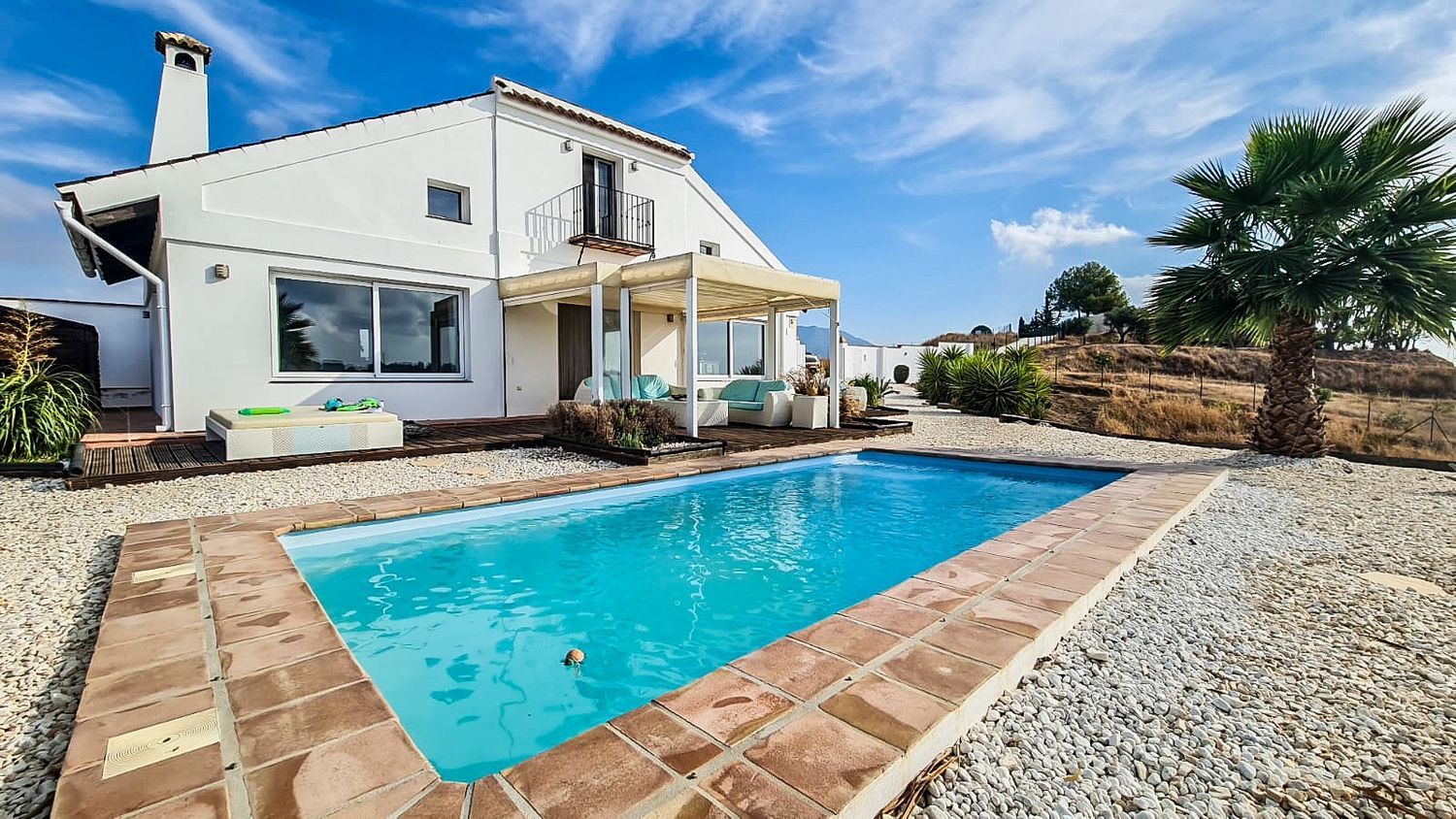Le ofrecemos esta impresionante Villa situada a sólo 10 minutos en coche del Mar Mediterráneo.La propiedad está situada en una gran parcela orientada al suroeste con hermosas vistas hacia elmontañas y mar. La propiedad se divide en 2 plantas con una gran sala de estar en la planta baja, cocina americana abierta y 2 amplios dormitorios. En la planta superior un dormitorio en suite con baño y ducha integrados. la propiedad ha sido completamenteReformada con una mezcla de estilo andaluz y nórdico. La propiedad tiene una hermosa piscinay parcela cerrada. Junto a las parcelas hay un pozo privado para suministro propio de agua para piscina y riego.Propiedad vendida como se ve completamente amueblada. Gran oportunidad! .