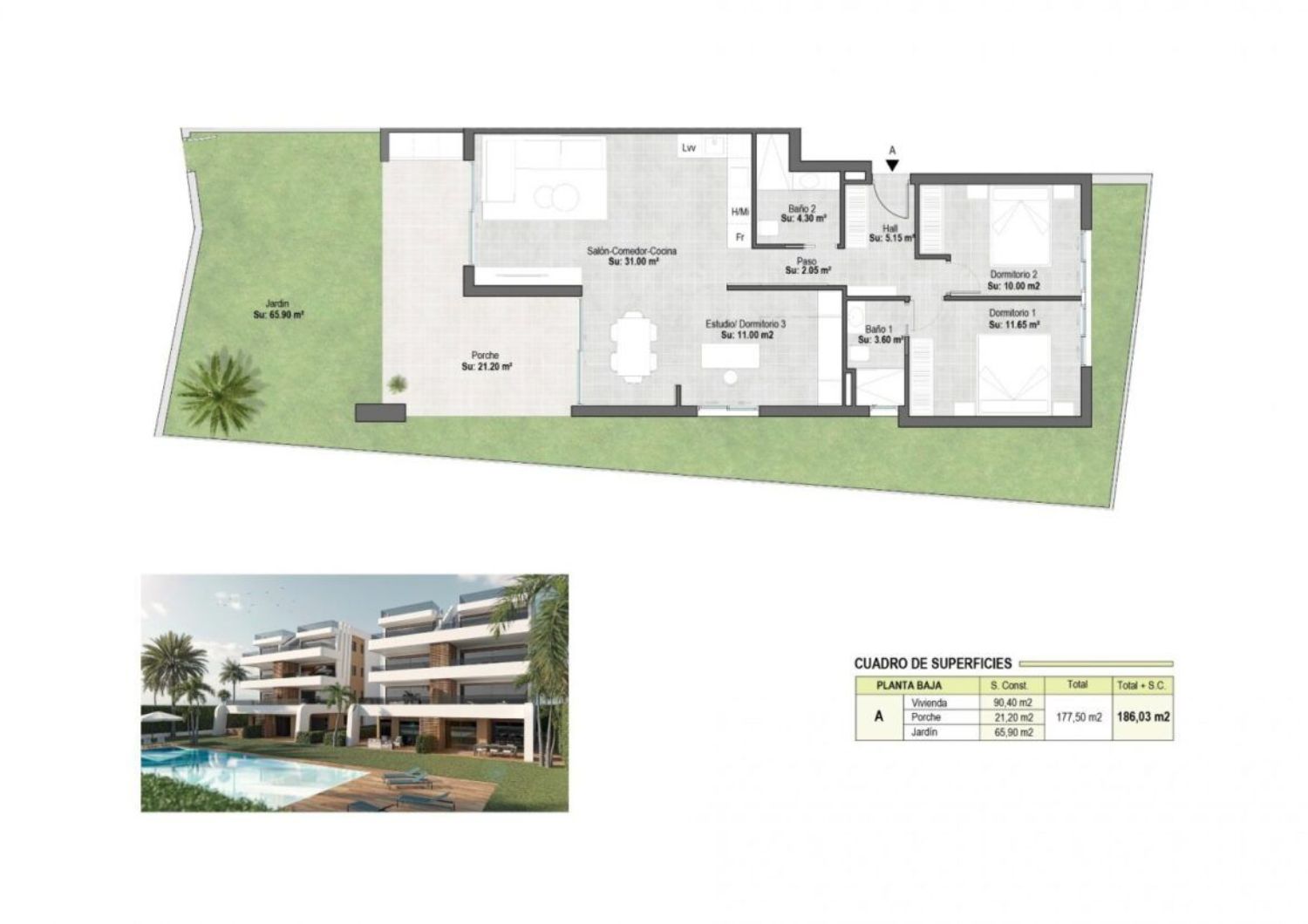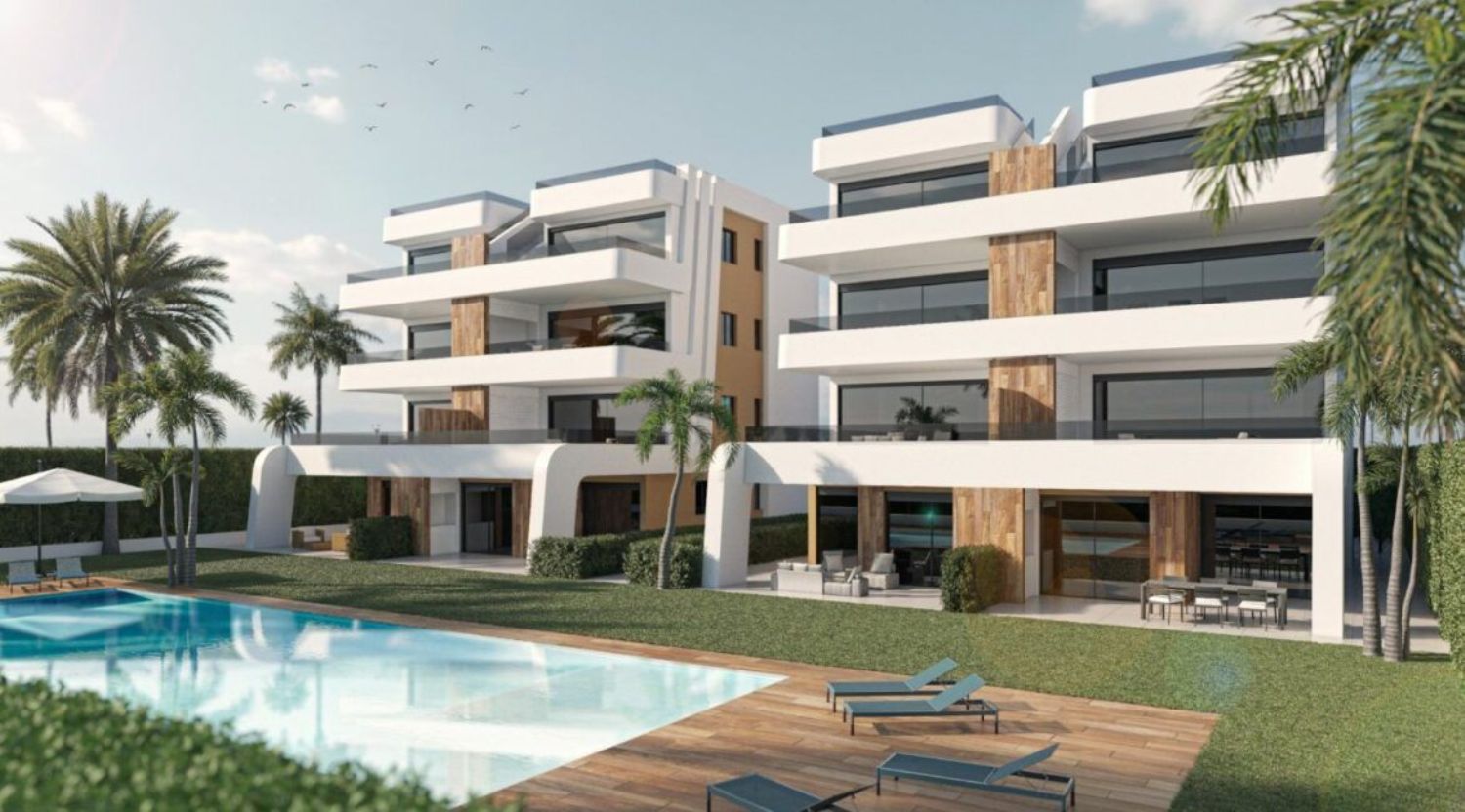 APARTAMENTOS DE OBRA NUEVA EN EL CAMPO DE GOLF DE CONDADO DE ALHAMA Complejo residencial de villas y apartamentos de nueva construcción en Condado de Alhama. Los 8 hermosos apartamentos se distribuyen entre planta baja, primera, segunda y tercera, con dos viviendas en cada planta y ascensor para pasar de un nivel a otro. Disponen de varias piscinas comunitarias, plaza de aparcamiento exterior para cada apartamento, trastero y terraza con cocina de verano. Las viviendas de la última planta tienen un solarium. Las dos viviendas de la planta baja tienen 3 dormitorios y 2 baños completos y el resto de las viviendas tienen 2 dormitorios y 2 baños completos también. Las viviendas han sido diseñadas con un estilo contemporáneo y un concepto abierto, compuesto por una cocina equipada y un salón-comedor. La promoción se encuentra en el Condado de Alhama, Murcia, dentro de un complejo turístico de lujo, con zonas deportivas y rodeado de naturaleza, todos los servicios, y varios Campos de Golf. La vivienda cumplirá con los más altos estándares y estará dotada de: Piscinas comunitarias con amplias zonas verdes. Cocina completamente amueblada y equipada con horno y microondas elevados y en columna, nevera y lavavajillas integrados, placa de inducción y campana extractora. Iluminación: en el interior de la vivienda (comedor, cocina, pasillos y baños), así como en las zonas exteriores. Armarios forrados con cajones y estantes. Cuartos de baño totalmente equipados con mueble de lavabo, inodoro suspendido, espejo, ducha mural y mamparas de ducha. Preinstalación de aire acondicionado por conductos. Cocina de verano en las terrazas. Solarium en las plantas superiores. Plaza de aparcamiento exterior con trastero. Ascensor (desde la planta baja hasta la 3ª planta). Condado de Alhama Golf Resort es un fantástico complejo de golf con muchas instalaciones y servicios. Un centro comercial, un centro deportivo, una variedad de bares y restaurantes, supermercados y más de 25 piscinas y jardines comunitarios. Condado de Alhama Golf Resort tiene su propio campo de golf diseñado por Jack Nicklaus y está a sólo 15 minutos de las hermosas playas de Bolnuevo y Mazarrón. Mazarrón tiene más de 35 km de costa, gran parte de la cual es costa virgen. Numerosas playas de la Bahía de Mazarrón han sido galardonadas con la Bandera Azul por su calidad. Condado de Alhama Golf Resort está a sólo 20 minutos del nuevo aeropuerto internacional de Corvera.
