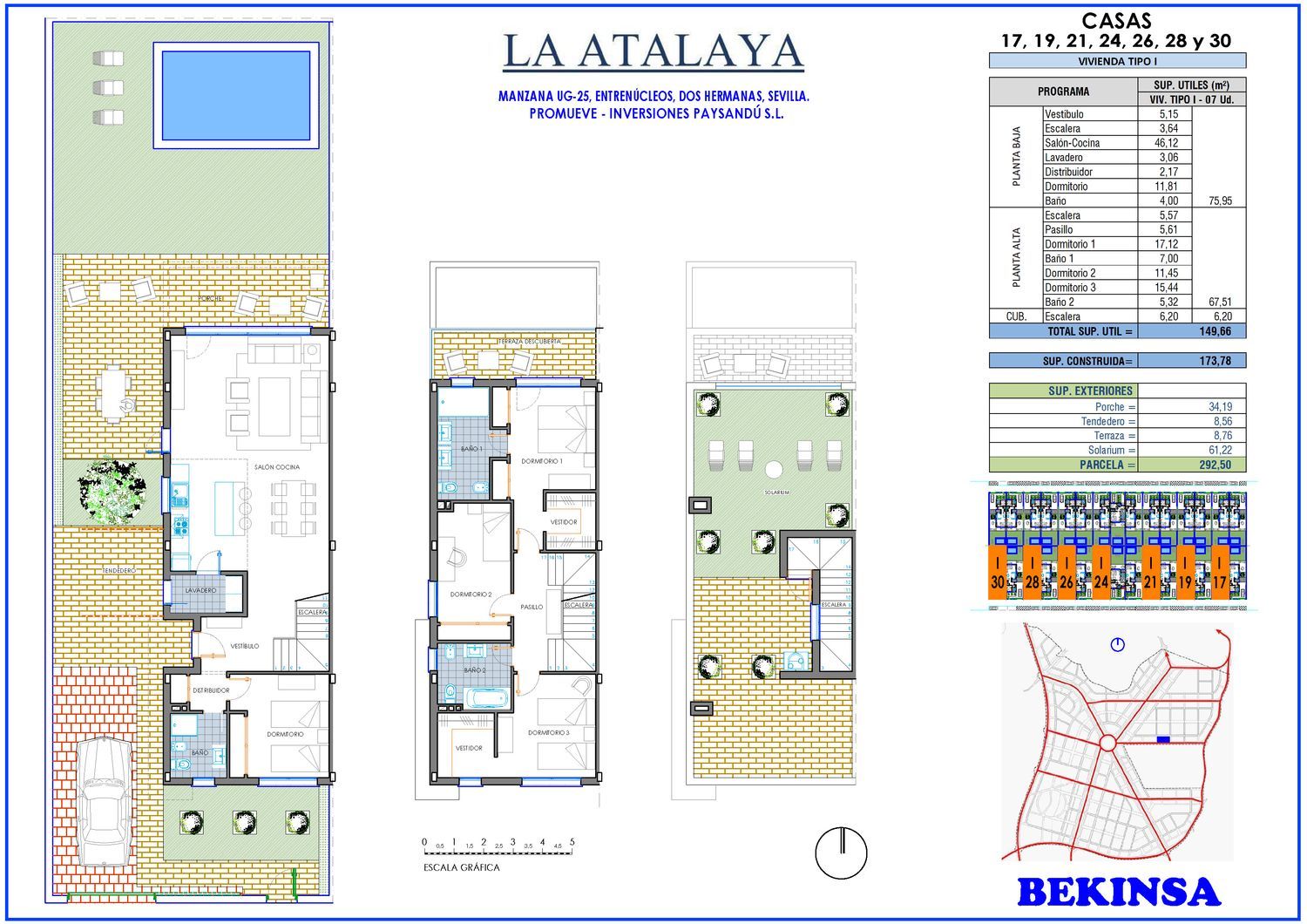 “La Atalaya”, nueva promoción de Villas pareadas de 4 y 5 dormitorios con piscina individual y cocina amueblada en parcelas de 292 m2 en el corazón de Entrenúcleos. Una de las mejores urbanizaciones residenciales de Sevilla, dónde se combina un desarrollo urbano del siglo XXI, con un lugar tranquilo para vivir. La Atalaya está compuesta por 30 exclusivas Villas pareadas de 175 m2 con piscina individual y un solárium de más de 60 m2, en parcelas de 292 m². Las Villas cuentan con 4 o 5 dormitorios y 3 baños, y cocina amueblada, destacando sus amplias y luminosas estancias. Un diseño pensado para conectar de manera fluida el interior de la vivienda con sus espacios exteriores. Las Villas se han diseñado con calidades y materiales acordes al compromiso de calidad, durabilidad y sostenibilidad medio ambiental que BEKINSA tiene como enseña, de manera que obtengan la más alta calificación energética, la A. Puede consultar el detalle de los mismos en la memoria de calidades o informe de sostenibilidad. La promoción dispone en su entorno de importantes equipamientos como generosas zonas verdes, amplios bulevares y paseos con juegos infantiles, áreas de esparcimiento, skate park, etc…, parroquia, guarderías, colegios, institutos, universidades, centros médicos, supermercados, centros comerciales, carril bici, etc. Su excelente ubicación con rápidas conexiones hacia autovías como la SE-40, SE-30, A-92, A-376 y A-392, su cercanía a paradas de autobuses, línea 5 (Dos Hermanas – Montequinto), a 500 metros de la parada del metro-bus que enlaza con la Línea 1 del metro de Sevilla, o con carril bici que la comunica con Dos Hermanas, o Sevilla, le facilitará sus traslados. Una combinación perfecta de tranquilidad y cercanía.Venga a visitarnos a nuestra nueva oficina comercial en la Avda. Vial 73 de Entrenúcleos, Dos Hermanas, y conozca un cuidado y moderno proyecto con la garantía y experiencia que nos caracteriza, y que hace que las villas de La Atalaya sean especiales. *IVA no incluido en los precios de venta. **Las imágenes son recreaciones virtuales con elementos decorativos y mobiliario que no forma parte, en ningún caso, de la oferta publicitada. Lo mostrado en las infografías tiene carácter orientativo, pudiendo sufrir variaciones.