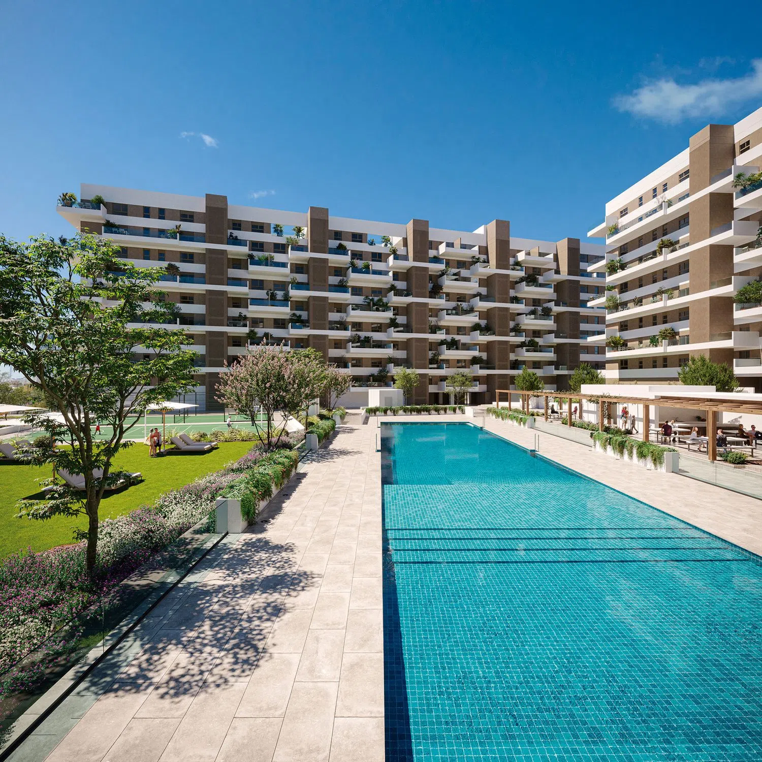 Osiedle oferuje szeroki wachlarz usług przemyślanych w najdrobniejszych szczegółach, aby móc dzielić wyjątkowe chwile z rodziną i przyjaciółmi. Kładąc nacisk na bezpieczeństwo, osiedle znajduje się na terenie zamkniętym, z dostępem przez strzeżony punkt kontrolny. Wśród rozległych przestrzeni wspólnych znajduje się duży basen z chlorowaniem solnym, klub fitness, kort do gry w padla, boisko wielofunkcyjne, zewnętrzny klub społeczny, strefa solarium oraz plac zabaw zaprojektowany z myślą o bezpieczeństwie najmłodszych.
