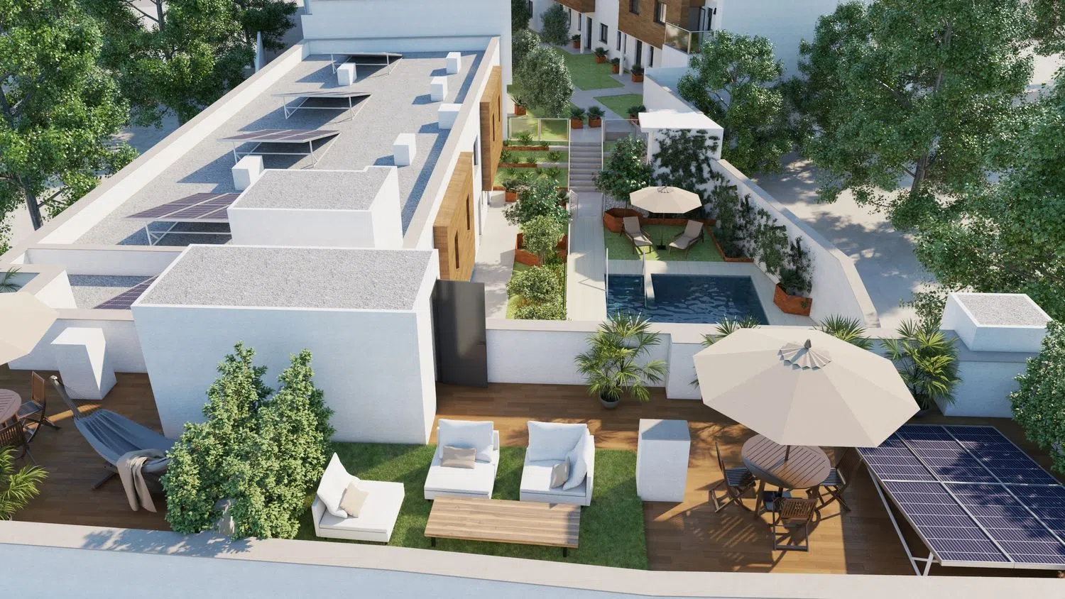 Na uwagę zasługują przemyślane udogodnienia: przestronne tarasy lub prywatne ogrody, miejsca parkingowe i komórki lokatorskie wliczone w cenę, co czyni te domy idealnym miejscem na relaks na świeżym powietrzu. Mieszkania mają najwyższą klasę energetyczną A+, co gwarantuje wyjątkową oszczędność energii i komfort cieplny przez cały rok. Systemy fotowoltaiczne pozwalają na czerpanie energii ze słońca, co wpływa na ograniczenie wpływu na środowisko. Dodatkowo, solankowy basen zapewnia zdrowe otoczenie do rekreacji. Podziemny garaż z bezpośrednim dostępem do głównego poziomu z windą oraz zamknięte osiedle gwarantują bezpieczeństwo i prywatność.