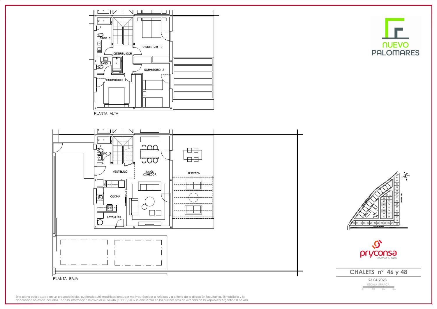 El residencial proyectado con 58 viviendas unifamiliares pareadas independientes, cuenta con una urbanización privada de casi 3.000m2 destinados al ocio, deporte, bienestar y fomento de la vida comunitaria y las relaciones entre los miembros del residencial.La construcción y entrega de la promoción será faseada:- la fase 1 tendrá un total de 43 viviendas, con entrega prevista entre diciembre de 2024 y primavera de 2025- la fase 2 tendrá un total de 15 viviendas.Las zonas comunes contarán con una piscina semiolímpica de 25 metros de largo con amplia zona solárium, una sala destinada a gimnasio, una sala multiusos, aseos comunitarios, una magnífica pista polideportiva, pista de pádel, zona de juegos infantiles y amplias zonas verdes.Los chalets pareados están construidos sobre parcelas privadas de 308 m2 quedando una superficie libre de 240 m2.Al carácter singular y exclusivo derivado del diseño de las viviendas con líneas limpias y vanguardistashay que sumar también las ventajas y beneficios de un proceso constructivo en el que la prioridad ha estribado en la mejora de la eficiencia energética y el bienestar, obtenidos incorporando aislamientos térmicos y acústicos[. |]Palomares del Río se sitúa a 6 km de Mairena de Aljarafe, 11 km de Sevilla capital y con rápidos accesos a SE-40. Es un municipio caracterizado por su tranquilidad, con una población de gente joven, con numerosos servicios y que ha experimentado un gran crecimiento demográfico en los últimos años.Con todo lo necesario para el día a día: supermercados, escuelas, Institutos, polideportivos, parques, viveros, líneas de autobús, restaurantes etc.