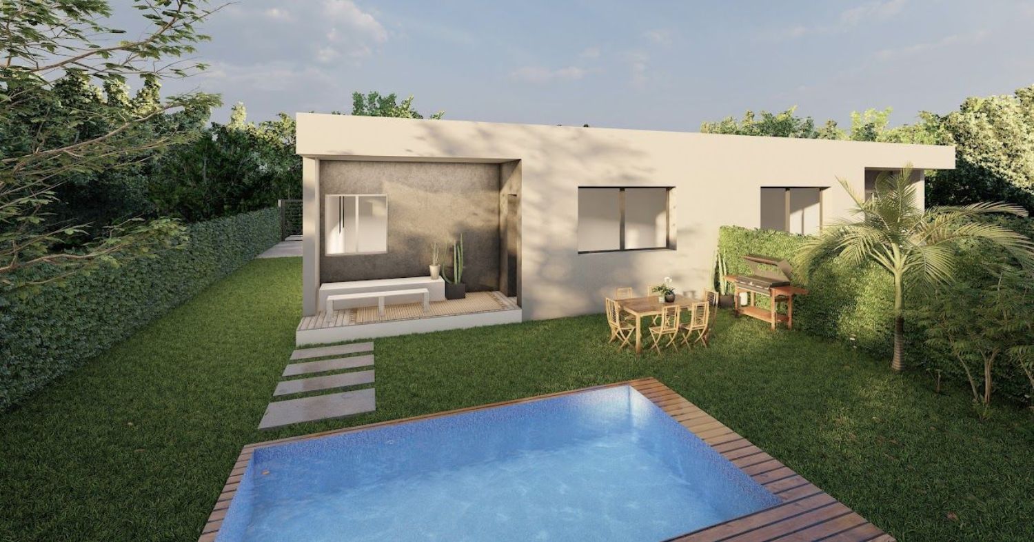 Les presentamos estos magníficos chalets pareados construidos sobre parcelas de 300 m2 con las mejores calidades y aislantes del mercado. Una de las viviendas mas eficientes de nuestros tiempos.Las viviendas distribuidas en una única planta consta de tres habitaciones una de ellas tipo suite con vestidor y baño, otro baño de servicio y un gran salón con cocina americana de casi 40 metros cuadrados en total. Podrá aprovechar los porches que esta construcción le permite para poder disfrutar de su jardín.Las calidades de estas viviendas son de diseño moderno. Suelos cerámicos imitación madera, puertas lacadas en blanco, piscina incluida en el precio. Descubre todas las ventajas que tiene esta vivienda llamando a nuestro departamento comercial. ¡LOS SUEÑOS NO SE PARAN!