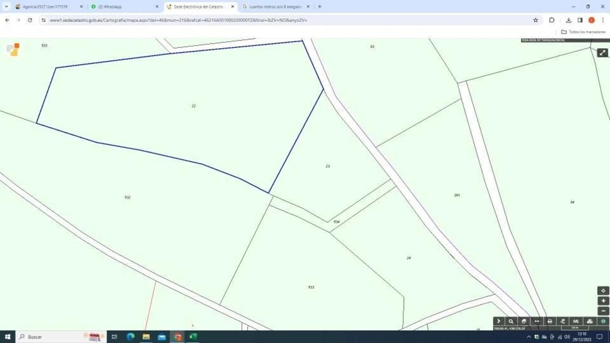 Parcela a 1.3 Km de Ribarroja por la carretera CV-374, polígono 60 parcela 36 de 3873 m2 en catastro, actualmente terreno de pinos, junto a la carretera. La superficie Registral es mayor 4...