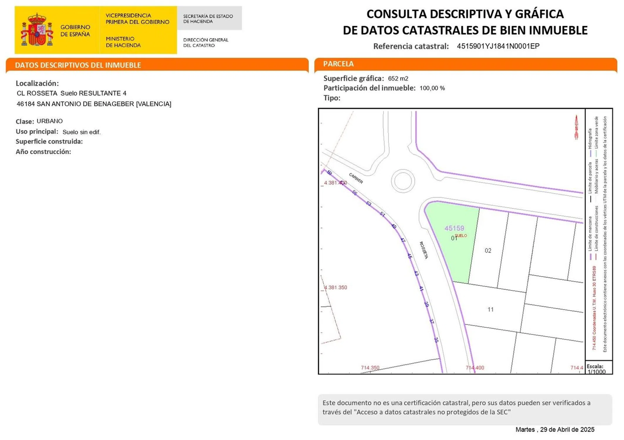 � TERRENO URBANO ESQUINERO EN SAN ANTONIO DE BENAGÉBER – 652 m² PARA CONSTRUIR LA CASA DE TUS SUEÑOS � ¡Oportunidad única en una de las mejores zonas de San Antonio de Benagéber! Se vende impresionante parcela urbana de 652 m², ubicada en una esquina a dos calles, perfecta para construir una vivienda unifamiliar de alto nivel o incluso dos, según normativa vigente:. Uso: Unifamiliar Aislada Edificabilidad: (220 m²) Fachada C/ Falcia: 23 metros. Fachada C/ Rosseta: 36 metros. Profundidad: 36,82 metros Ocupación: 40% Linde fachada: 5 metros Linde medianeras: 3 metros. Sótano no computa como edificabilidad. Se permite la construcción de hasta dos plantas, con una altura máxima de cumbrera de 9 metros desde el nivel del suelo de la planta baja. - Se autoriza la edificación de un máximo de 3 estructuras auxiliares para garajes, áreas de asado y/o almacenes, con una altura no superior a 3,00 m y una superficie construida que no exceda los 25 m2 cada una. � Ubicación privilegiada: Situada en una de las zonas más exclusivas y tranquilas del municipio, rodeada de viviendas de alto standing, zonas verdes y con excelentes comunicaciones con Valencia (a solo 15 minutos), la autovía CV-35, colegios, supermercados y todos los servicios necesarios. � Características destacadas: 652 m² de superficie totalmente urbanizable Esquinera, con acceso por dos calles Zona consolidada con todos los suministros: agua, luz, alcantarillado, alumbrado público Ideal para construir una villa de lujo con jardín, piscina y garaje Calle amplia, residencial y muy tranquila � ¿Buscas construir la casa de tus sueños? Aquí tienes el lienzo perfecto para hacerlo realidad. � También ideal como inversión por su ubicación estratégica y alta demanda en la zona. � ¡No dejes pasar esta oportunidad! Contacta con nosotros para más información o visita sin compromiso.