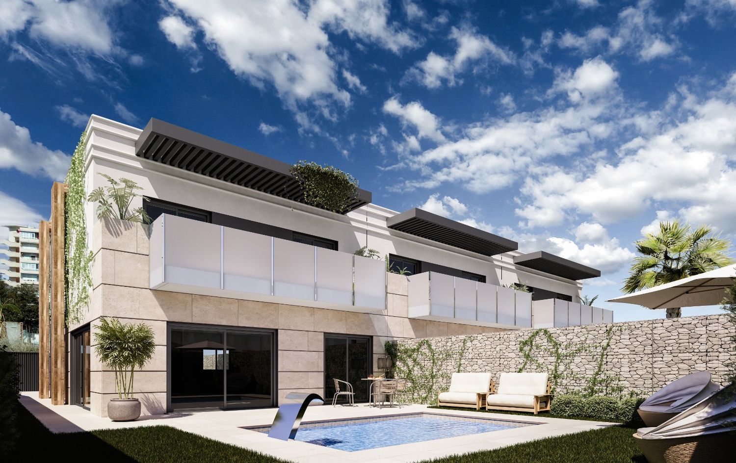 Vivienda unifamiliar en una de las mejores zonas de Torremolinos en los Alamos, con una superficie de Parcela de 300 m2 y una superficie construida de 153 m2, distribuidos en planta baja y planta primera. En la planta baja cuanta con un amplio salón con salida a la terraza de la piscina, cocina, un dormitorio y un baño. En la planta primera cuenta con 3 dormitorios y 3 baños, estando todos los baños dentro de cada habitación para mayor comodidad de sus futuros propietarios. Tiene unas zonas exteriores de 220 m2 donde se ubica la piscina de clorador salino, 2 plazas de aparcamiento y terrazas y jardines.Las calidades de la vivienda son de la Marca porcelanosa y se entrega con la cocina totalmente amueblada y equipada de electrodomésticos.Una de las mejores casas de obra nueva que actualmente se están construyendo en la zona de Los Alamos.
