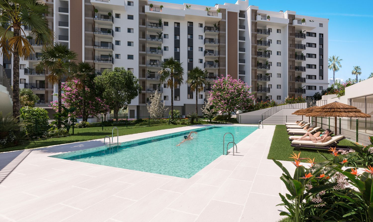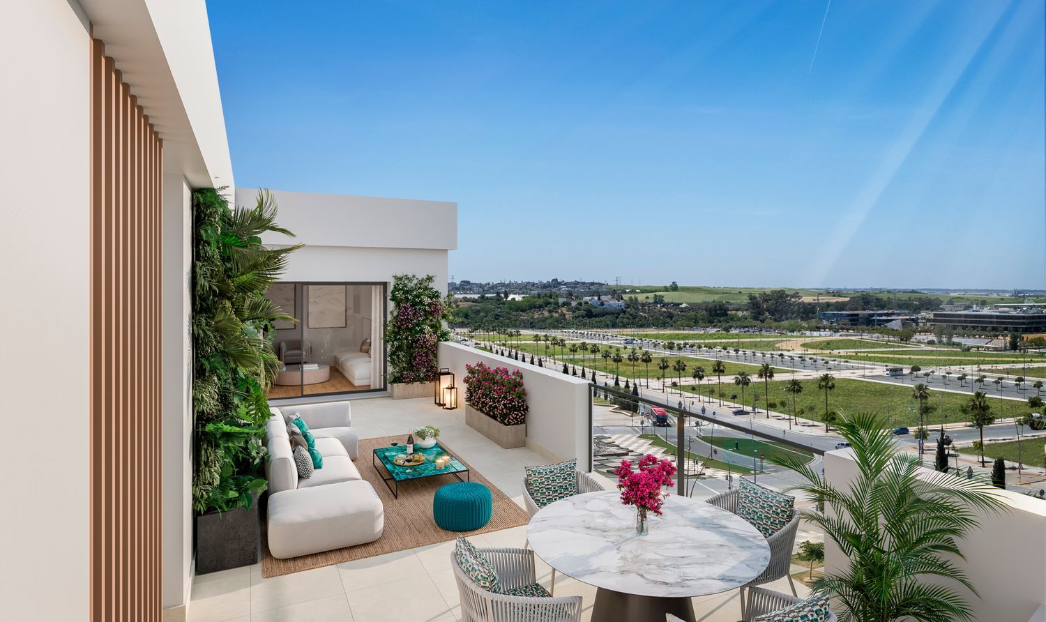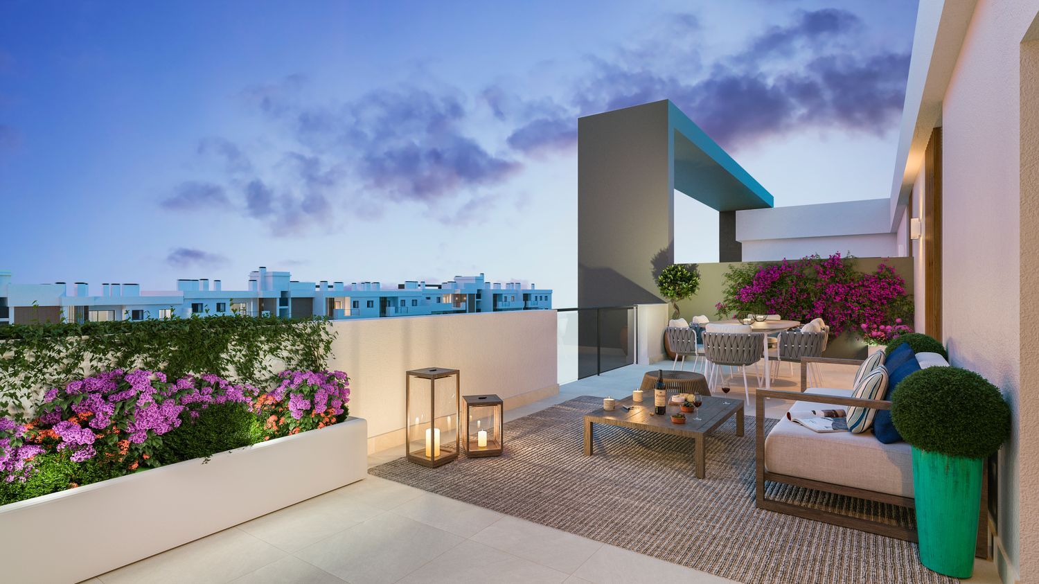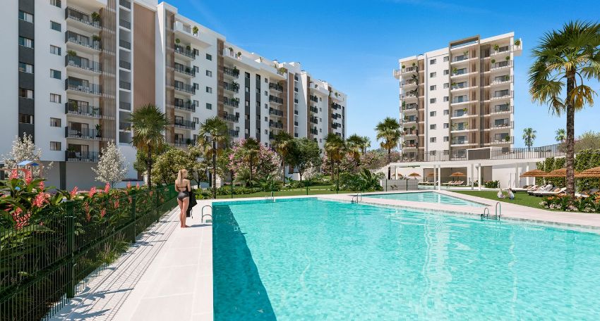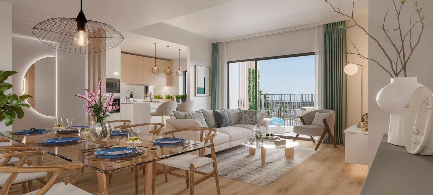 Las ventajas de este desarrollo inmobiliario son numerosas. Las viviendas cuentan con terrazas amplias, cocinas completamente amuebladas, lavaderos y armarios empotrados que añaden confort y practicidad. Además, cada propiedad incluye una plaza de garaje y trastero en el precio. El sistema de aire acondicionado centralizado garantiza un entorno cómodo durante todo el año, complementado por un certificado energético B que subraya su compromiso con la eficiencia y sostenibilidad.
