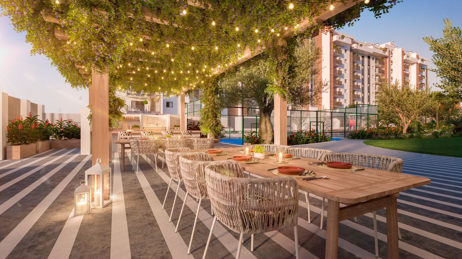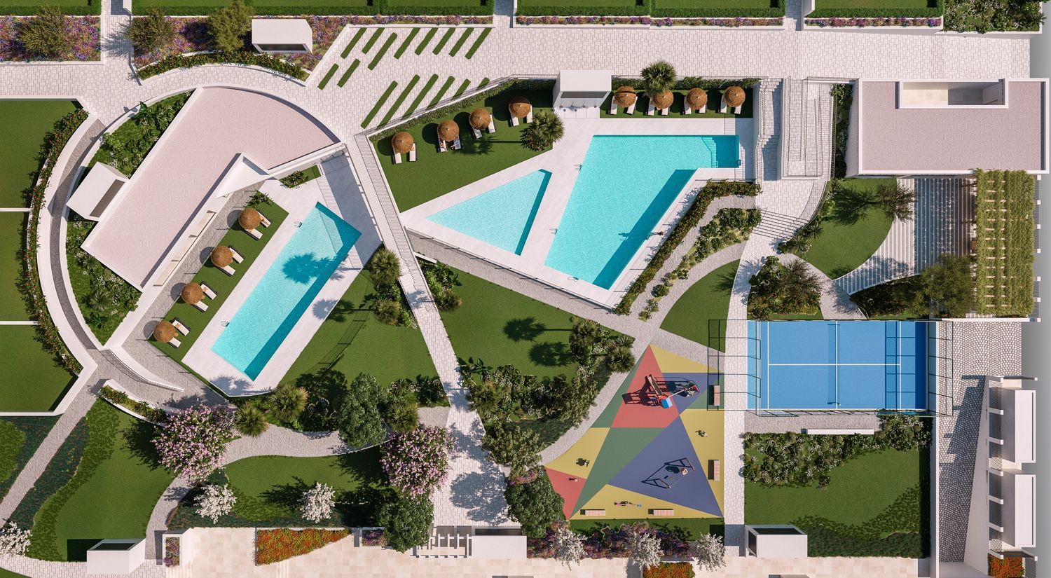 Los espacios comunes del residencial no dejan de impresionar, con la inclusión de gimnasio, múltiples piscinas, y áreas específicas para barbacoa y juegos infantiles, que invitan a disfrutar del tiempo libre en familia. Para aquellos que buscan relajarse, hay áreas ajardinadas, un spa y un bar a disposición de los residentes. La seguridad y accesibilidad están garantizadas gracias a la inclusión de un ascensor y zonas de pasatiempo como la pista de pádel y áreas verdes.