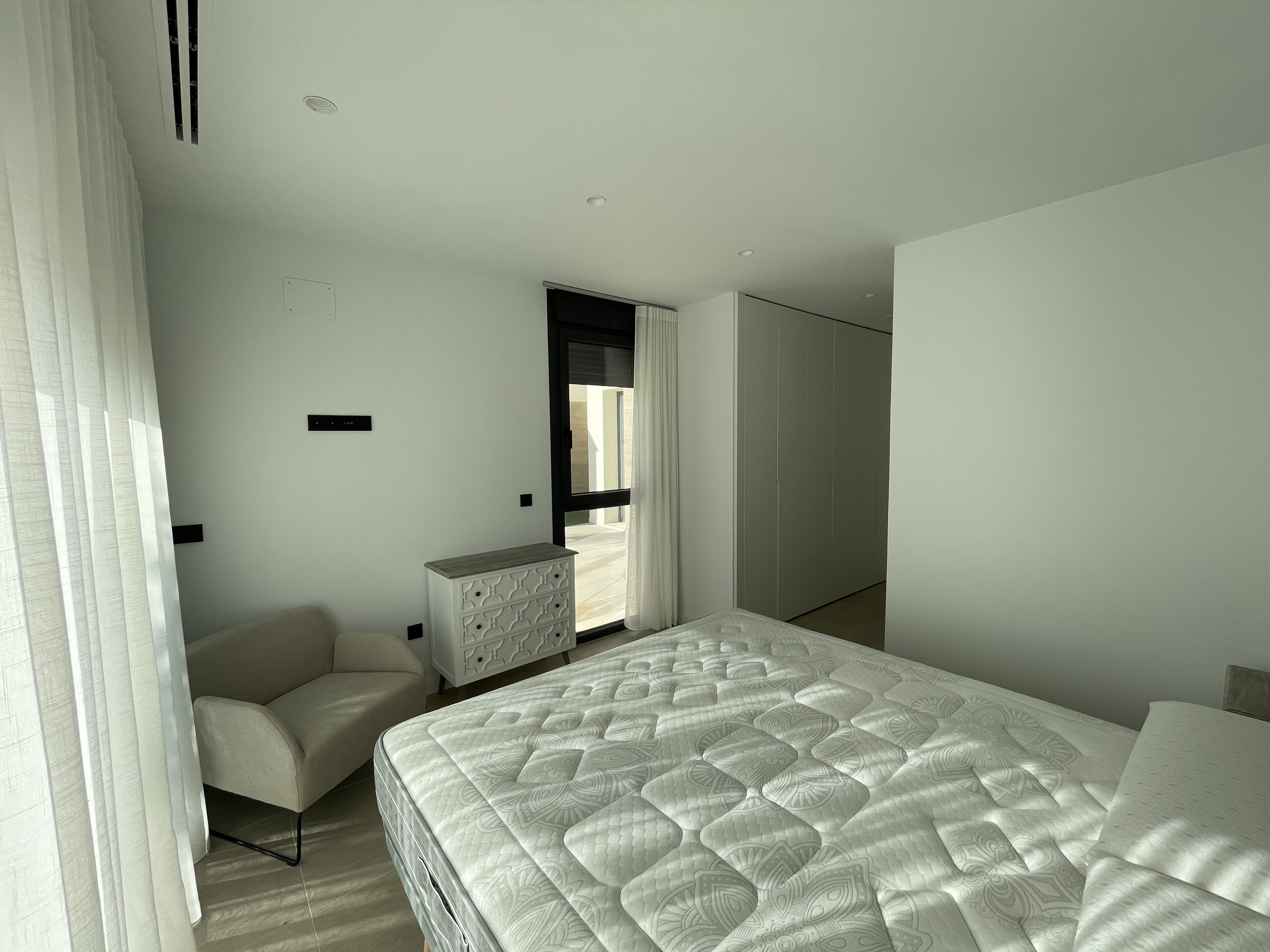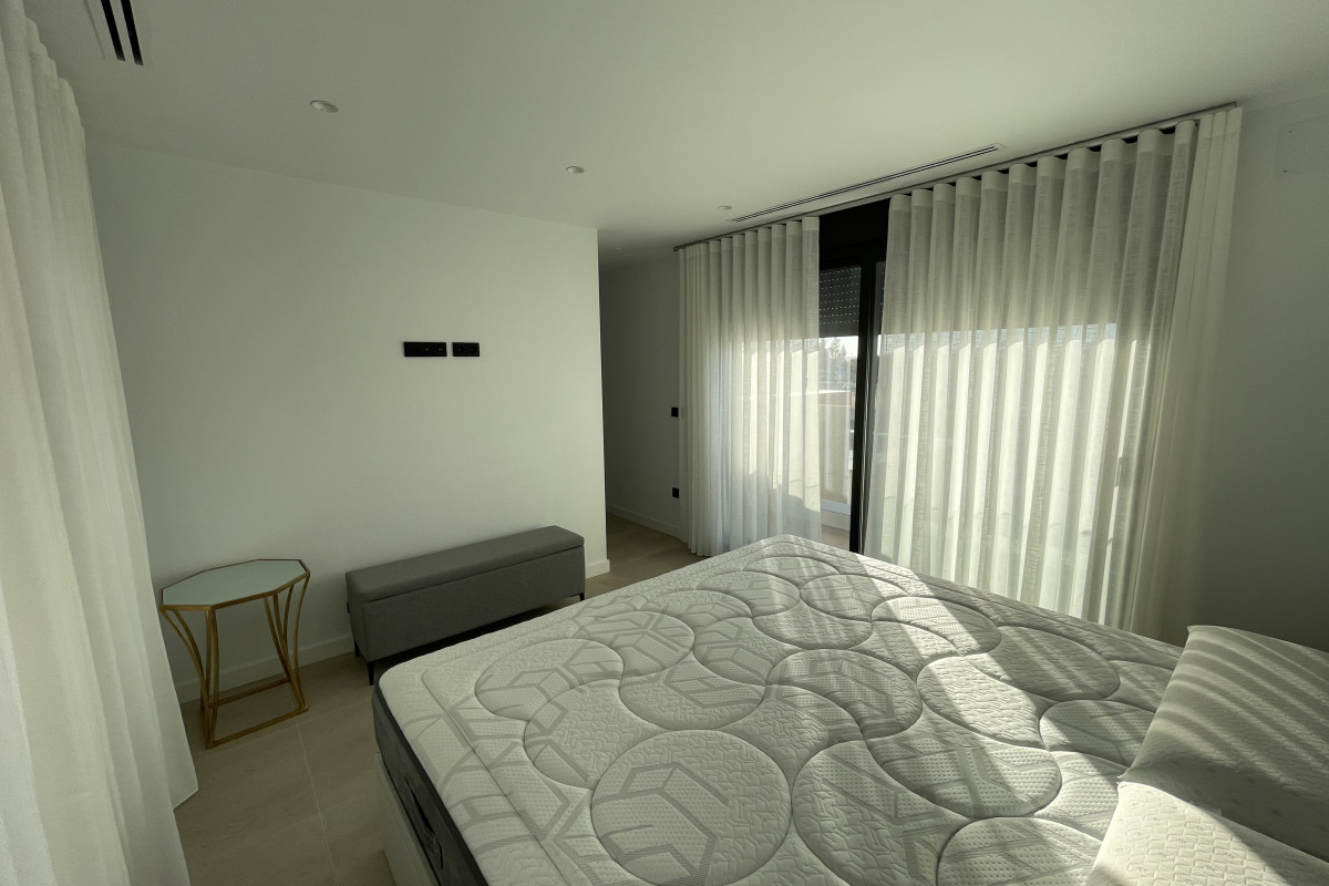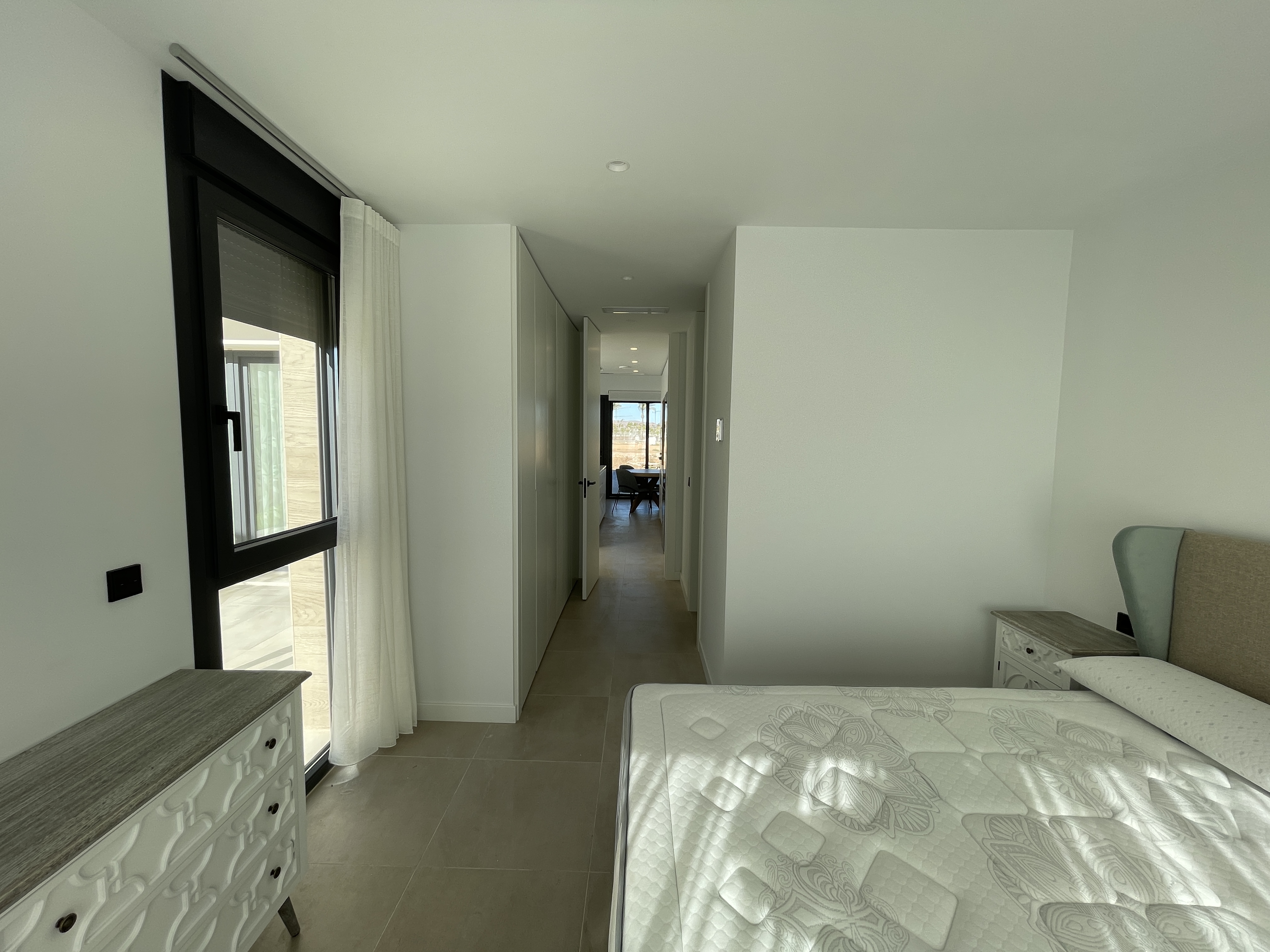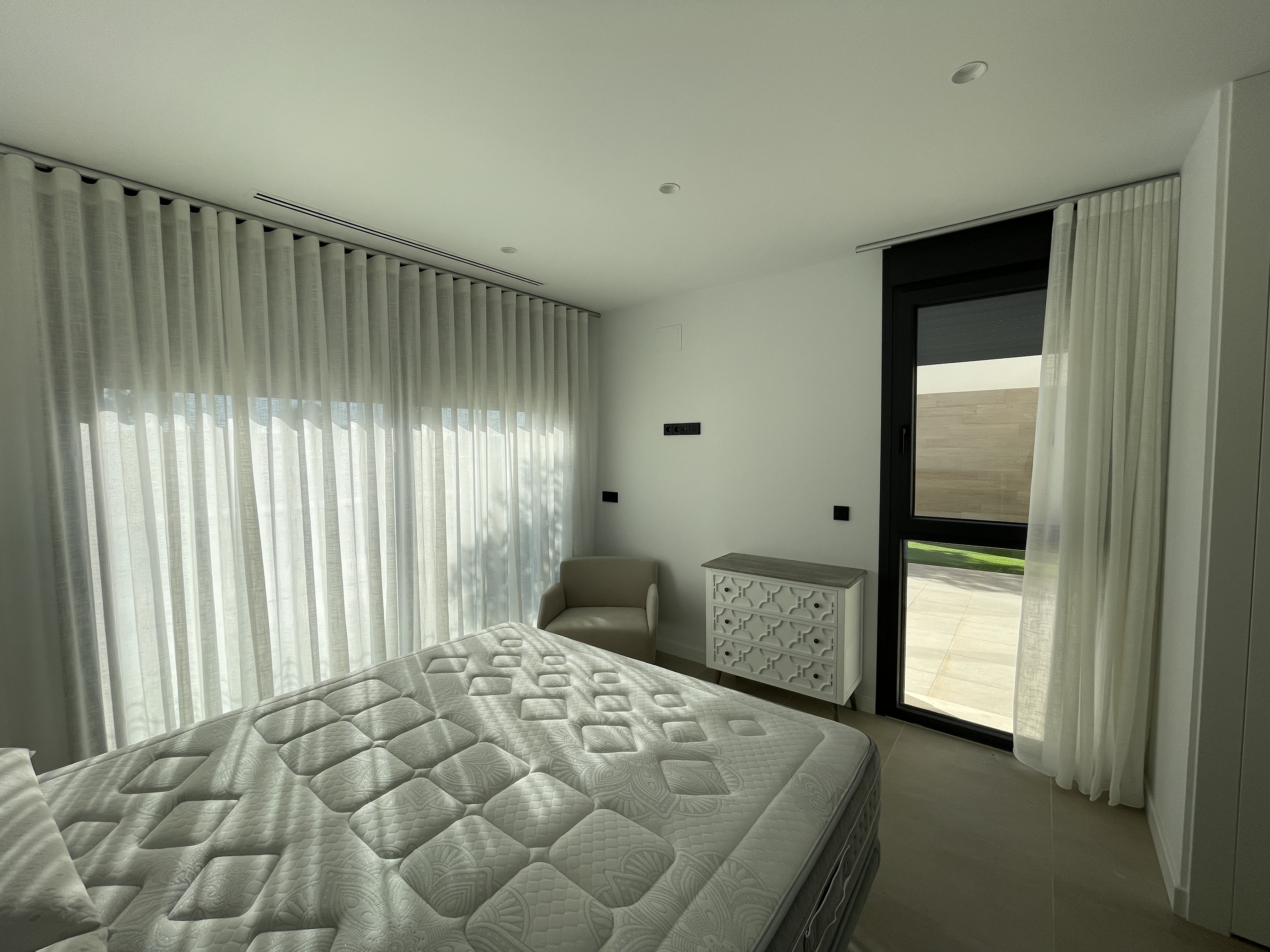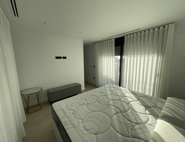 Uno de los dos dormitorios de la planta baja dispone de un lujoso cuarto de baño en suite. El tercer dormitorio se encuentra en la primera planta y también tiene un lujoso cuarto de baño en-suite. Este dormitorio tiene dos terrazas, a ambos lados del dormitorio. Así que siempre puede disfrutar del sol o de la sombra, lo cual es maravilloso. Desde su terraza delantera tiene una amplia vista sobre el complejo y la fantástica laguna Cristal. Tiene la opción de construir una piscina privada en su jardín. Su chalet independiente está equipado con aire acondicionado que también puede calentar, persianas eléctricas e iluminación LED, tanto en el interior como en el exterior. Opcionalmente, puede instalar un sistema domótico para controlar el aire acondicionado, la iluminación y las persianas. Tiene la opción de aparcar su coche en su parcela.
