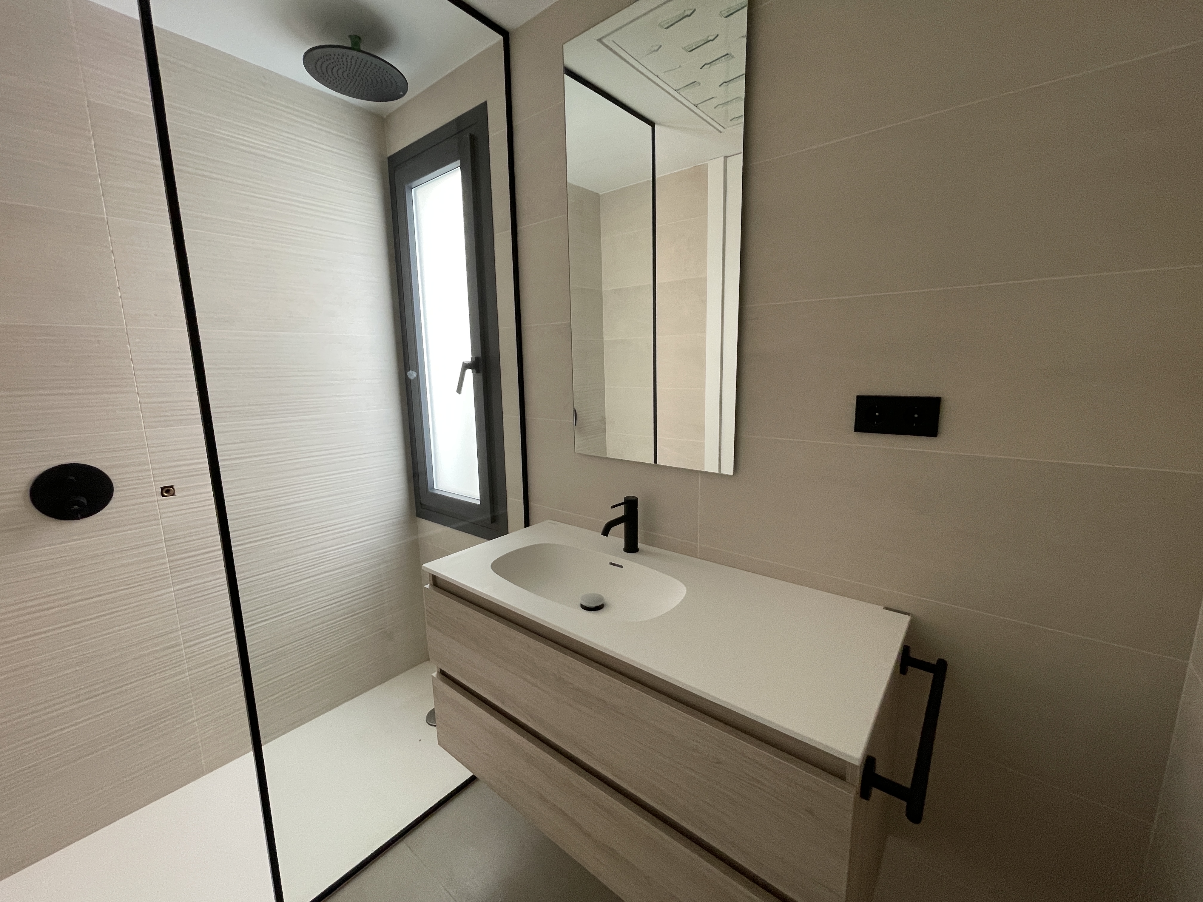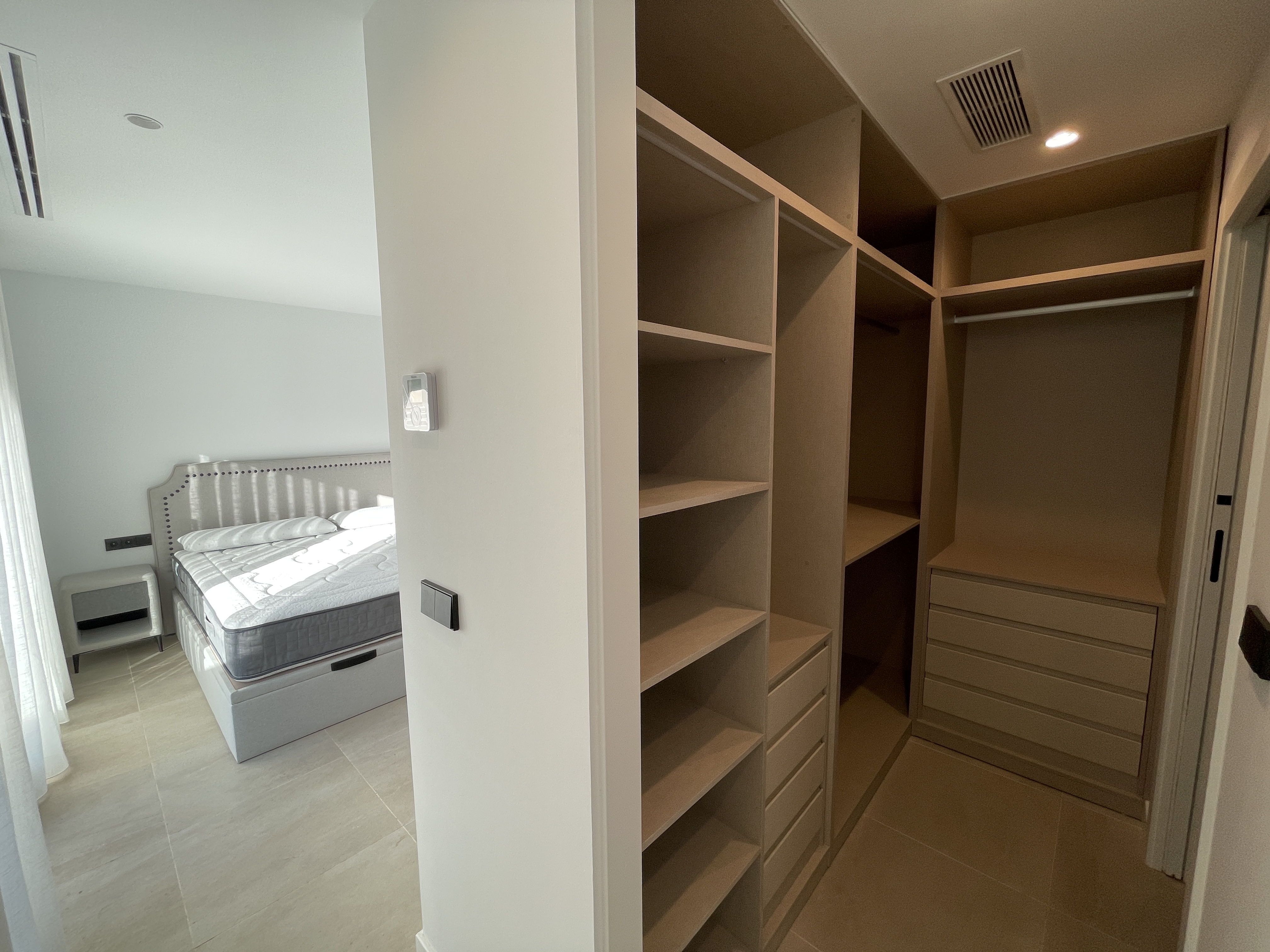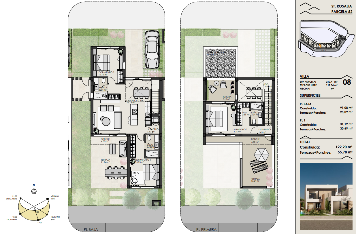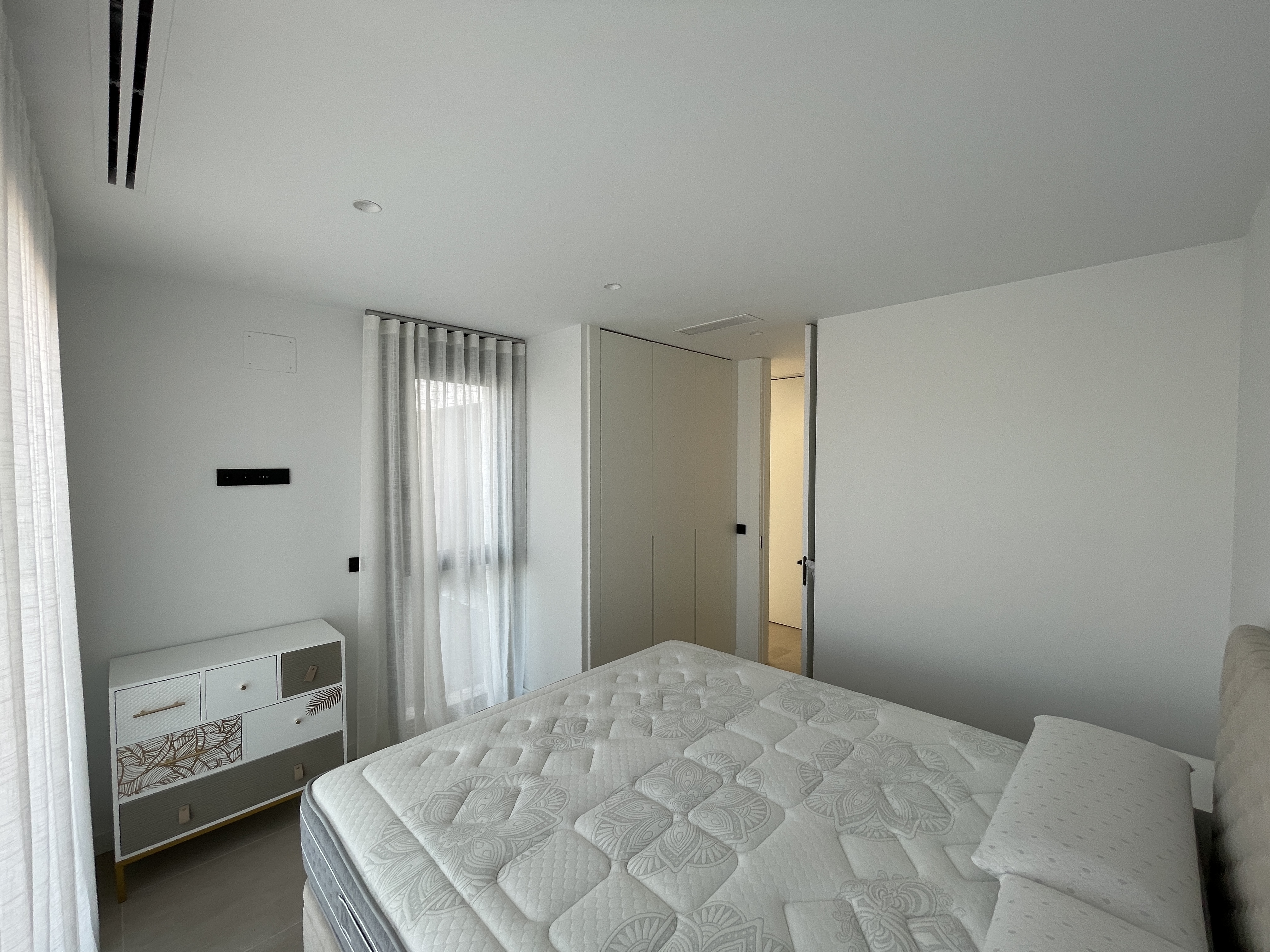 Uno de los dos dormitorios de la planta baja dispone de un lujoso cuarto de baño en suite. El tercer dormitorio se encuentra en la primera planta y también tiene un lujoso cuarto de baño en-suite. Este dormitorio tiene dos terrazas, a ambos lados del dormitorio. Así que siempre puede disfrutar del sol o de la sombra, lo cual es maravilloso. Desde su terraza delantera tiene una amplia vista sobre el complejo y la fantástica laguna Cristal. Tiene la opción de construir una piscina privada en su jardín. Su chalet independiente está equipado con aire acondicionado que también puede calentar, persianas eléctricas e iluminación LED, tanto en el interior como en el exterior. Opcionalmente, puede instalar un sistema domótico para controlar el aire acondicionado, la iluminación y las persianas. Tiene la opción de aparcar su coche en su parcela.