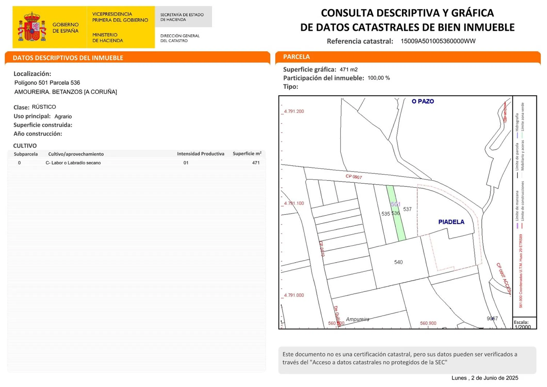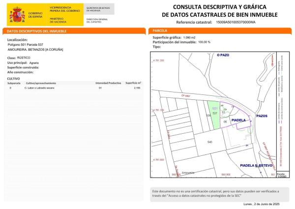Ref: 87. Se venden 2 fincas rústicas contiguas en la parroquia de Piadela, en el municipio de Betanzos, con una superficie total de 2.675 m2: -parcela 1: 2.195 m2 -parcela 2: 480 m2 Ambas fincas están clasificadas como suelo rústico de uso agrario, ideales para actividades agrícolas, huertos familiares o proyectos de cultivo sostenible. Situadas frente al histórico Pazo de Piadela, y a escasos metros de la iglesia de San Esteban de Piadela. El acceso es sencillo desde Betanzos por la carretera AC-542. Este anuncio no es vinculante, puede contener errores, se muestra a título informativo y no contractual.