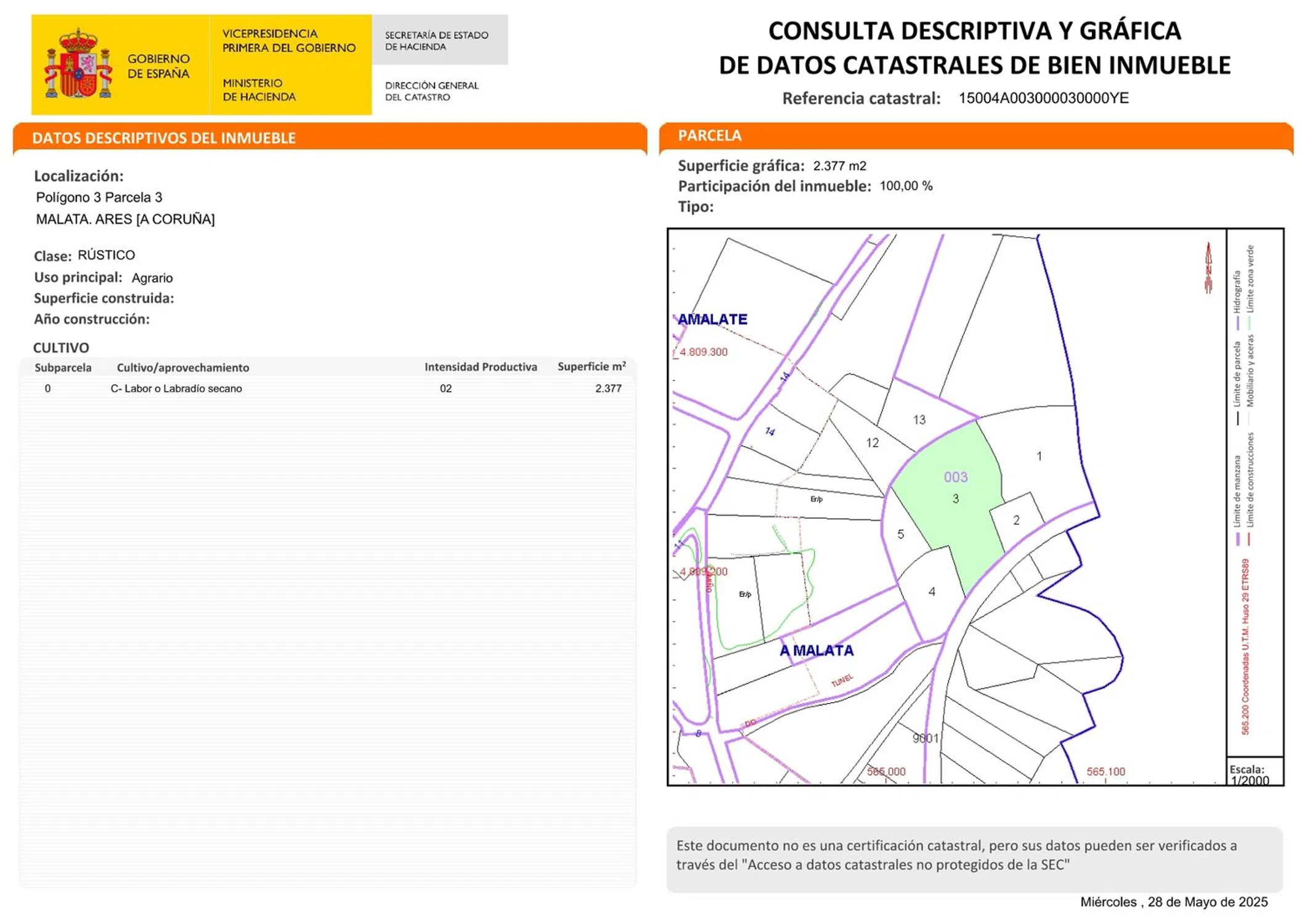 ¡Oportunidad única en A Malata! Este terreno rústico de 2.377 m² se encuentra en el Polígono 3, parcela 3, ideal para quienes buscan un espacio agrario en una ubicación privilegiada. Situado en la carretera que conecta Limodre con Redes, este terreno ofrece un acceso peatonal directo al encantador pueblo de Redes, donde podrás disfrutar de la tranquilidad y la belleza del entorno natural. Aunque no es urbanizable, su ubicación en núcleo urbano lo convierte en una opción perfecta para desarrollar proyectos agrícolas o simplemente disfrutar de la naturaleza. Imagina cultivar tus propios productos o crear un espacio de esparcimiento en un lugar tan accesible y cercano a la vida del pueblo. ¡No dejes pasar esta oportunidad de invertir en un terreno con tanto potencial!