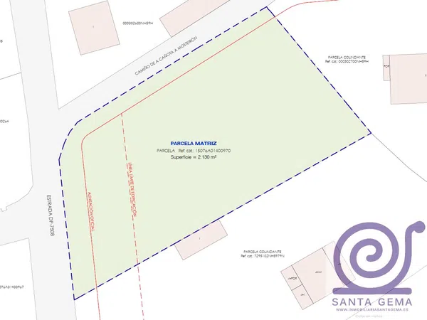 Parcela edificable en A Cañota, Meirás (Sada) Cuenta con una superficie, según Catastro, de 2.130 m². De acuerdo con la ordenanza municipal de aplicación, la parcela se puede dividir en dos nuevas parcelas con superficie neta, después de cesión para viales, de 900 m² cada una, y frente a viales, en ambos casos, superior a los 25 m. Se permite la construcción en cada parcela de una vivienda de superficie construida máxima de 225 m² en planta baja y 225 m² en planta alta. Se permite, además, la construcción de sótano, semisótano y aprovechamiento bajo cubierta, respetando la altura máxima de 7 m. La distancia de la vivienda a linderos y a la línea de cierre será mayor o igual a 3 m. Excelente ubicación en el término municipal de Sada, próxima a una entrada a la Vía Ártabra.