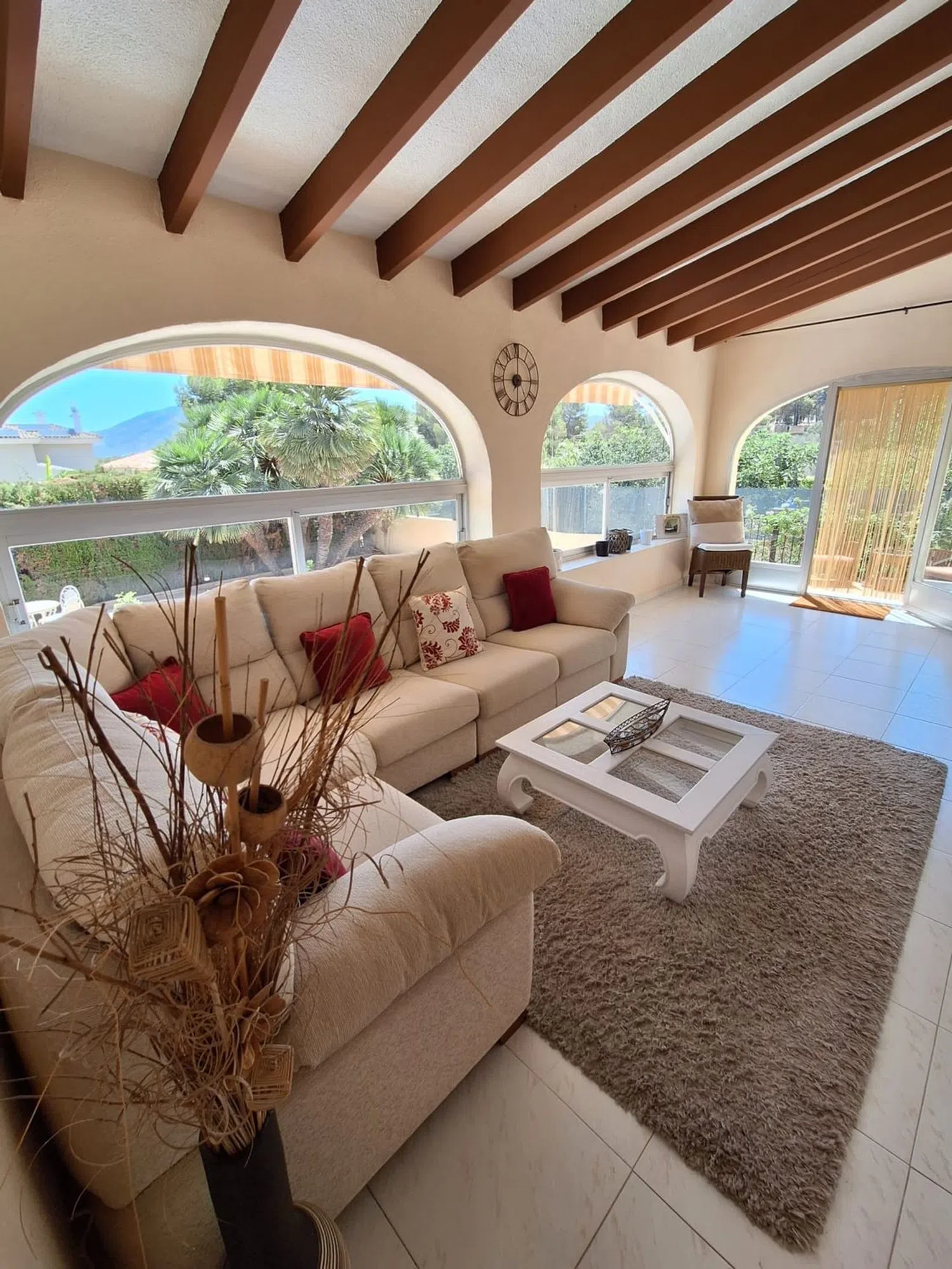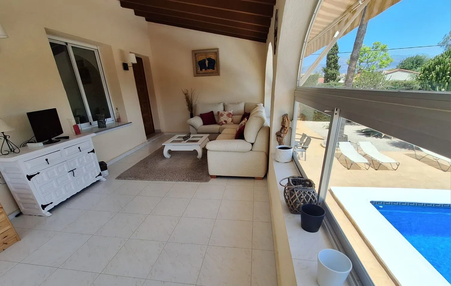 Этот уютный дом предлагает три просторные спальни и две ванные комнаты, что делает его идеальным выбором для тех, кто ценит комфорт и уединение. На территории имеется частный бассейн, позволяющий наслаждаться солнечной погодой региона, а также застекленная терраса, откуда открываются прекрасные виды и проникает естественный свет на протяжении всего года.