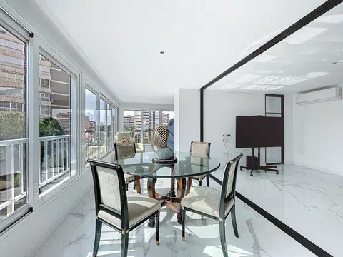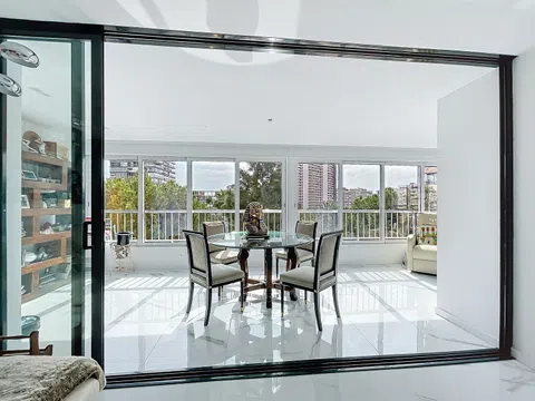 vivienda única en la playa de San Juan, con una superficie de 169 m2. construidos y de 142 m2 útiles. Inmejorable localización en la Avenida de la Costa Blanca, 2.ª LÍNEA DE PLAYA, entre el paseo marítimo y el Centro Comercial Fontana. Ideal también para vivir todo el año, la playa a tres minutos andando y todo tipo de servicio y comercio que te ofrece el entorno del Centro Comercial Fontana para vivir todo el año. Hablemos de la vivienda. Se trata de una vivienda sobre la que se ha realizado una remodelación integral valorada en más de doscientos mil euros, recientemente realizada, obteniendo así esta propiedad espectacular, resultado de un detallado estudio de proyecto de interiorismo, aunando diseño y practicidad utilizando los mejores acabados y detalles exclusivos que hacen de esta vivienda única en la playa de San Juan que hace imprescindible una visita para apreciar cada una de sus cualidades que estamos seguros de que te enamorará nada más entrar en ella. CONSTA DE: recibidor, salón-comedor, cocina de diseño con isla, galería-lavadero, amplia terraza, pasillo, 4 dormitorios con armarios empotrados, además de 1 amplio despacho y 3 baños (uno en suite) DISTRIBUCIÓN: Entramos en la vivienda y el recibidor nos lleva a amplio salón-comedor con cocina de diseño abierta al salón con una gran isla que hace las funciones de office a la vez que nos separa visualmente los ambientes de cocina y salón. En este ambiente, perfectamente integrado y disimulado, tenemos la galería-lavadero. Desde el salón accedemos directamente a un despacho con grandes ventanales que inundan de luz este espacio de trabajo. Volviendo al salón podrás acceder a una grandísima terraza con vistas a zonas verdes, sin vecinos enfrente. Podrás disfrutar de este espacio también en invierno ya que está totalmente acristalada con cerramientos de primera calidad y cristales marca Guardián. A resaltar la carpintería exterior del salón, ya que estas puertas correderas se encuentran integradas completamente con la terraza de tal manera que al abrirlas convierte al salón con la terraza en un espacio único, sin escalones o barreras arquitectónicas. Nos dirigimos a la zona de pasillo-distribuidor y accedemos a los 4 dormitorios, todos exteriores y con armarios empotrados, el dormitorio principal con vestidor. La vivienda cuenta con 3 cuartos de baño (uno en suite). ¿Qué podemos decir del dormitorio principal? Disfrutarás de una auténtica suite de lujo compuesta de un baño de diseño con el cuarto de inodoro independiente dentro del baño y un gran plato de ducha. Dispone de vestidor integrado con puertas de cristal, y un amplio espacio para una cama king size, además del baño y de la ducha también equipa el dormitorio una gran bañera de hidromasaje de diseño, que hará las delicias en tus momentos de relax y disfrute, y por supuesto todo exterior, soleado y luminoso. En definitiva una casa de ensueño que en su conjunto hará que tus deseos se hayan hecho realidad. ¿Una visita? CALIDADES: suelo exclusivo porcelánico de gran formato, pintura lisa, puertas lacadas en blanco, carpintería exterior con perfilería de primera calidad y cristales de aislamiento acústico y solar marca Guardián Select (4+8+4 mm), las del salón integradas en el suelo evitando cualquier tipo de obstáculo o barrera arquitectónica pudiendo unirlo a la terraza logrando así un único ambiente. Todos los dormitorios, despacho y salón-comedor con splits de aire acondicionado frio y con bomba de calor además de preinstalación en toda la vivienda para instalar si se desea la climatización por aerotermia (valorada en más de quince mil euros). Instalación eléctrica de primera calidad con multitud de enchufes, interruptores e iluminación indirecta de led en todos los ambientes. PARKING COMUNITARIO, plaza asignada en verano, resto del año parking sin numerar con numerosas plazas disponibles.URBANIZACIÓN PRIVADA. Una de las mejores de la pl.
