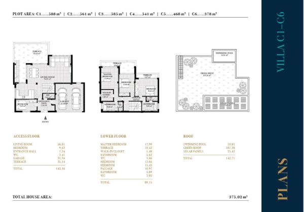 Виллы предлагают более 200 м² жилой площади, распределенной на двух надземных этажах, нижнем этаже и террасе для солнечных ванн с панорамным видом на море и горы. На первом этаже находится прихожая с выходом в гараж, просторная гостиная-столовая с открытой кухней, выход на основную террасу, спальня и гостевой санузел. На втором этаже расположены 3 спальни с двуспальными кроватями и 2 ванные комнаты (одна из которых с собственной ванной). Главная спальня оборудована просторной гардеробной и имеет доступ к частной террасе площадью от 10 до 20 м², к которой также имеет доступ вторая спальня. Все комнаты имеют большие окна с видом на море и горы.