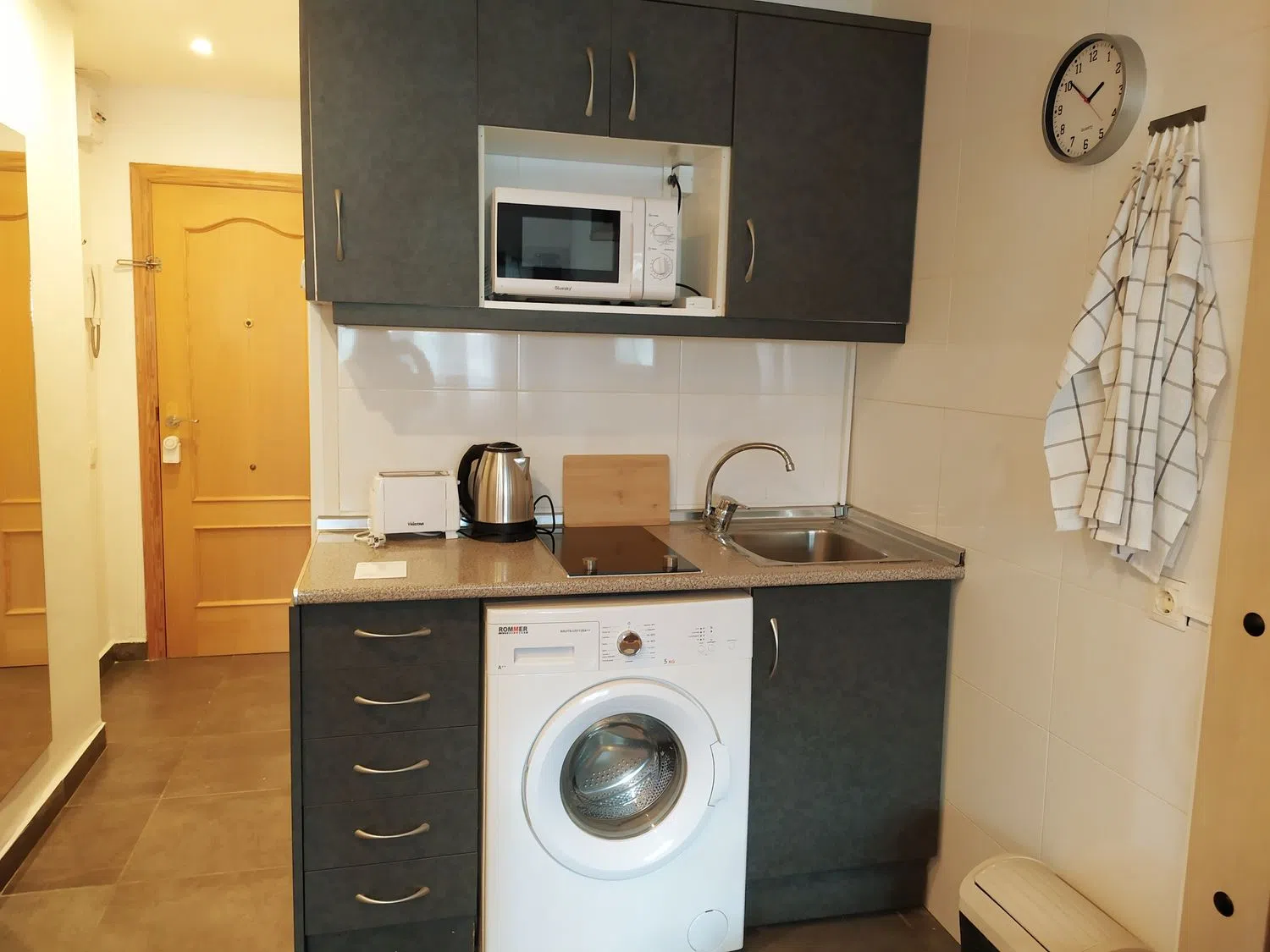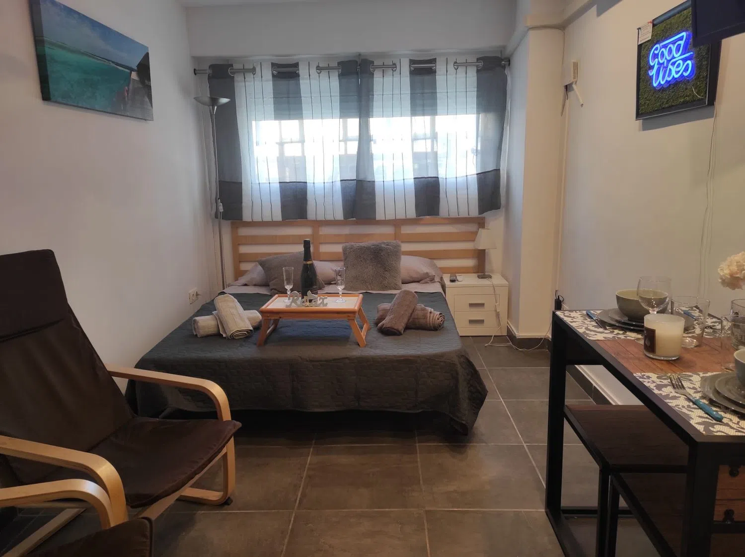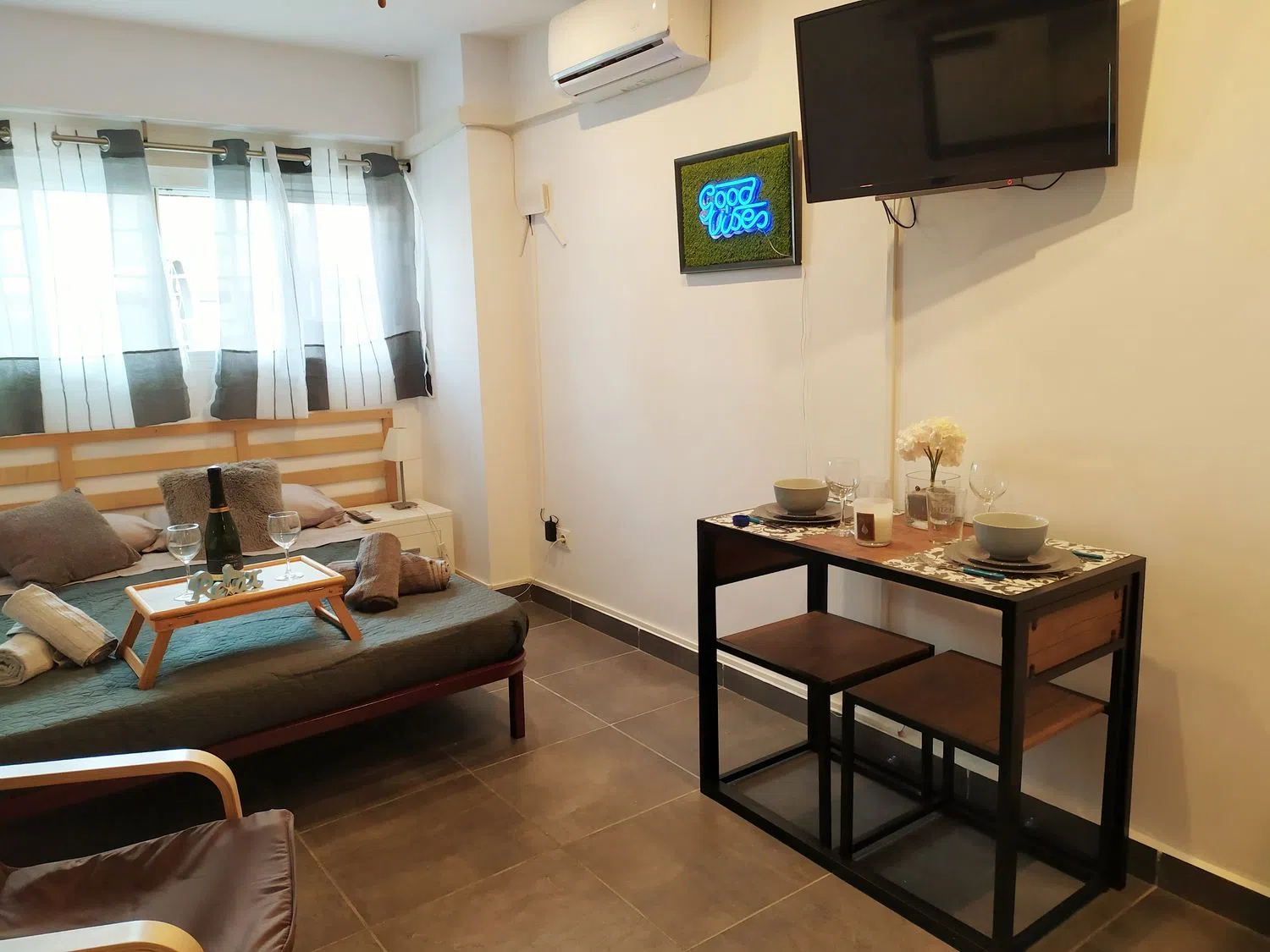 •Современный и обновленный дизайн: этот уютный студийный апартамент отличается открытой планировкой, где комфортабельная спальня соединена с кухней, оборудованной современными бытовыми приборами, такими как холодильник, индукционная плита на две конфорки, стиральная машина, микроволновая печь и многое другое. Все, что нужно для лёгкой и практичной жизни!