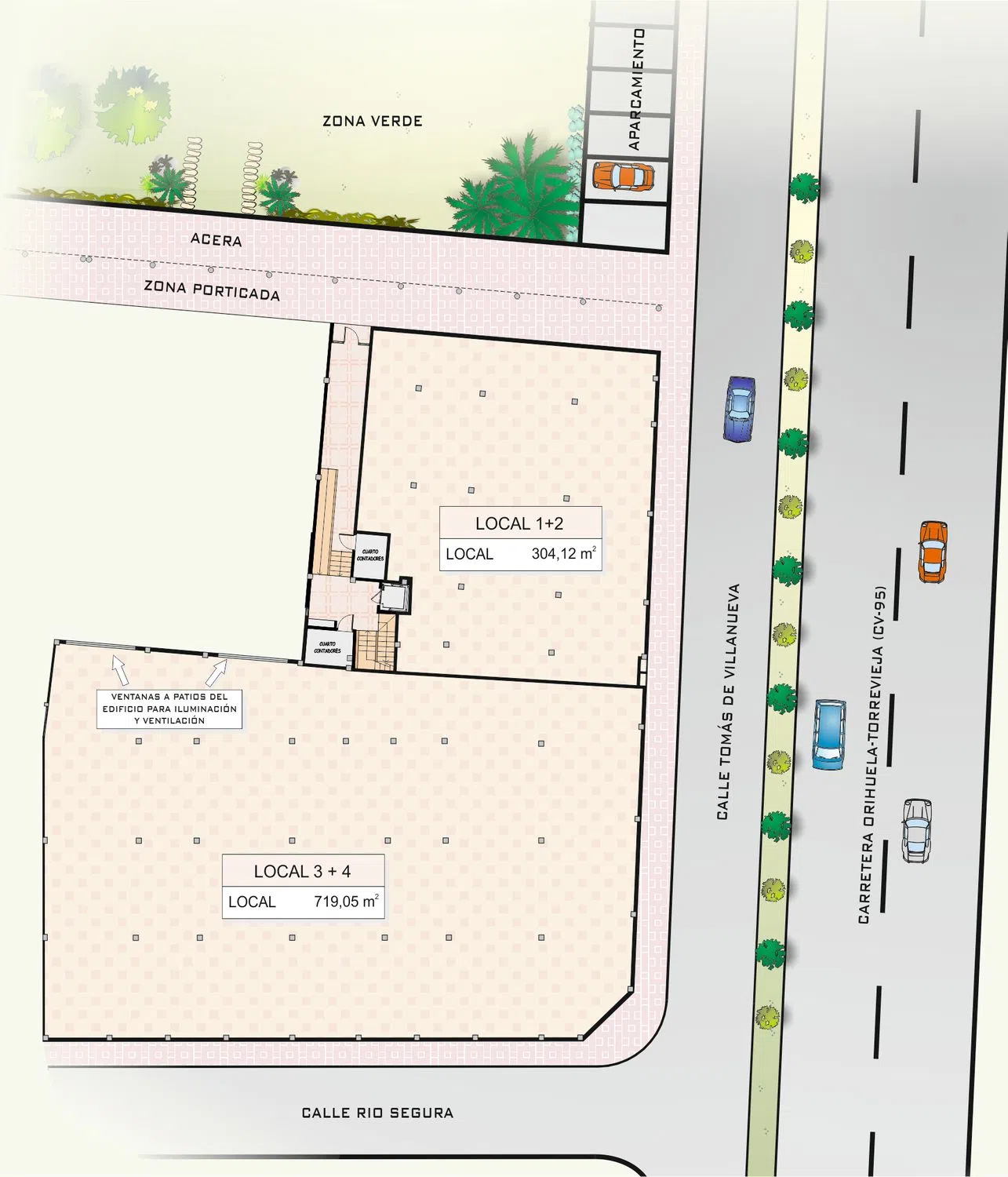 Local comercial en venta en Bigastro. Local comercial frente a parque municipal, de 1.023 m2 construidos, con posibilidad de incluir plaza de aparcamiento cerrado para dos vehículos (37 m2) comunicada directamente con el local. - Venta: 450.000 € + IVA. - Alquiler: 1.500 €/mes + IVA Posibilidad de división en locales más pequeños: - Local de 304,12 m2 (Venta: 200.000 € + IVA)(Alquiler: 700 €/mes + IVA). - 719,05 m2 (Venta: 260.000 € + IVA)(Alquiler: 850 €/mes + IVA).