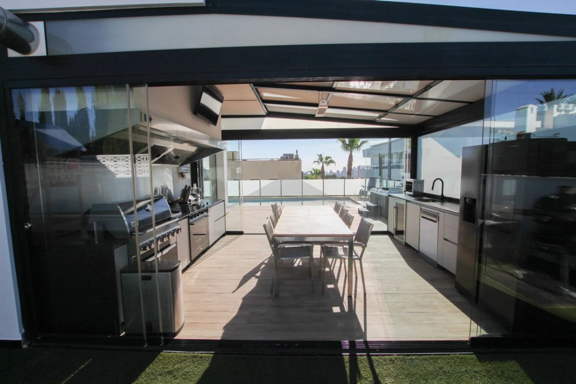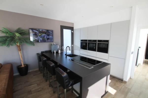 Descubre esta magnífica villa contemporánea situada en el corazón de Calpe. Construida en 2018 sobre una parcela de 835 m² y con 421 m² habitables, cada detalle ha sido diseñado para combinar confort, modernidad y luminosidad. Orientada al sur, disfruta de una óptima luz solar durante todo el día. La planta baja se organiza alrededor de un salón de 50 m² con una cocina americana de alta gama. Amplios ventanales crean una armonía perfecta entre el interior y el exterior. Dos habitaciones con acceso directo a la terraza, un elegante baño y un aseo completan este nivel. Detalle ingenioso: un conducto conecta directamente el área de descanso con el lavadero del sótano para simplificar la rutina diaria. En la planta superior, la suite principal de 33 m² es un verdadero refugio con baño privado, doble lavabo y vestidor. También cuenta con una gran terraza soleada con vista al mar y al Peñón de Ifach. Los exteriores invitan a la relajación: piscina de 10x4 m, jacuzzi, sauna, área chill-out, columpios y cuatro terrazas que ofrecen diferentes ambientes. Una cocina de verano acristalada de 30 m², equipada como un restaurante (barbacoa, frigorífico americano, bodega, electrodomésticos profesionales). Un apartamento independiente de 50 m², equipado con su kitchenette, salón, oficina y baño, perfecto para recibir o convertir en sala de cine o gimnasio. El garaje doble, seguro y espacioso, permite estacionar hasta cuatro coches y varias motos. La villa también dispone de un lavadero, espacios de almacenamiento, aire acondicionado reversible, un sistema domótico completo, videovigilancia y paneles solares, garantizando confort y eficiencia energética. Su ubicación es ideal: comercios accesibles a pie en cinco minutos.