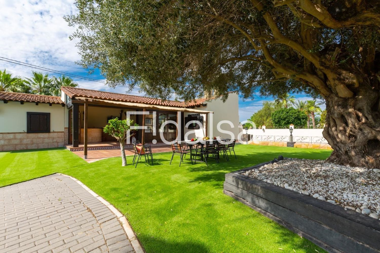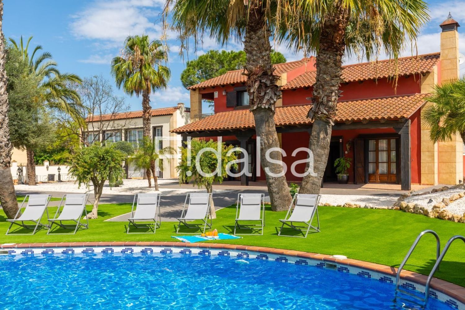 На территории есть сад, меблировка для отдыха на улице, огороженная территория, терраса площадью 200 м², зона для барбекю, камин, доступ в Интернет (Wi-Fi), сушилка, балкон, детская площадка и система отопления с тепловым насосом. Также предусмотрены кондиционеры, частный бассейн и крытая парковка на пять автомобилей, с возможностью дополнительной парковки на улице.