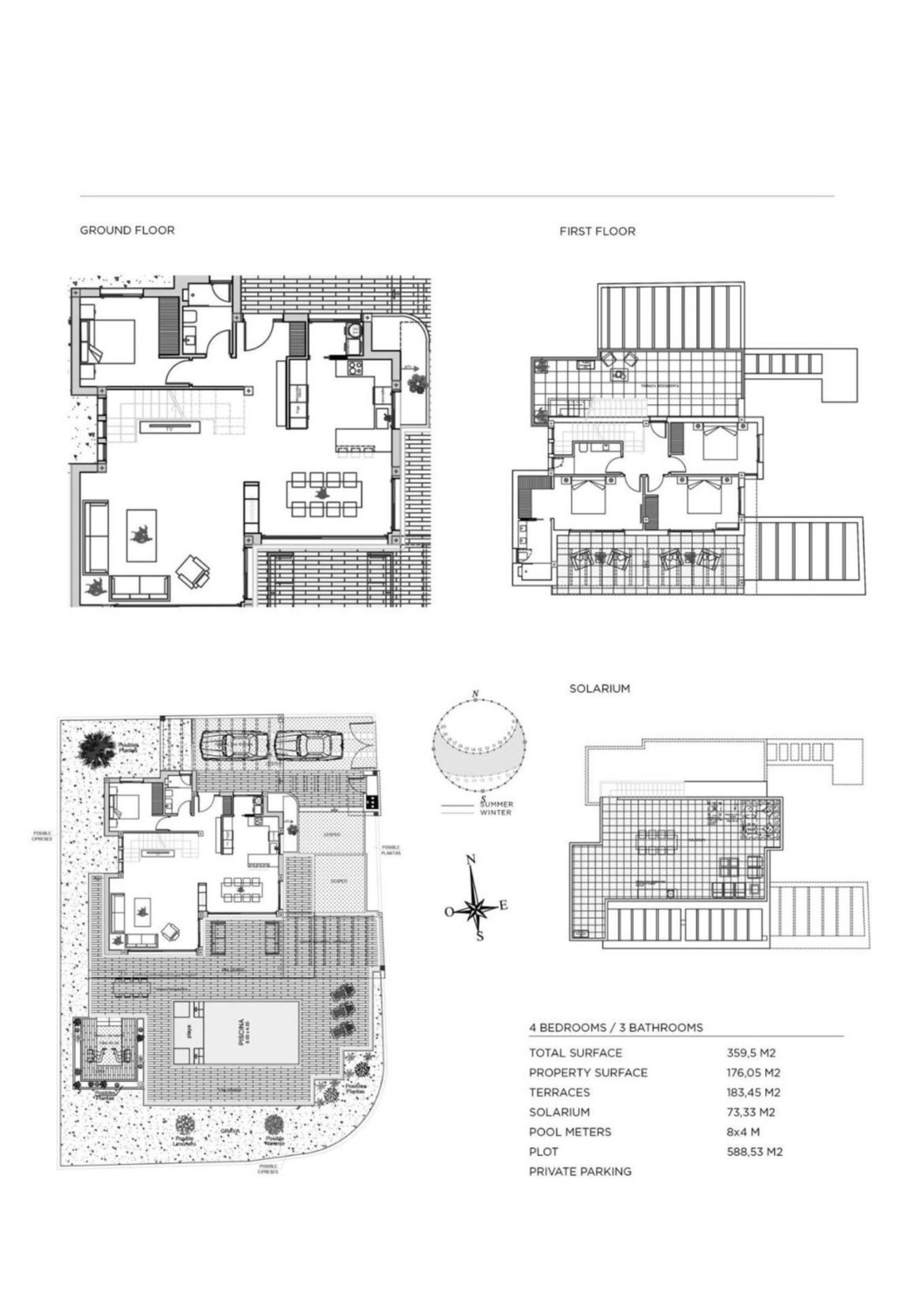 Собственный сад с бассейном, терасса и солярий позволяют наслаждаться солнечными днями на свежем воздухе. Удобное расположение обеспечивает близость ко всем необходимым услугам, включая супермаркеты, гольф-поля и рестораны, а также медицинские учреждения.