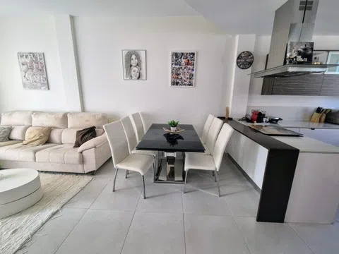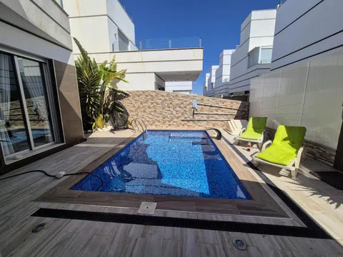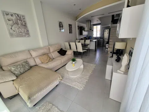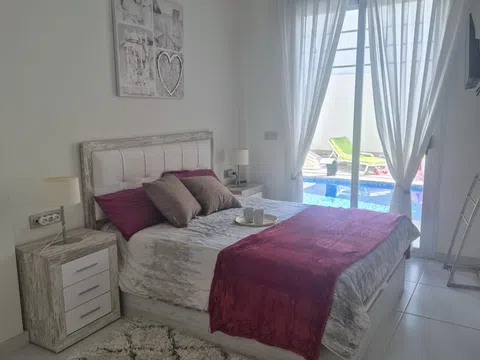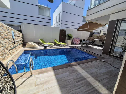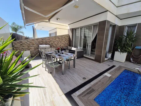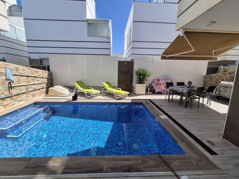 Espectacular chalet independiente, con 3 dormitorios, 2 baños y un aseo, piscina privada, área de barbacoa, solárium terraza acristalada, garaje. con todas las comodidades requeridas para vivir permanentemente, es una chalet de tres plantas al entrar nos encontramos con un pasillo que nos conduce hasta una habitación doble con baño privado y salida directa a la piscina, luego tenemos un aseo y encontramos la cocina abierta integrada en el salón comedor el cual tiene salida a la terraza, en el primer nivel tenemos dos dormitorios uno de ellos con acceso a la terraza techada y el otro dormitorio con balcón, también hay un baño es este nivel y en el segundo nivel encontramos un solárium, el cual tiene una parte con un toldo y una cama para poder hacer una buena siesta, también tiene un trastero. Este impresionante chalet es muy moderno tiene persianas eléctricas en todas las ventanas, tiene aire acondicionado y calefacción en cada planta con lo cual son independientes y se vende totalmente amueblado, tiene orientación sur con lo cual en la piscina hay sol todo el día. Tiene una ubicación excelente porque esta cerca de todos los comercios.