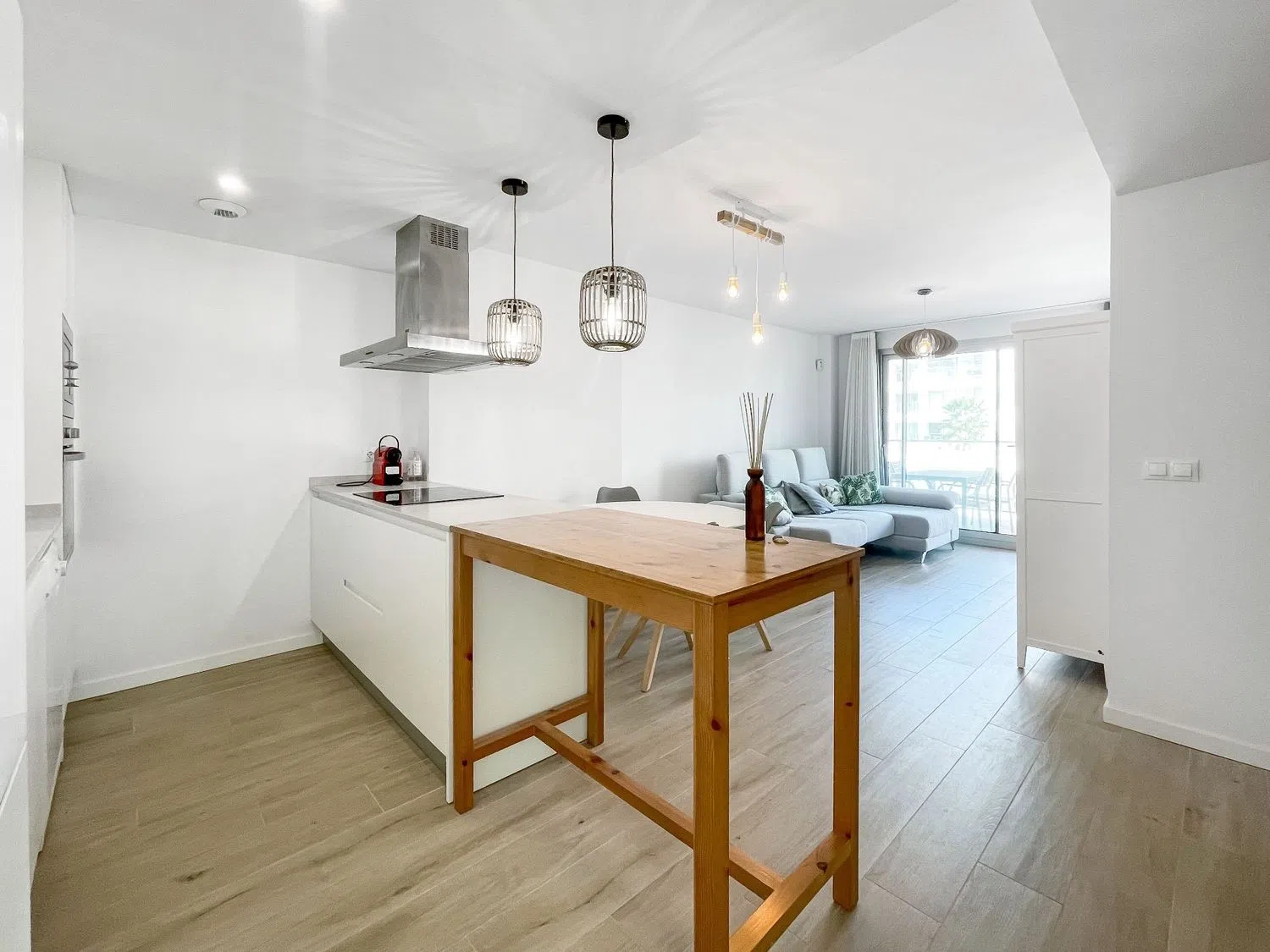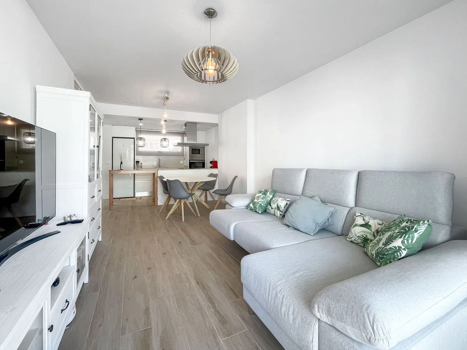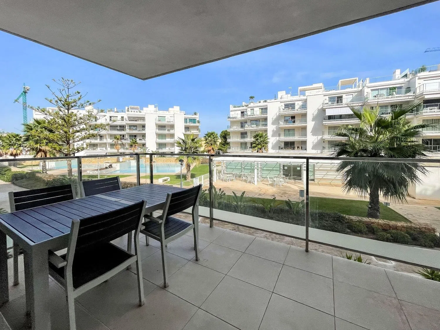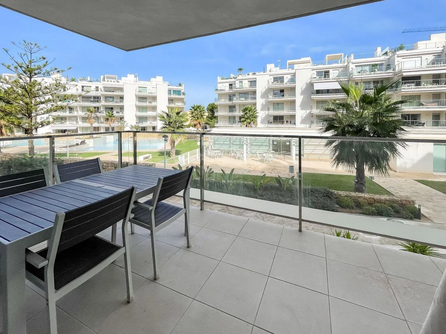 Внутри квартиры располагается светлый просторный салон-столовая с большими окнами, выходящими на частную террасу с видом на бассейн, что создает идеальные условия для размещения диванов и наслаждения отдыхом на свежем воздухе. Открытая кухня полностью оборудована современными бытовыми приборами и шкафами для хранения, что позволяет создать уютное и комфортное пространство для приготовления пищи и семейных мероприятий.