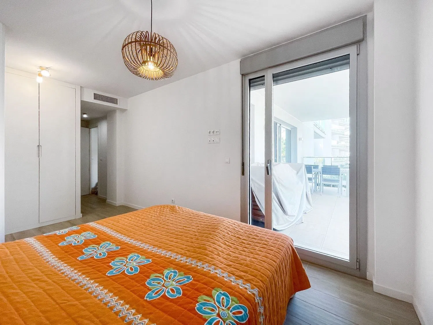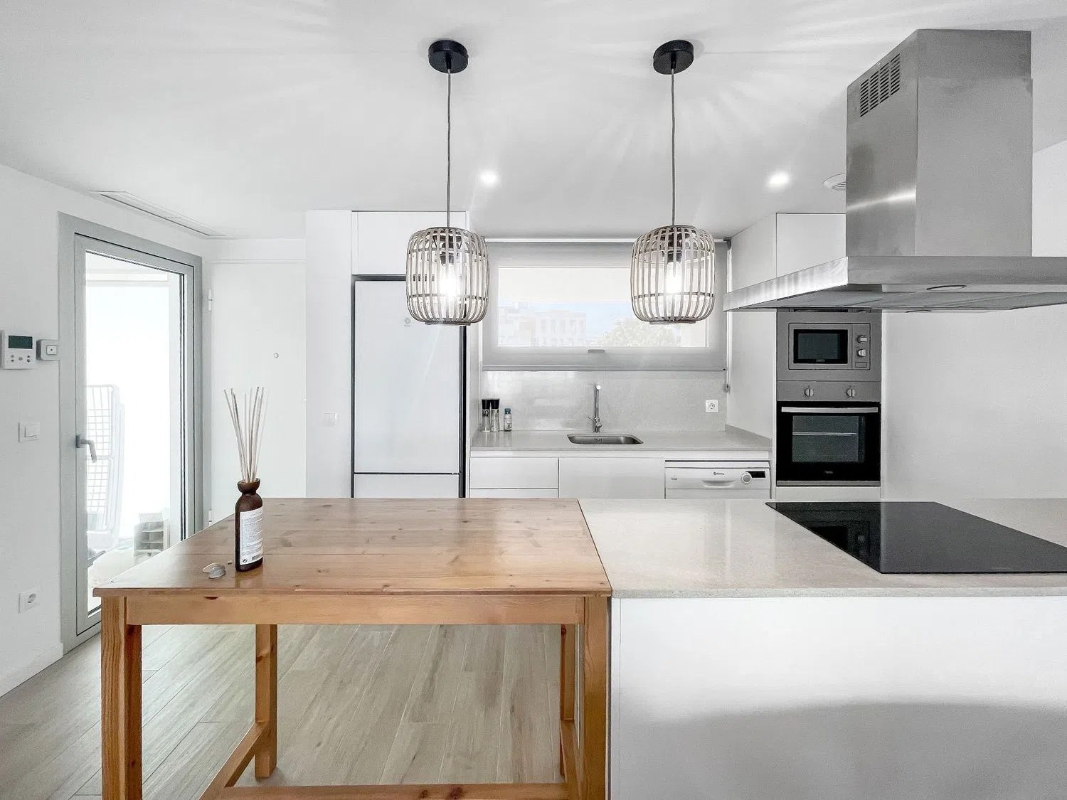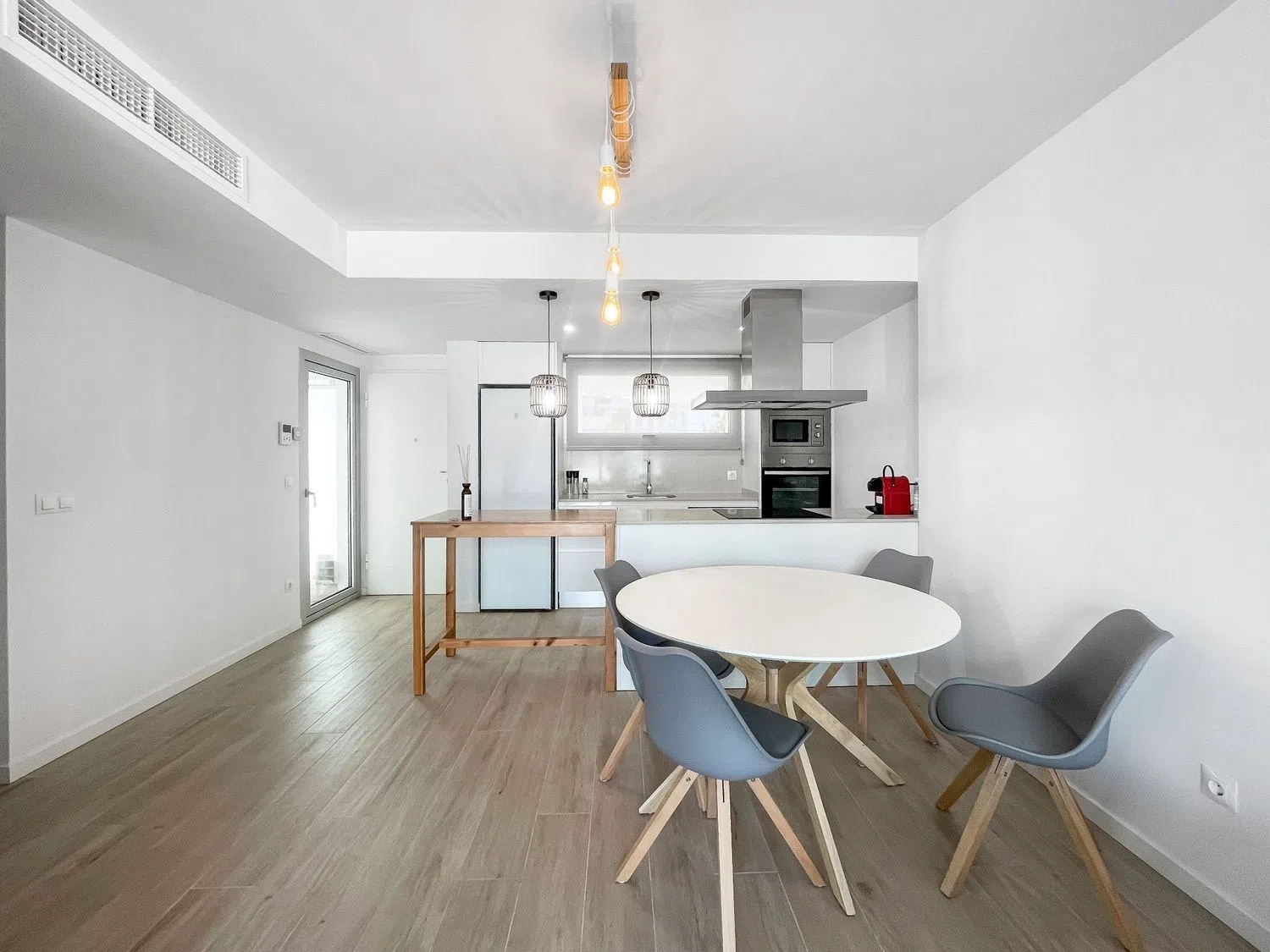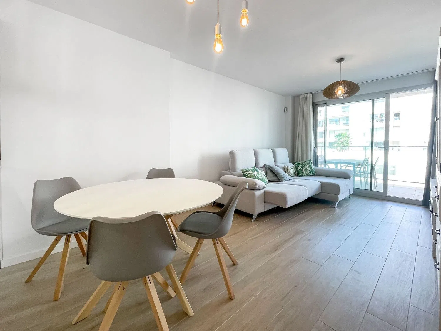 Внутри квартиры располагается светлый просторный салон-столовая с большими окнами, выходящими на частную террасу с видом на бассейн, что создает идеальные условия для размещения диванов и наслаждения отдыхом на свежем воздухе. Открытая кухня полностью оборудована современными бытовыми приборами и шкафами для хранения, что позволяет создать уютное и комфортное пространство для приготовления пищи и семейных мероприятий.