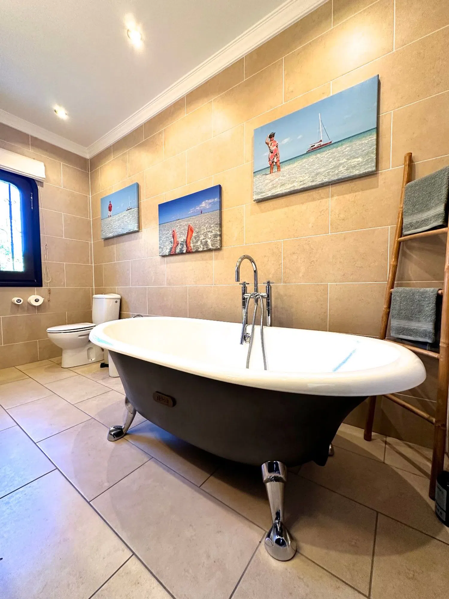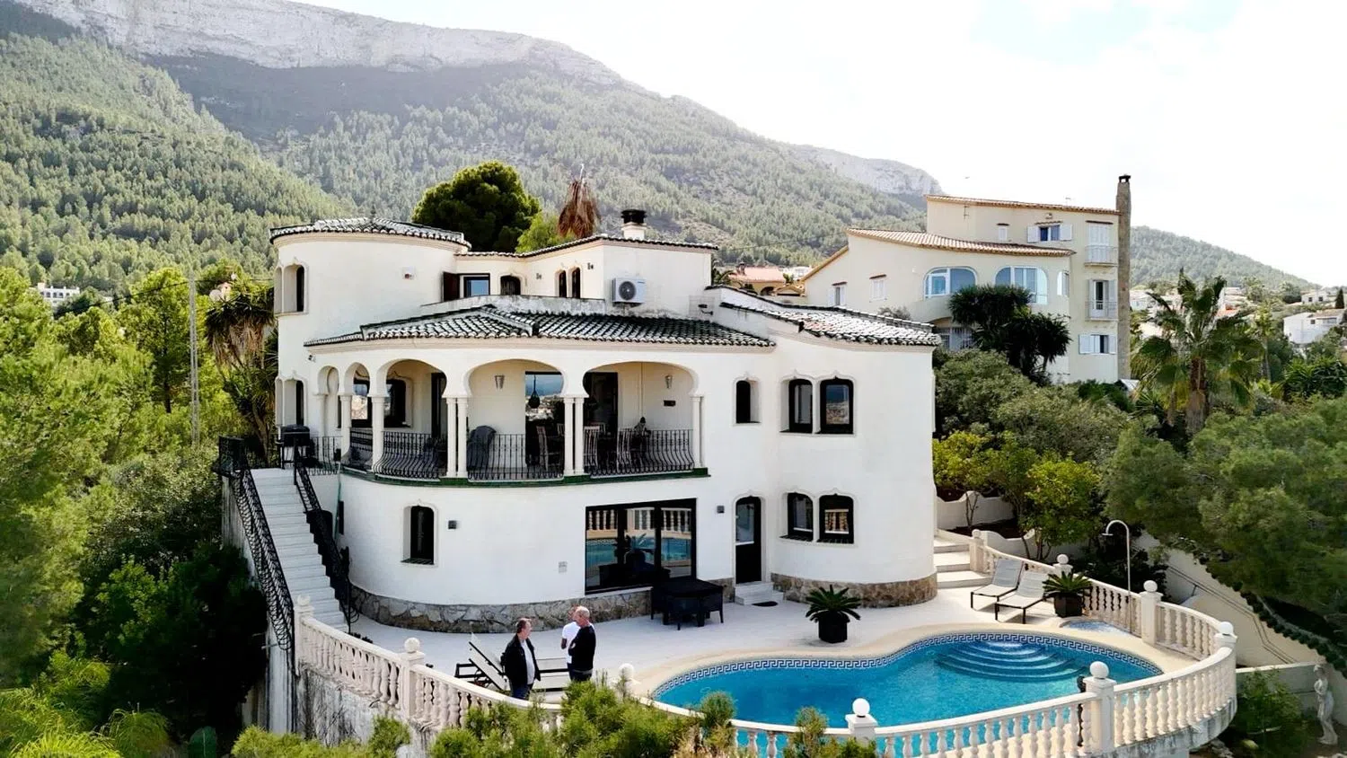 На верхнем уровне находится отдельная гостиная, спальня с ванной комнатой и большая солнечная терраса с впечатляющим видом. На нижнем уровне располагается просторная квартира для гостей с отдельной гостиной и столовой, полностью оборудованной открытой кухней, а также двумя дополнительными спальнями с двумя ванными комнатами. С террасы можно напрямую попасть к подогреваемому бассейну размером примерно 10 x 5 м с глубиной 2,40 м и наружным душем.