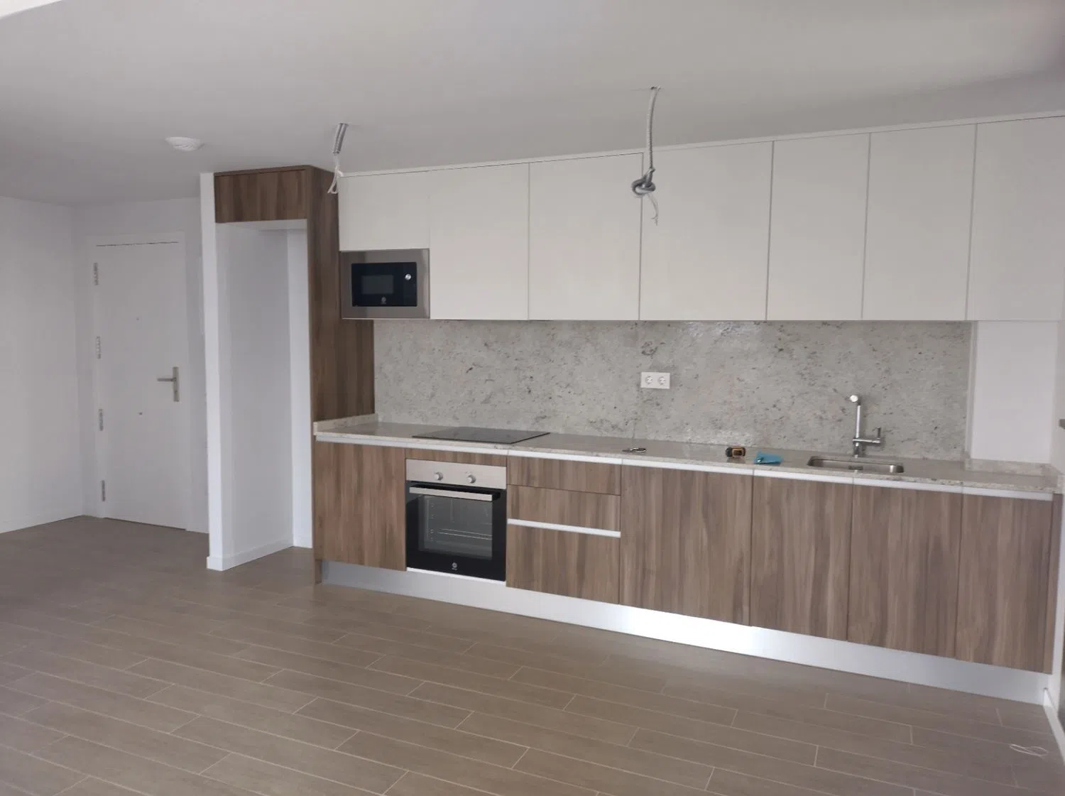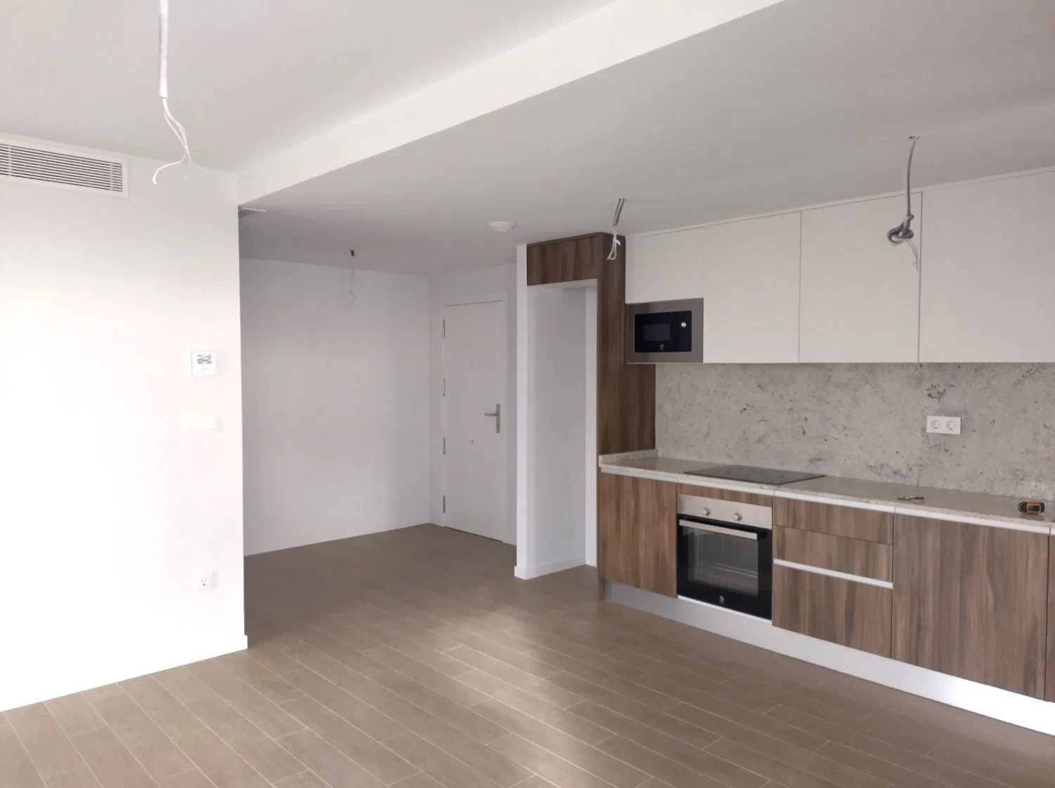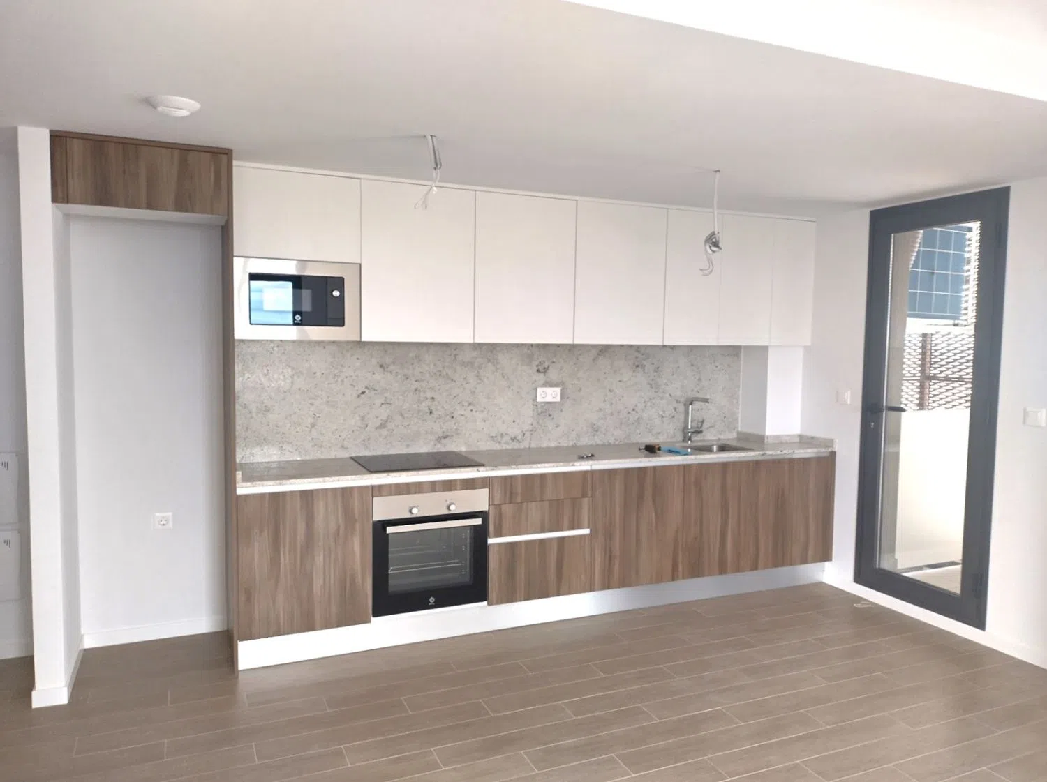 Кухня оборудована современными устройствами, включая духовой шкаф, индукционную плиту, фильтровую группу и мойку из нержавеющей стали под столешницей с однорычажным смесителем, а также холодильником и посудомоечной машиной. Индивидуальная система аэротермального отопления обеспечивает горячую воду, а система кондиционирования с вентиляционными каналами позволяет поддерживать комфортную температуру в любое время года.