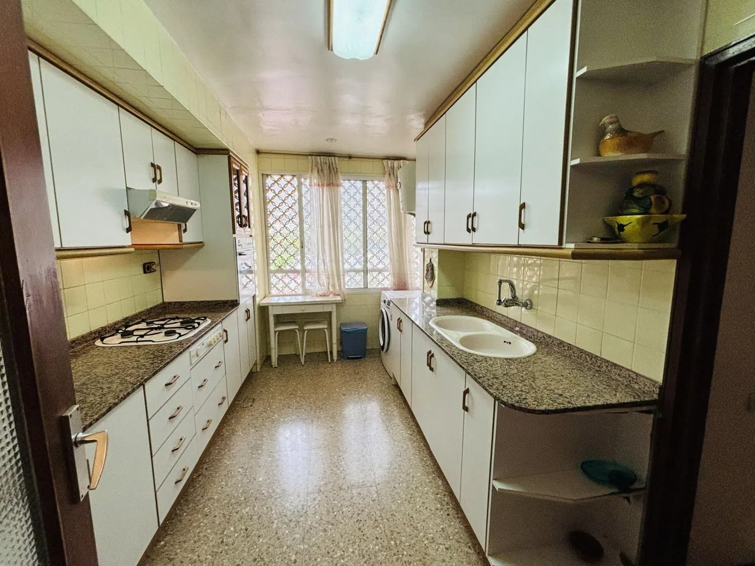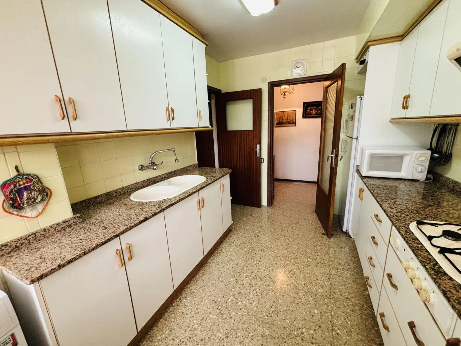 Кухня полностью оснащена всем необходимым, а среди дополнительных удобств можно выделить встроенные шкафы, лифт, многофункциональную площадку и общий бассейн. Квартира расположена на четвертом этаже, выходит на угол здания и находится в очень спокойном районе, в непосредственной близости от автобусной остановки и недалеко от станции трамвая.