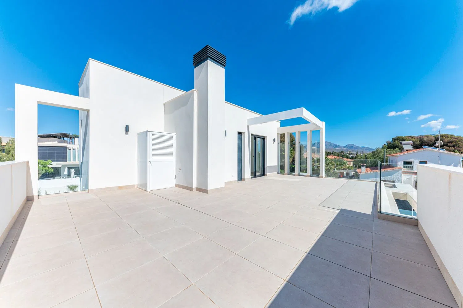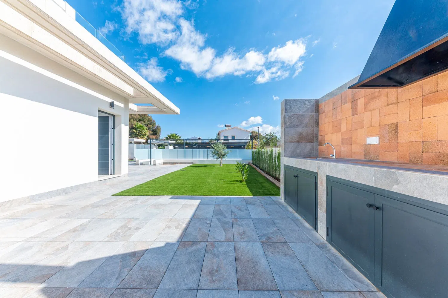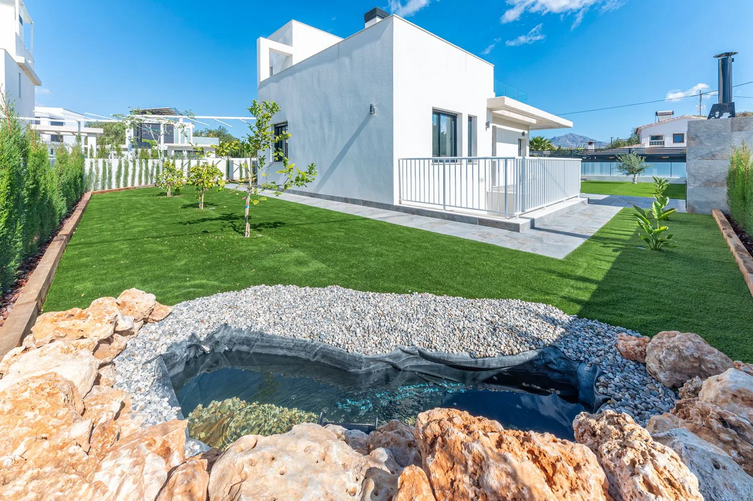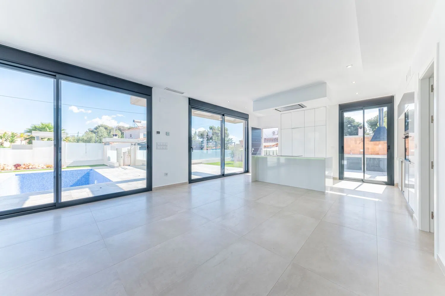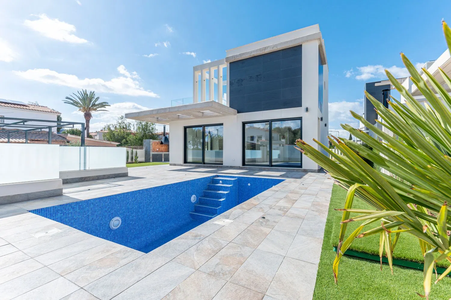 К числу выделяющихся удобств относятся частная парковка, кондиционирование воздуха, окна с двойным остеклением, система «умный дом», а также кухня, оборудованная современными бытовыми приборами. Вилла расположена всего в 400 метрах от пляжа, обеспечивая лёгкий доступ к услугам и ближайшей автодороге, что позволяет удобно добираться до аэропорта и других городов.