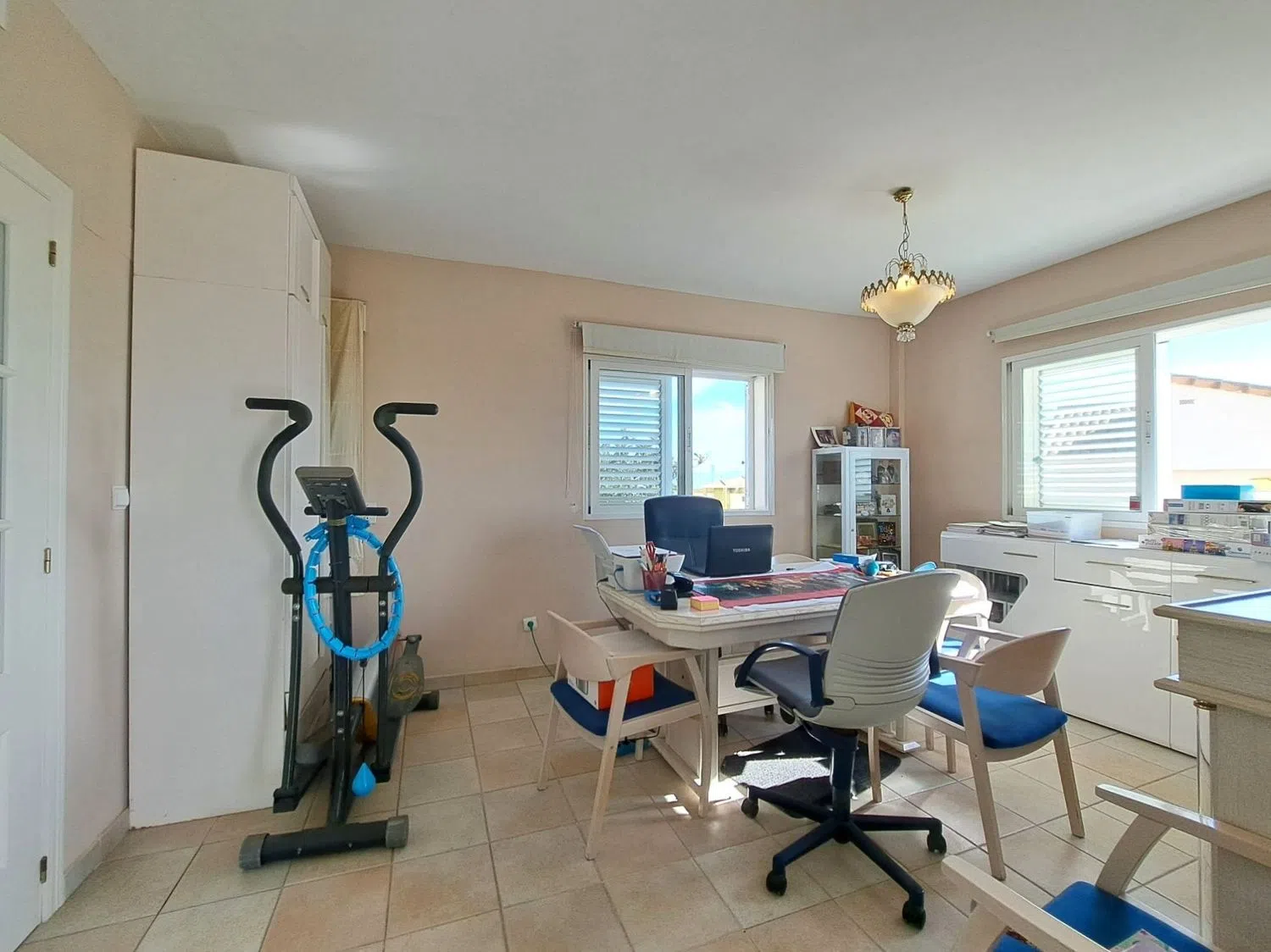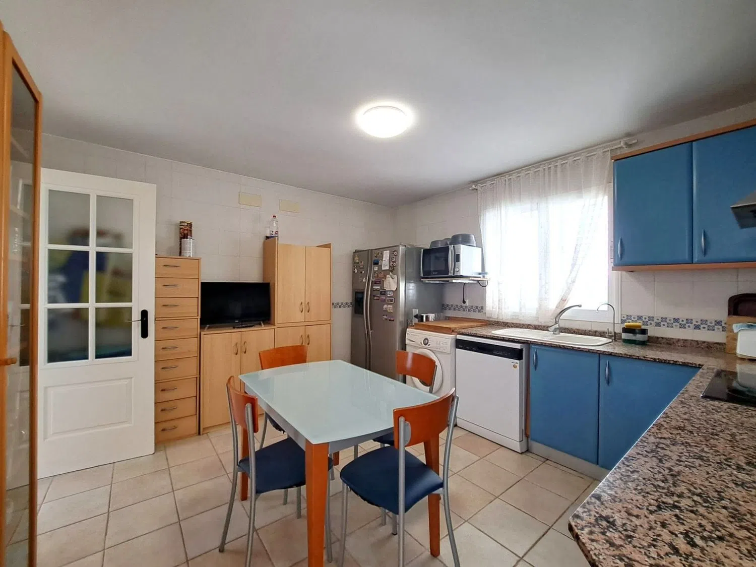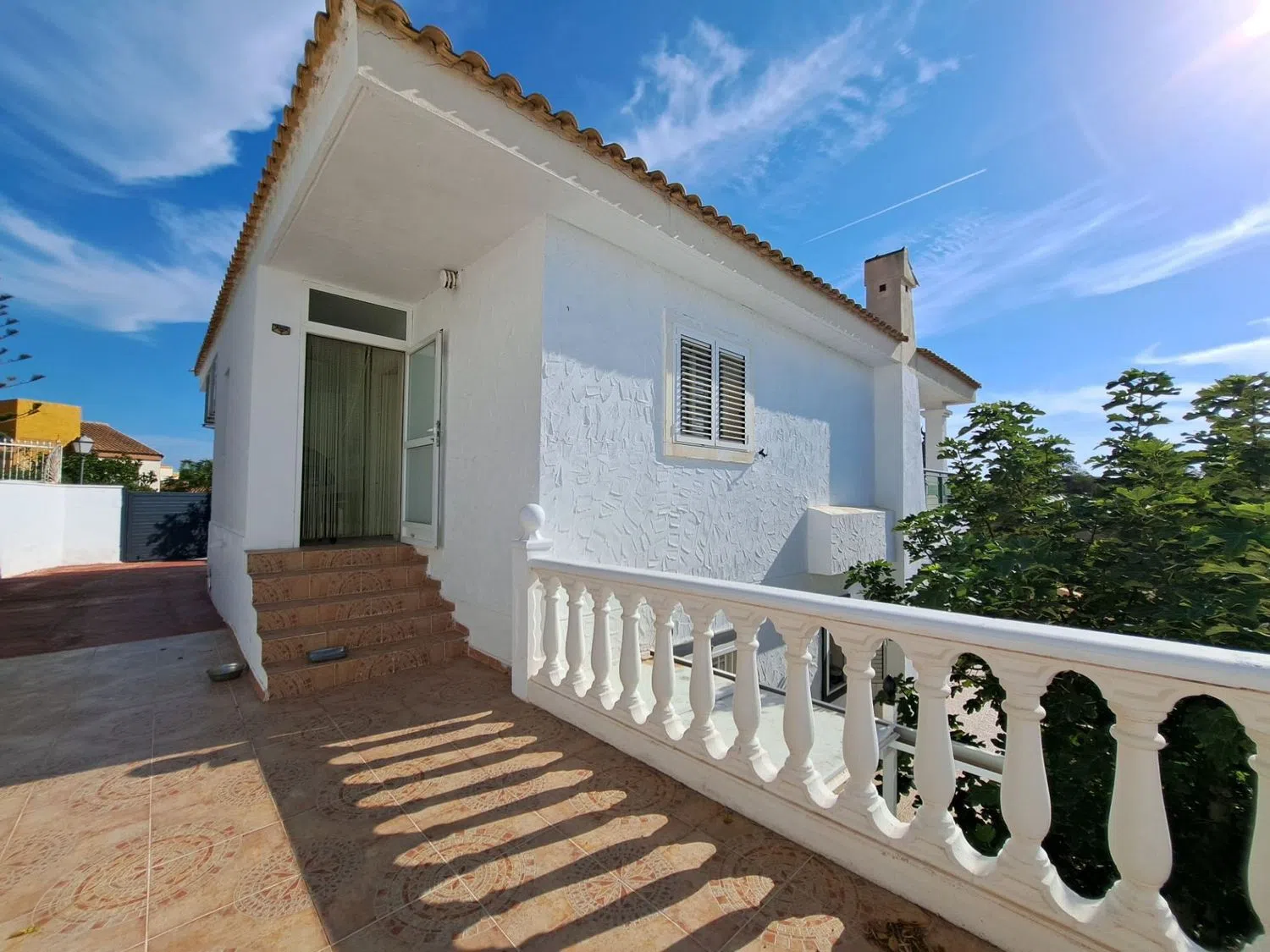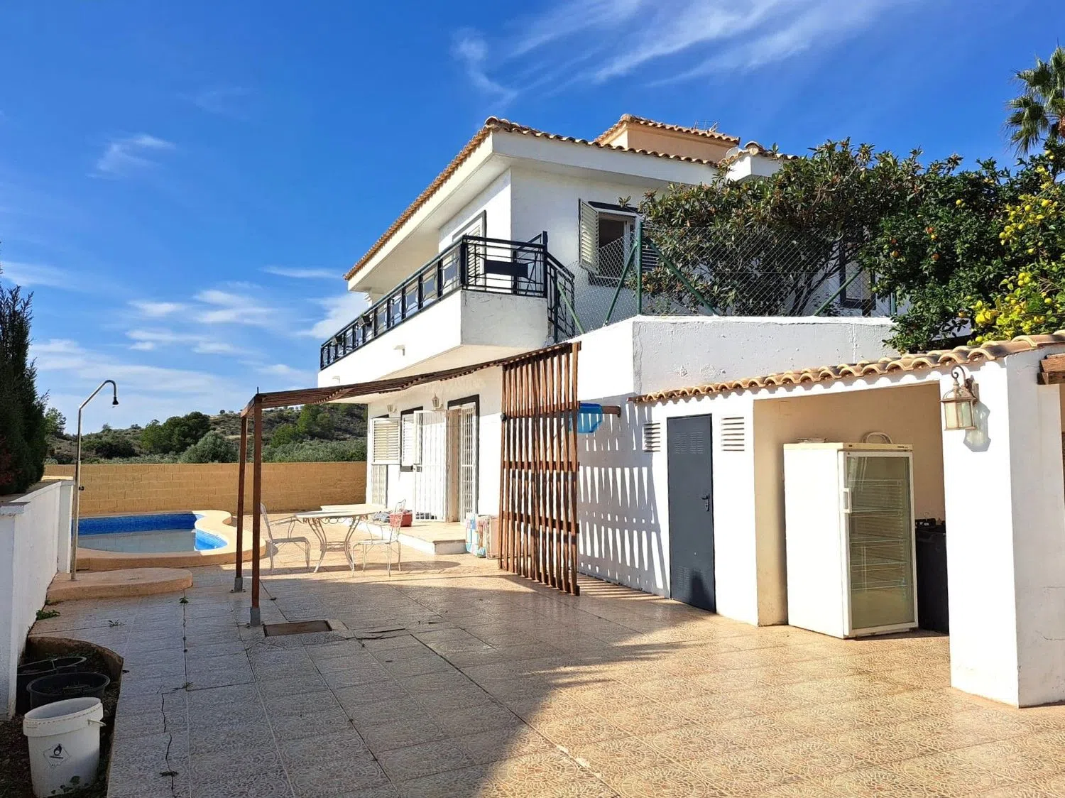 На внешней стороне дома вас ждет частный бассейн, просторное подсобное помещение, терраса и различные фруктовые деревья. У дома есть вся необходимая бытовая техника, системы кондиционирования воздуха с функцией охлаждения и обогрева, а также автоматические ворота для удобного доступа.
