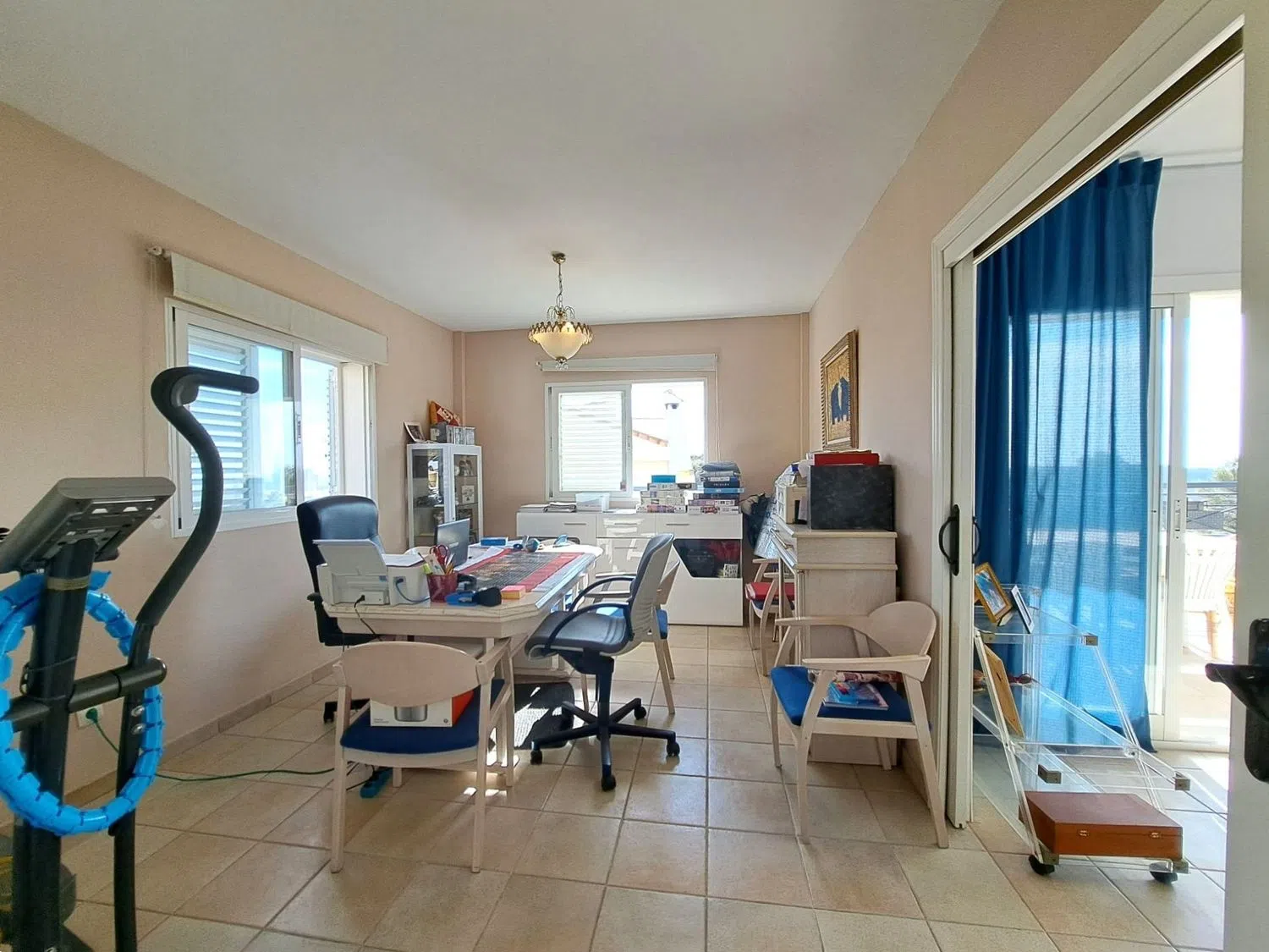 На нижнем этаже располагается особенно просторная главная спальня с гардеробной, ванная комната с ванной и выходом на бассейн, вторая спальня с ванной комнатой и душем, а также два дополнительных спальни (одна из них переоборудована в гардеробную) и третья ванная комната с душем.