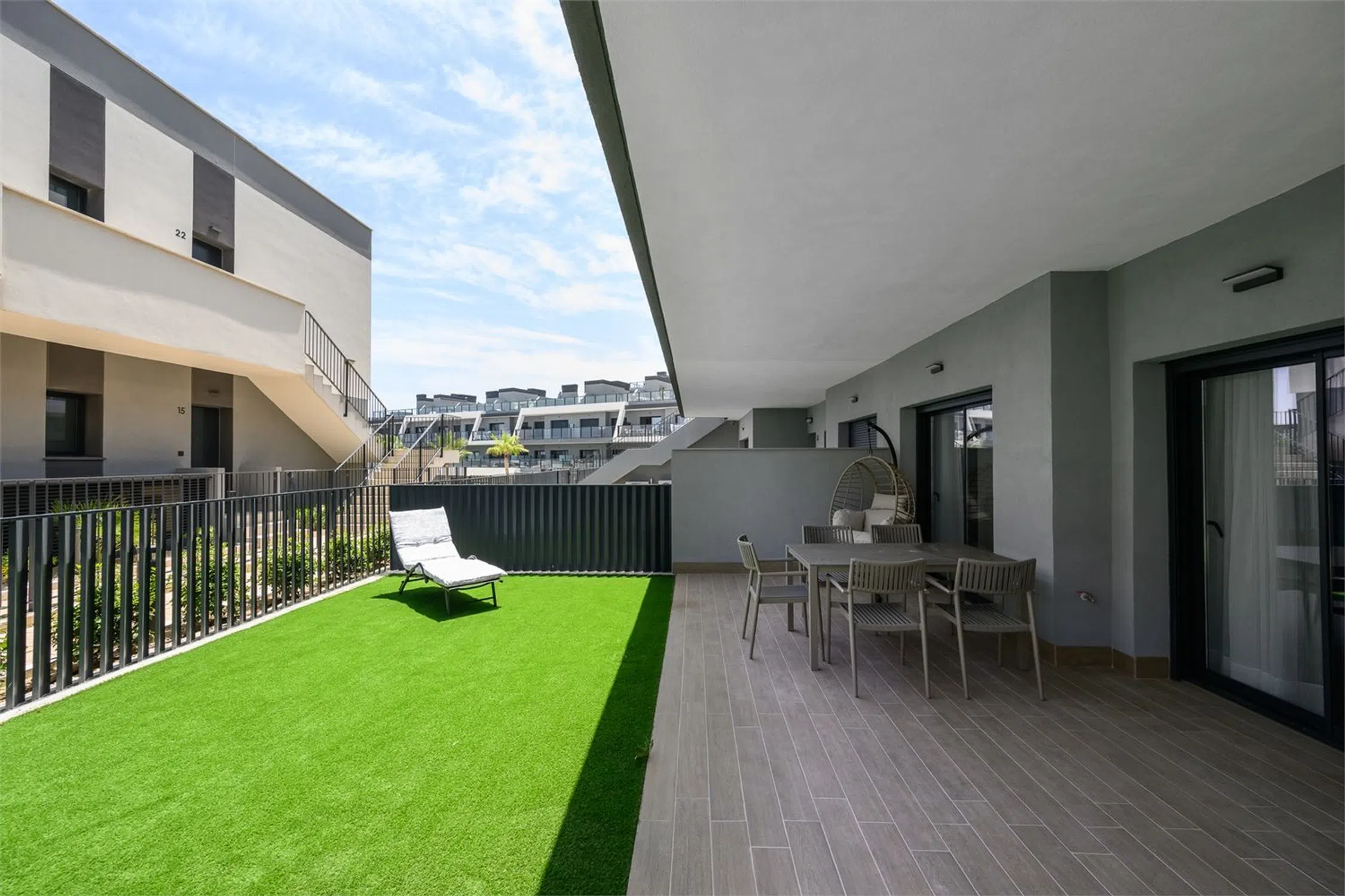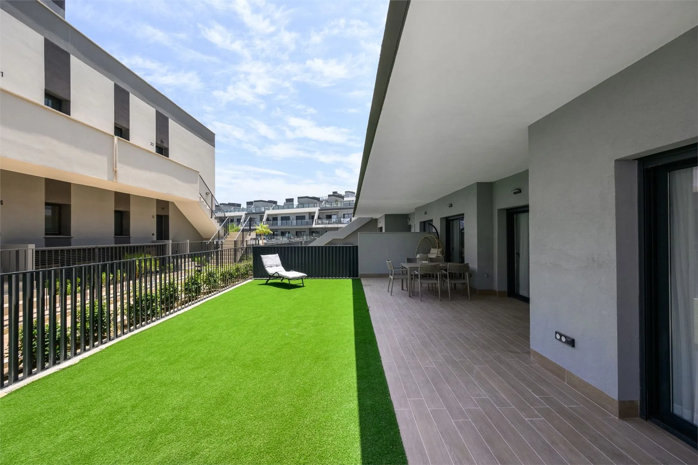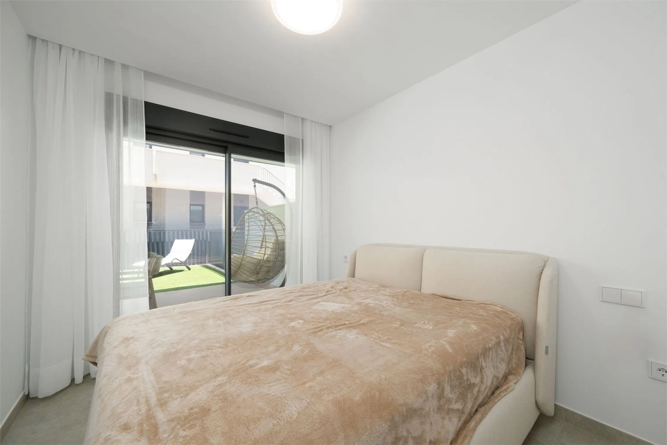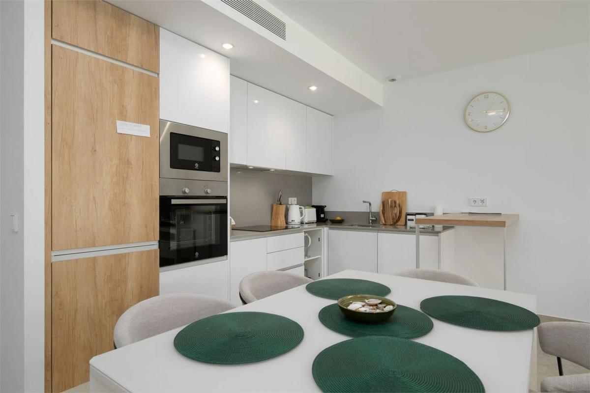 Vivienda con estilo y gran terraza! Te presentamos esta luminosa y moderna vivienda de casi obra nueva, diseñada con un estilo contemporáneo y espacios abiertos que invitan al confort y la funcionalidad. Cuenta con dos amplios dormitorios, ambos con acceso directo a una impresionante terraza de 70 m², perfecta para disfrutar del aire libre. El dormitorio principal destaca por disponer de un baño en suite y un vestidor privado, ofreciendo un espacio íntimo y bien aprovechado. El segundo baño completo aporta comodidad adicional para invitados o el segundo dormitorio. El corazón de la vivienda es su salón-comedor con cocina abierta, un ambiente diáfano que favorece la entrada de luz natural y la conexión entre espacios. La cocina, moderna y totalmente equipada, se integra perfectamente con la zona de estar, ideal tanto para el día a día como para reuniones con familia o amigos. Además, la propiedad incluye un amplio trastero y una zona de lavandería independiente, que aportan funcionalidad y orden. Ubicada a tan solo 10 metros de la piscina comunitaria, esta vivienda combina diseño, confort y calidad de vida en una ubicación inmejorable. Cocina: Cocina abierta al salón, con abundante espacio de almacenamiento y encimera de Silestone. La cocina incluye electrodomésticos como placa eléctrica, campana extractora y horno. Salón: Amplio salón con salida directa al jardín/terraza y zonas de fácil distribución para el mobiliario. Dormitorio principal: El dormitorio principal tiene salida directa a la terraza/jardín, además de baño en suite y vestidor (walk-in closet). Dormitorio 2: El segundo dormitorio cuenta con armario empotrado y salida a la terraza. Baños: Los baños están completamente alicatados y equipados con mampara de ducha, mueble de lavabo, espejo y WC. Otros: -Aire acondicionado por conductos - Sistema de aerotermia - Ventilación automática - Persianas eléctricas con bloqueo de seguridad.