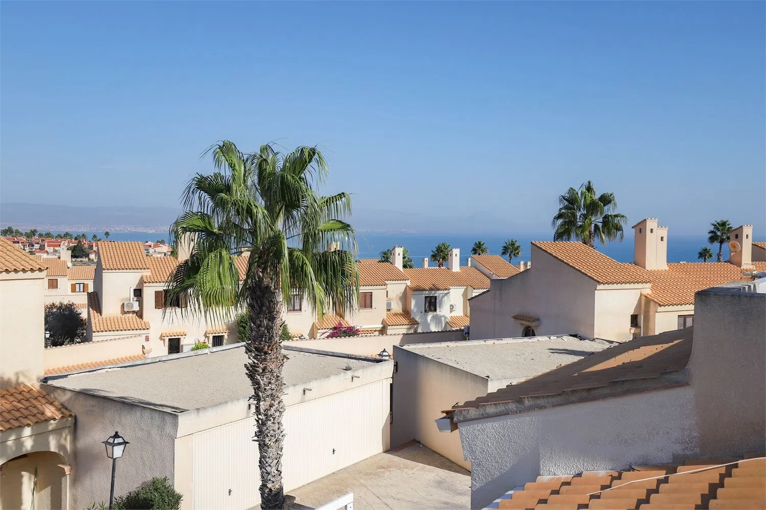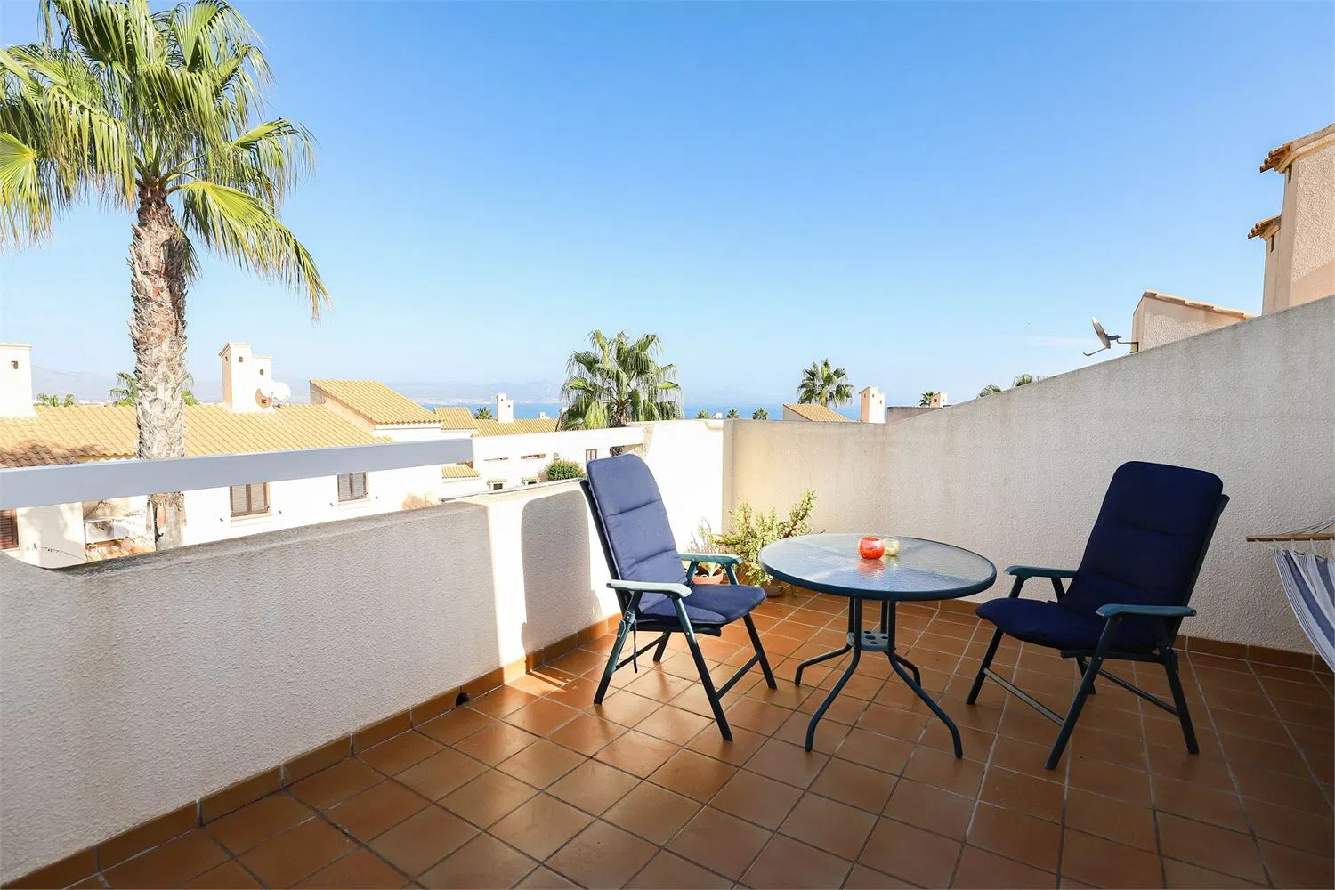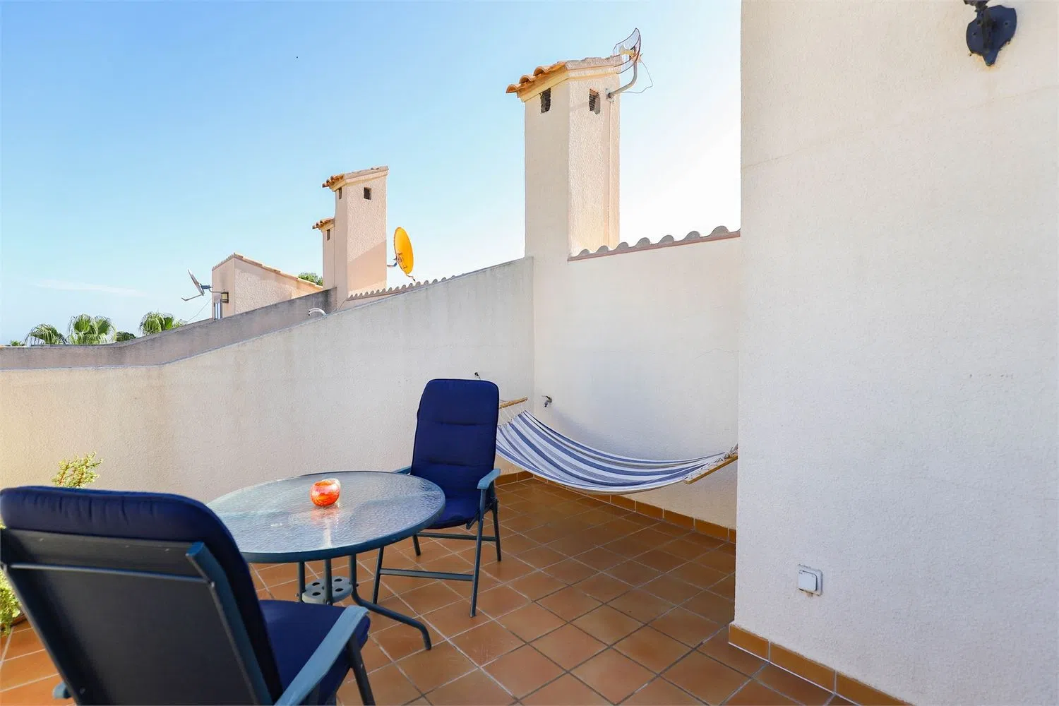 Современная ванная комната полностью облицована плиткой, с двойной раковиной, местом для хранения, ванной и туалетом. Лестница ведет к солярной террасе, которая предлагает достаточно пространства для лежаков или зон отдыха. Отсюда открываются потрясающие виды на море, охватывающие более 180 градусов.