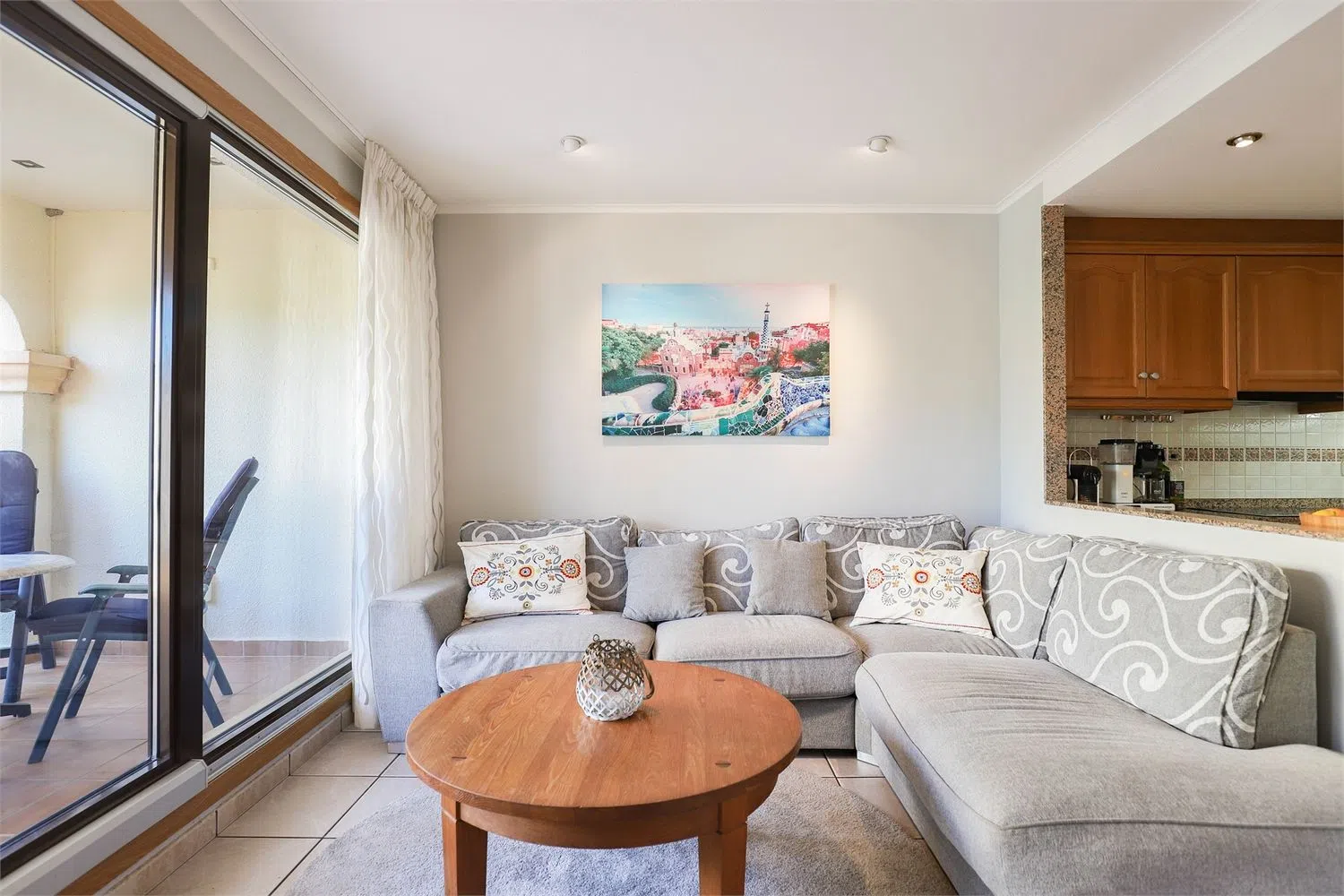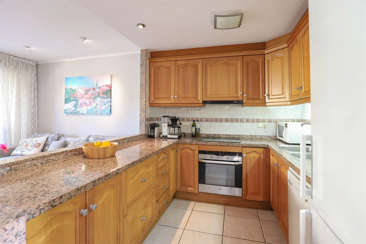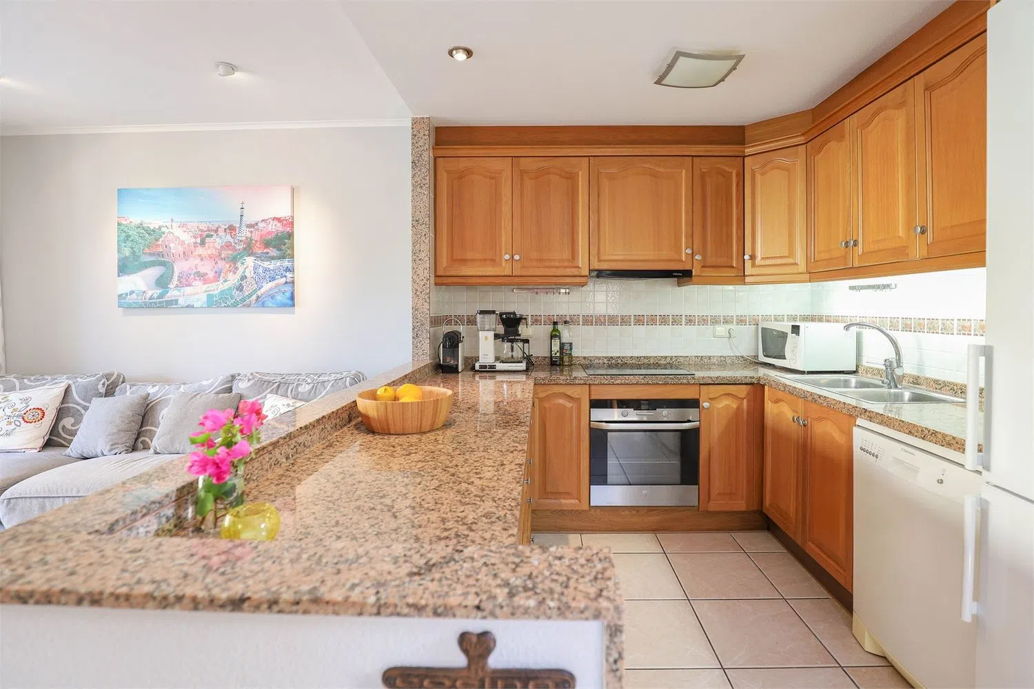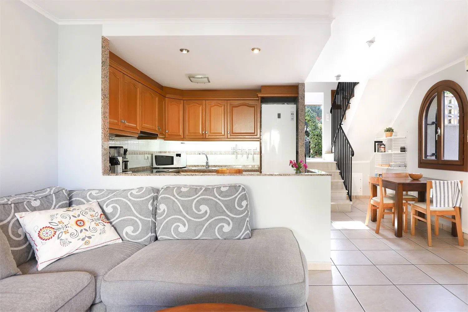На полэтажа ниже расположена кухня, просторная и открытая для гостиной, разделенная практичным баром. Она полностью оборудована шкафами, холодильником, печью, микроволновой печью, посудомоечной машиной и варочной панелью. Гостиная светлая и просторная, с местом для большого дивана, обеденного стола и тумбы под телевизор, с выходом на террасу через большие стеклянные двери.